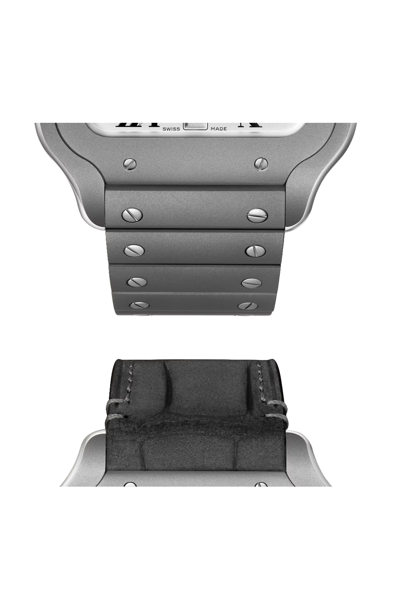 Orologio Santos de Cartier, modello grande. Movimento a carica automatica. Cassa 39,8 mm in titanio, cinturino in titanio e secondo cinturino in pelle di alligatore con chiusura pieghevole entrambi con sistema QuickSwitch. Impermeabilità 10 ATM.