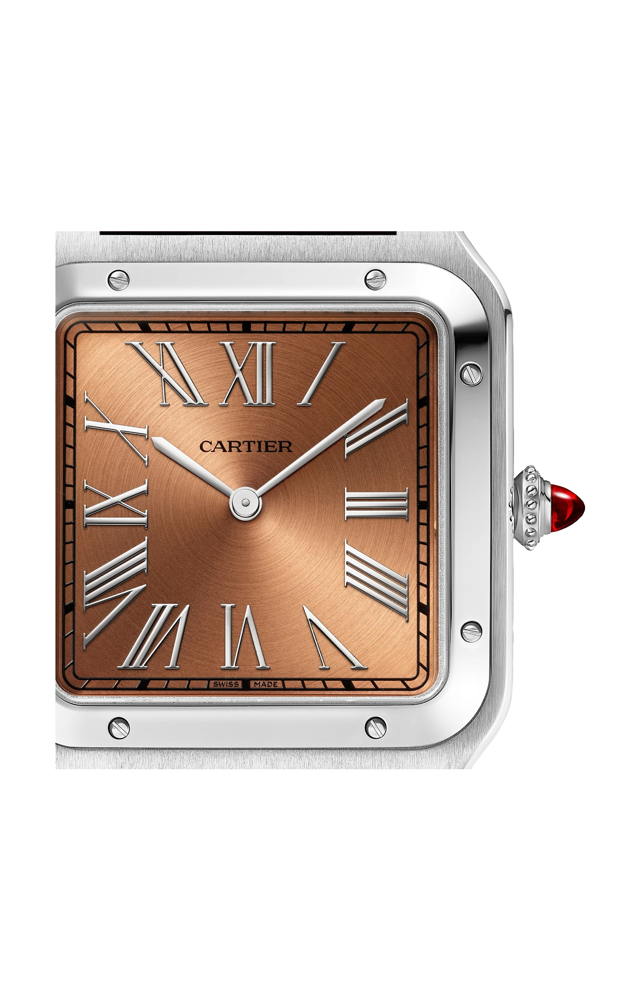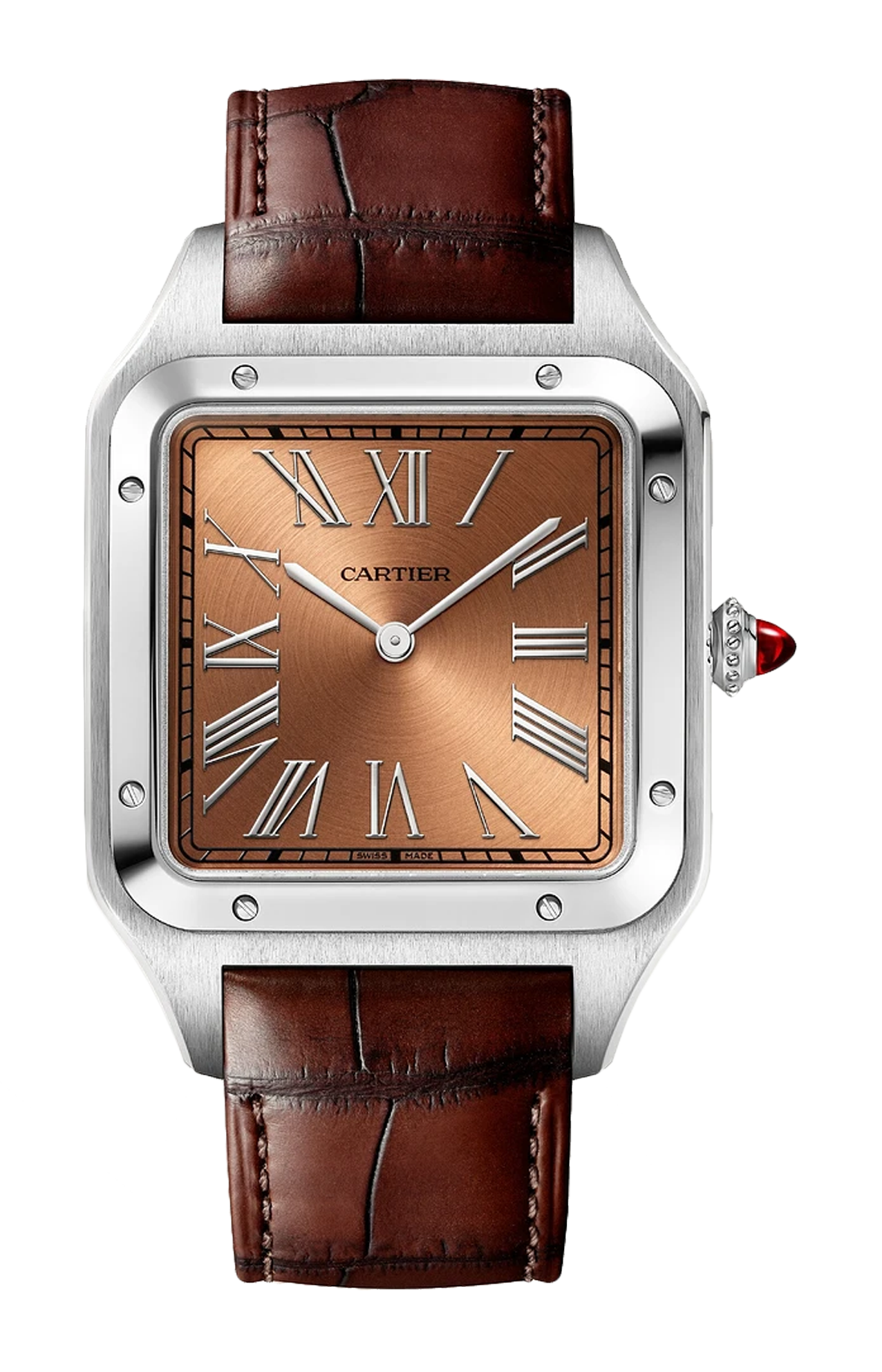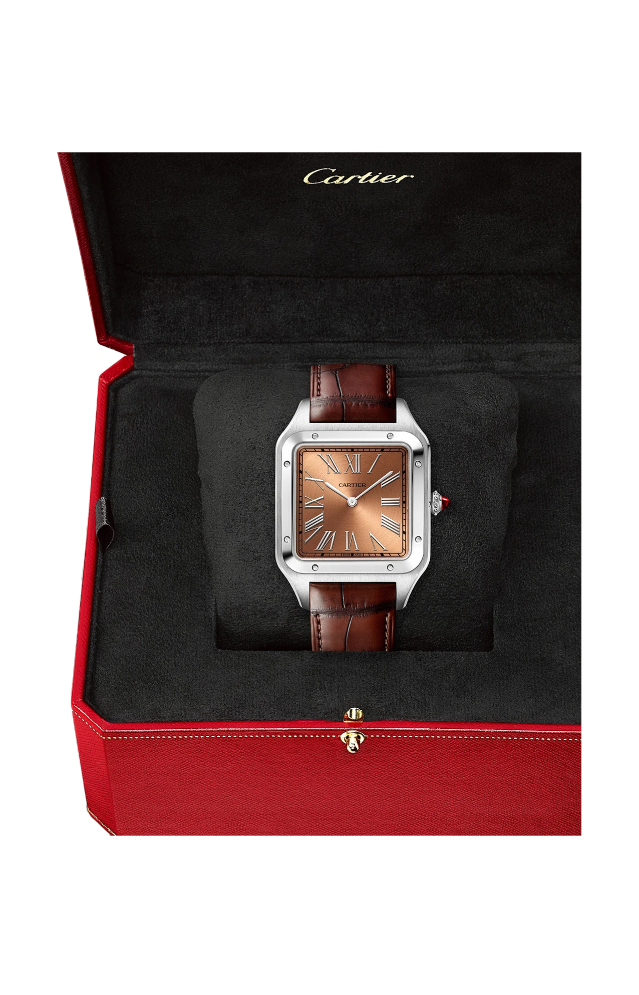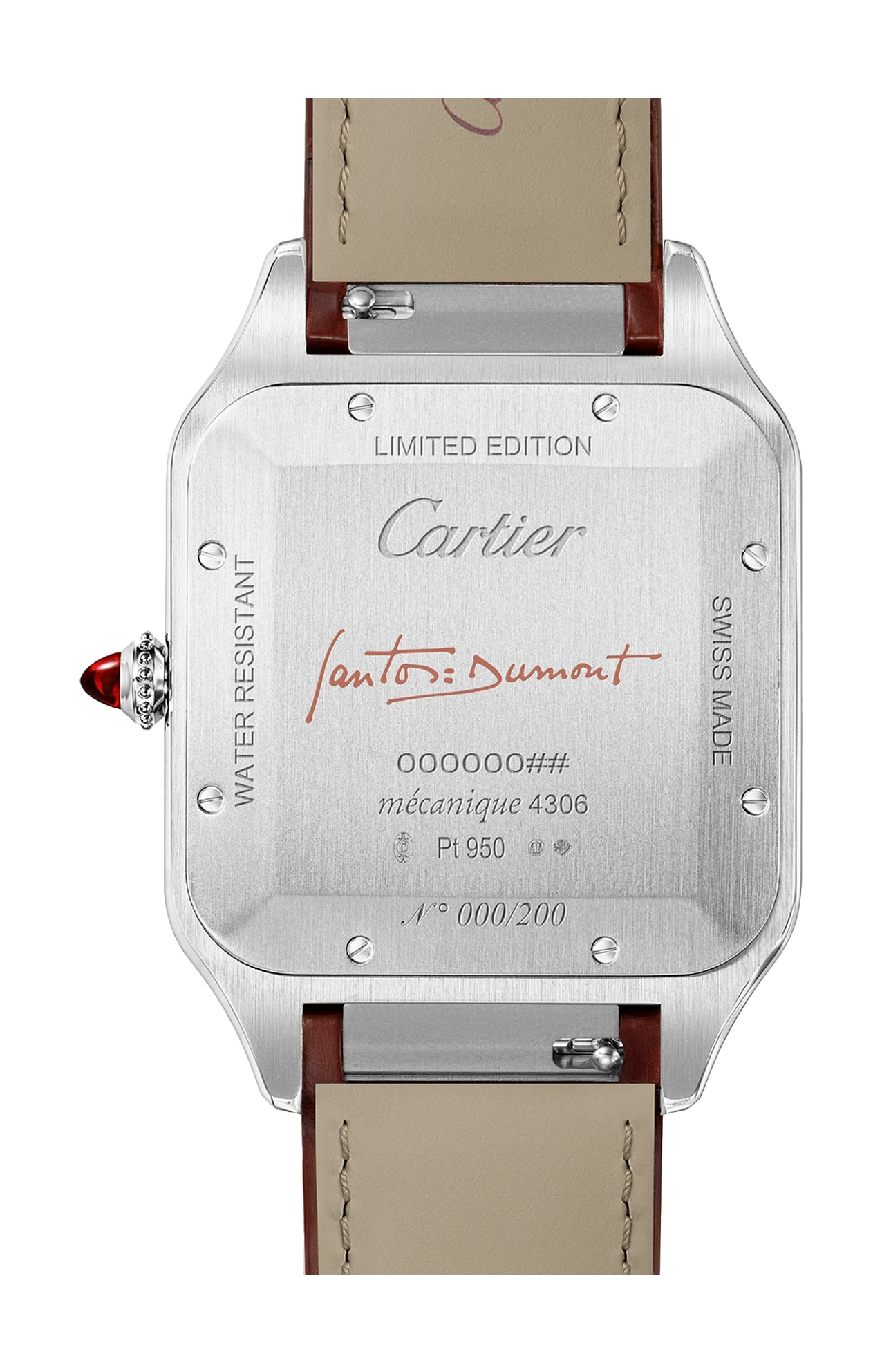 Orologio Santos-Dumont, modello Extra-Large, movimento meccanico a carica manuale 430 MC. Cassa e lunetta in paltino 950/1000, corona perlata in platino 950/1000 ornata di un rubino rosso cabochon, quadrante marrone satinato, cifre romane, lancette a forma di gladio in acciaio rodiato, vetro zaffiro. Fondello dell’orologio con incisione raffigurante la firma autografa di Alberto Santos-Dumont. Cinturino in alligatore marrone con fibbia ardiglione in platino 950/1000. Dimensioni della cassa 33,9 x 46,6 mm, spessore 7,5 mm. Impermeabile fino a 30 metri. Edizione limitata a 200 pezzi.