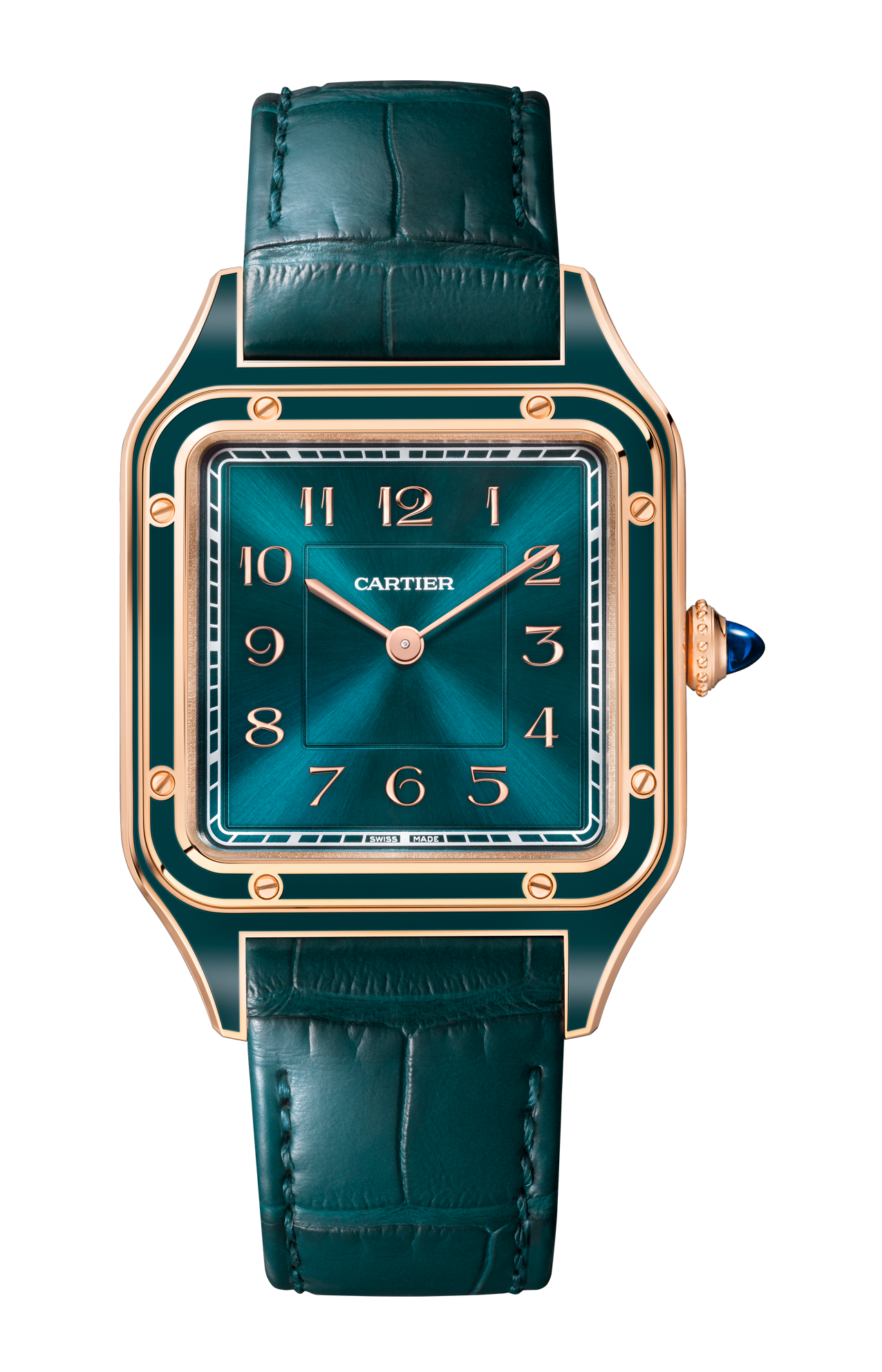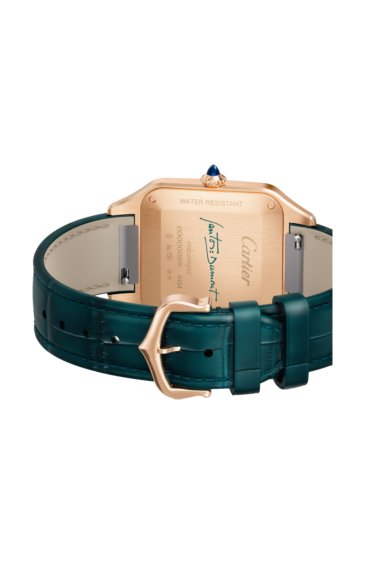 Orologio Santos-Dumont, modello grande, movimento meccanico a carica manuale 430 MC. Cassa in oro rosa 750/1000, corona circolare granulata ornata da uno zaffiro blu cabochon, quadrante blu pavone laccato a raggi di sole con cifre arabe, lancette a forma di gladio in acciaio placcato oro lucido, vetro zaffiro, fondello inciso con la firma autografa di Alberto Santos-Dumont. Cinturino d’alligatore blu, fibbia ardiglione in oro rosa 750/1000. Dimensioni della cassa 43,5 x 31,4 mm, spessore 7,3 mm. Impermeabile fino a 30 metri.