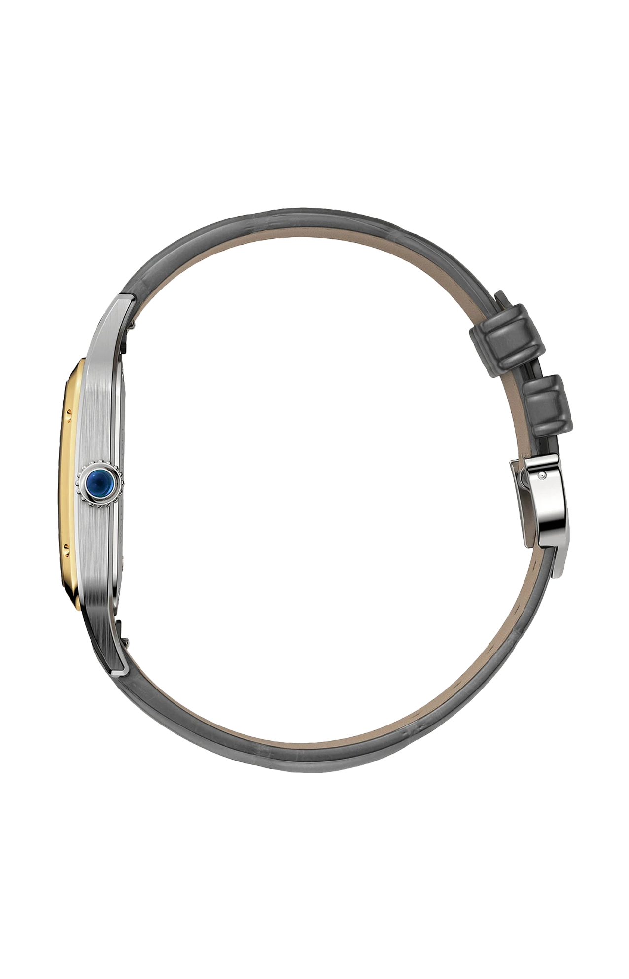 Orologio Santos-Dumont, modello grande, movimento al quarzo. Cassa in acciaio, lunetta in oro rosa 750/1000, corona perlata ornata di uno spinello sintetico blu cabochon, quadrante grigio satinato effetto soleil, numeri romani dorati, lancette a forma di gladio d’acciaio lucido dorato, vetro zaffiro, cinturino d’alligatore grigio, fibbia ardiglione in acciaio. Dimensioni della cassa 43,5 x 31,4 mm, spessore 7,3 mm. Impermeabile fino a 30 metri.