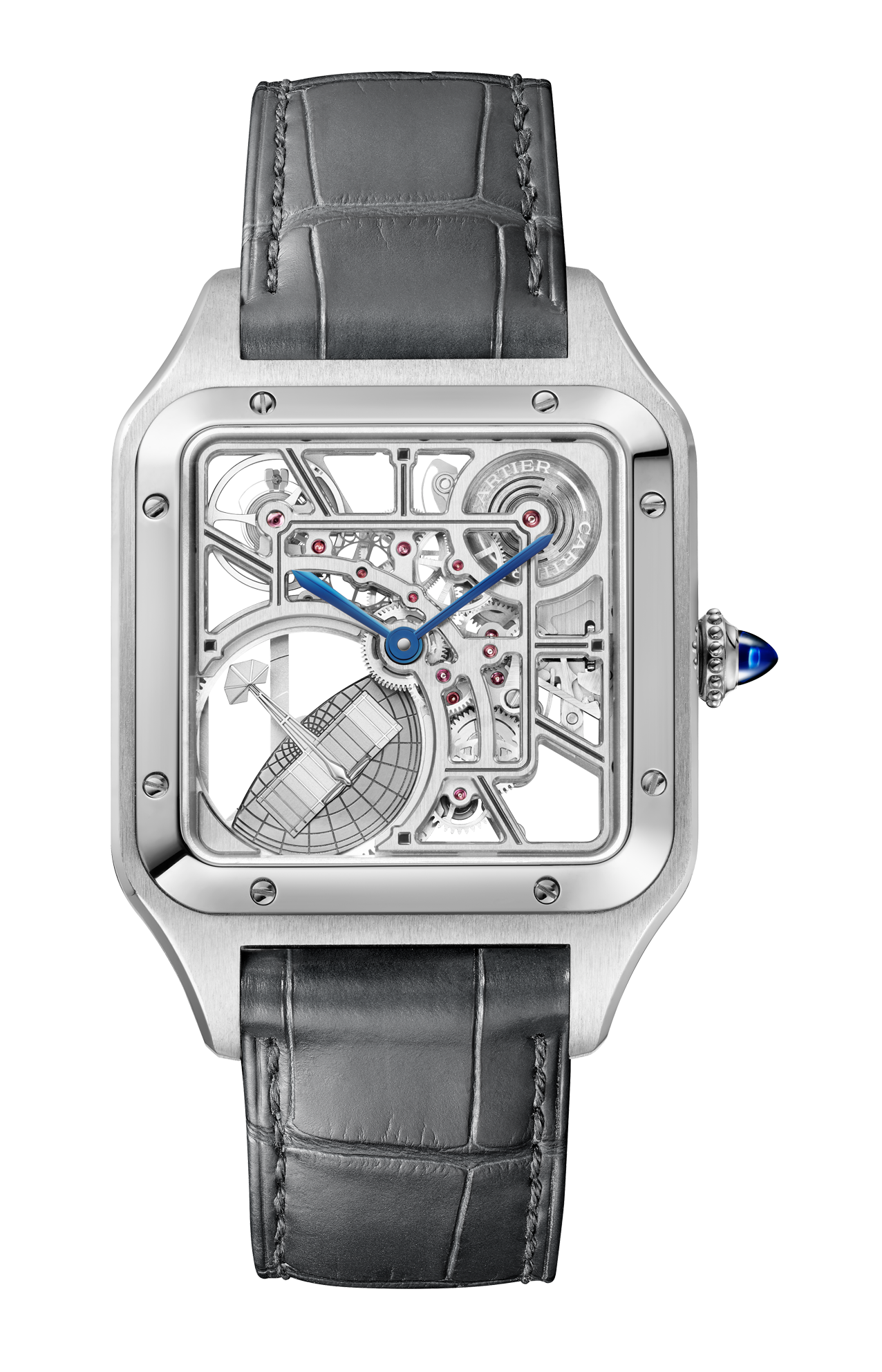 Orologio Santos-Dumont scheletrato micro-rotore, modello grande, 31 mm, movimento meccanico a carica automatica 9629 MC. Cassa in acciaio, lancette a forma di gladio d’acciaio azzurrato lucido, vetro e fondocassa in vetro zaffiro, ponti laccati grigi. Cinturino d’alligatore grigio e cinturino d’alligatore blu, fibbia ardiglione in acciaio. Dimensioni 23,2 mm, spessore 4,4 mm, bilanciere a 25.200 alternanze/ora, riserva di carica di circa 46 ore. Dimensioni della cassa 31 mm, spessore: 8 mm. Impermeabile fino a 30 metri.