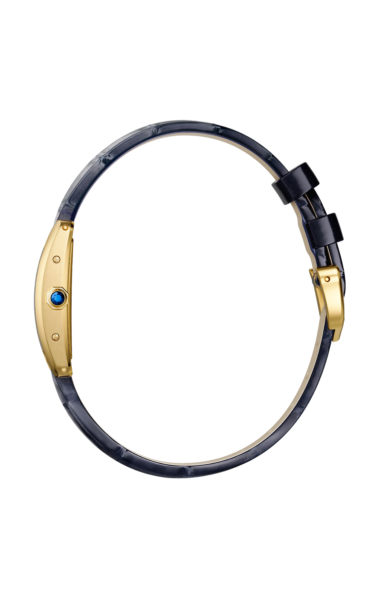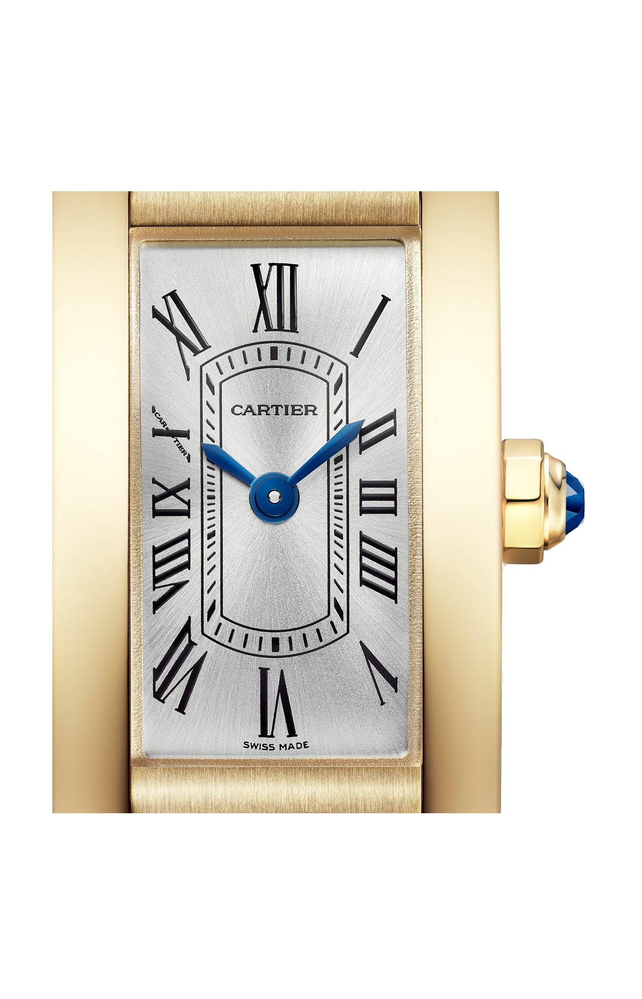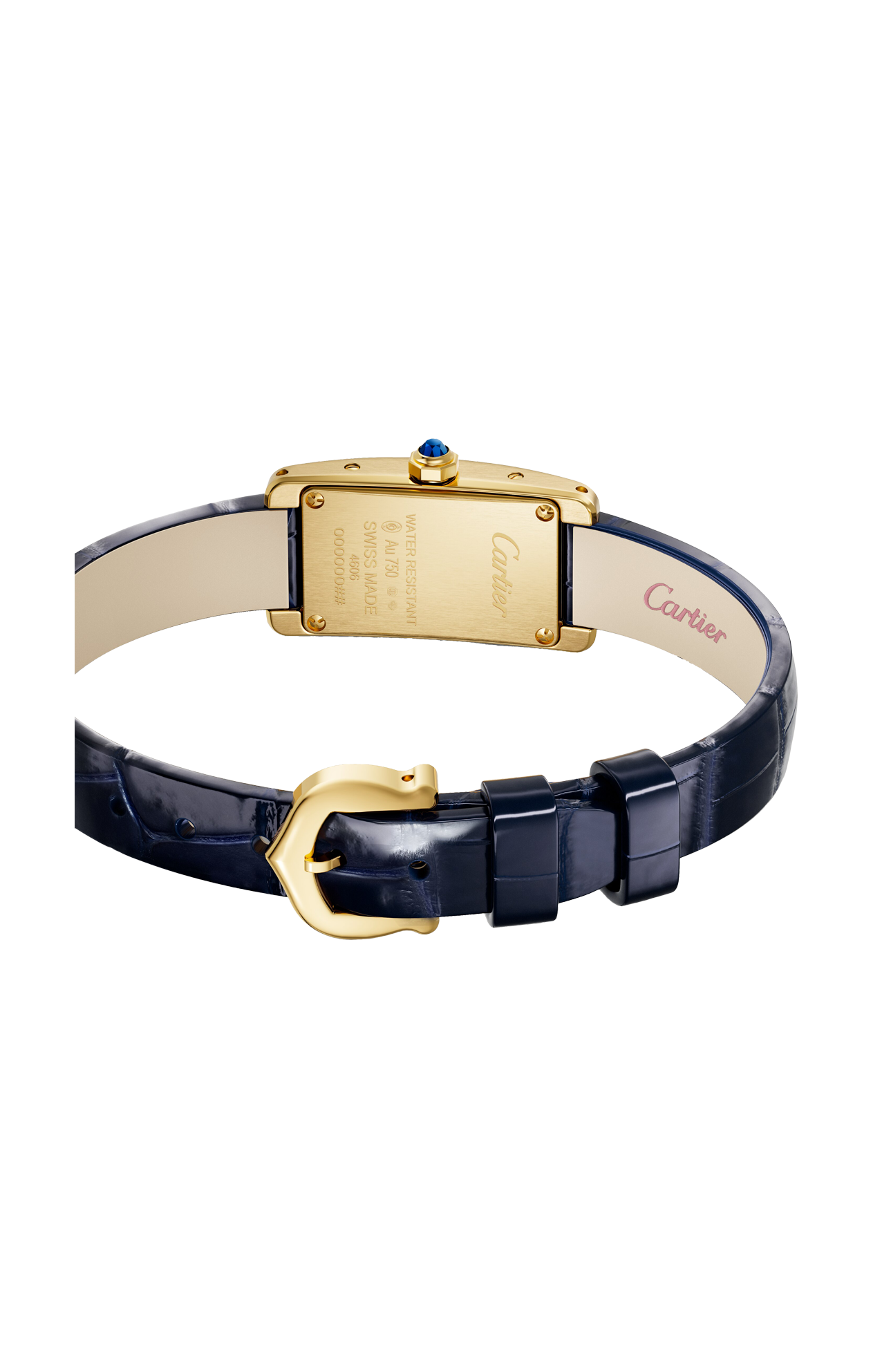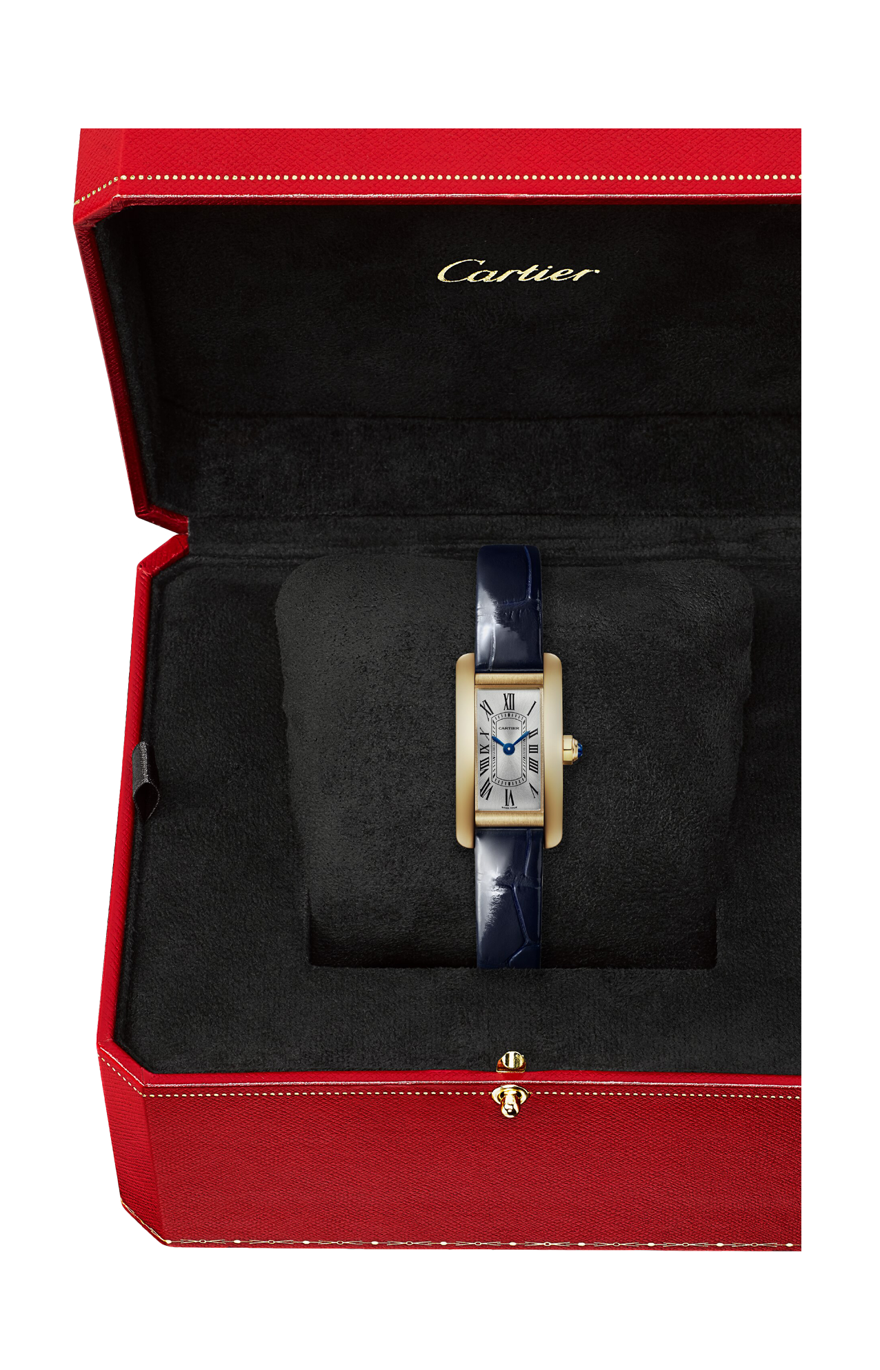 Orologio Tank Américain, modello mini, movimento a quarzo. Cassa in oro giallo 750/1000, corona poligonale ornata di uno zaffiro sfaccettato. Quadrante argentato satinato effetto soleil, lancette a forma di gladio in acciaio azzurrato, vetro zaffiro. Cinturino in alligatore blu navy lucido con fibbia ardiglione in oro giallo 750/1000. Dimensioni della cassa 28 mm x 15,2 mm, spessore 6,5 mm. Impermeabile fino a 30 metri.