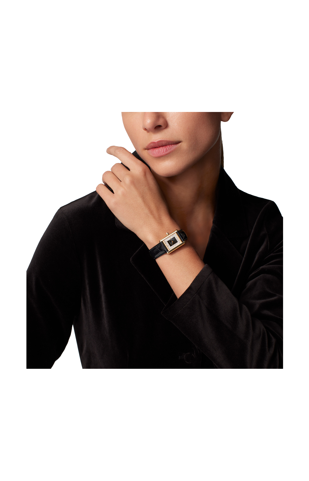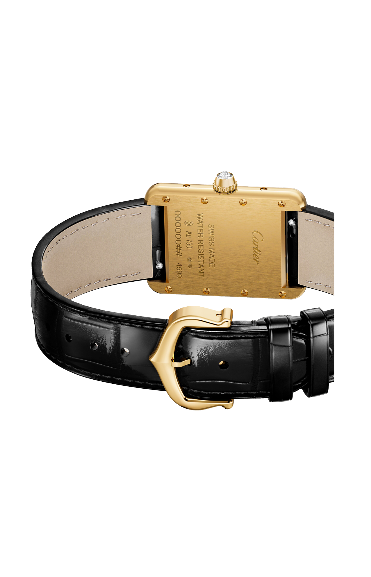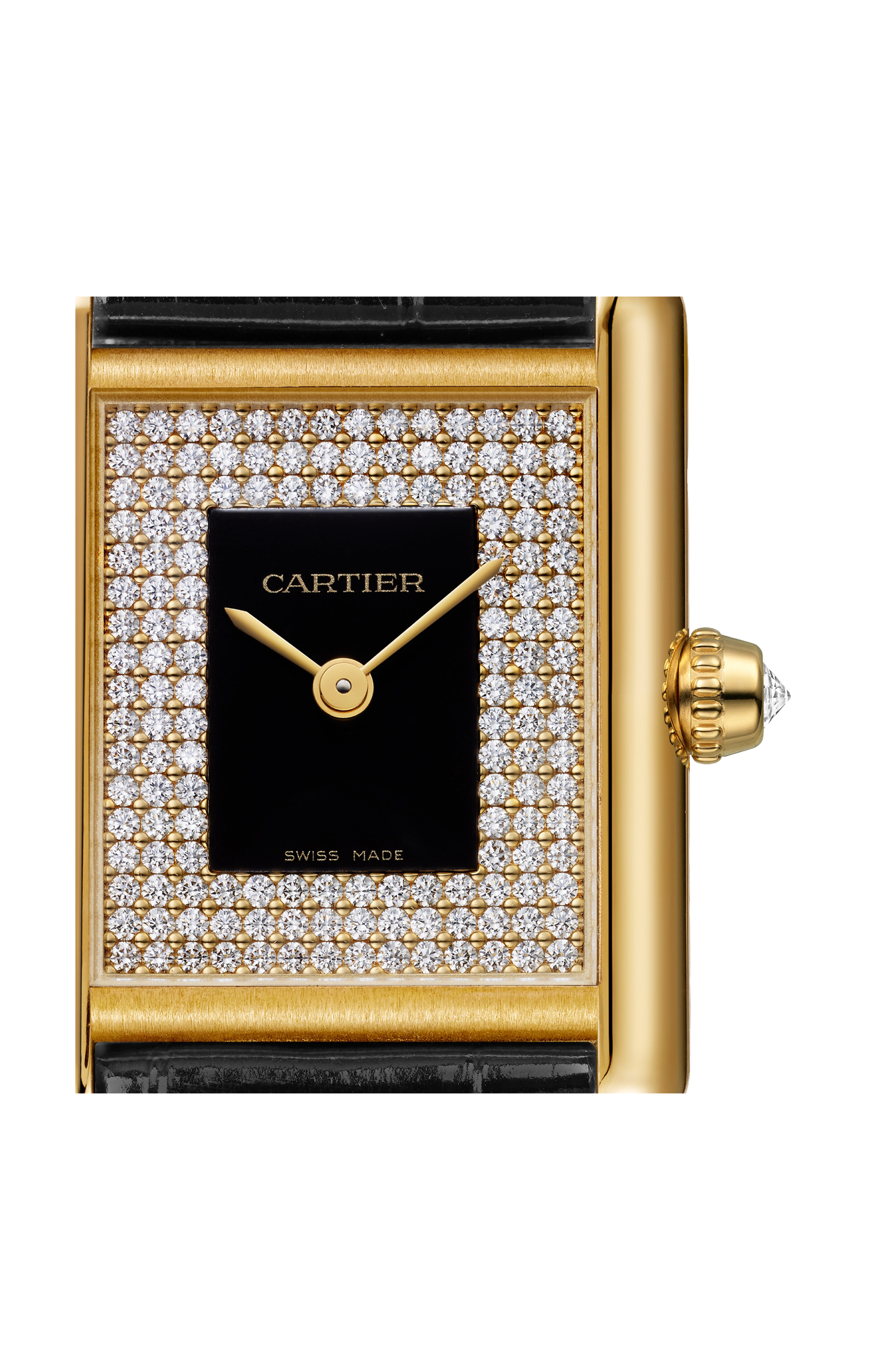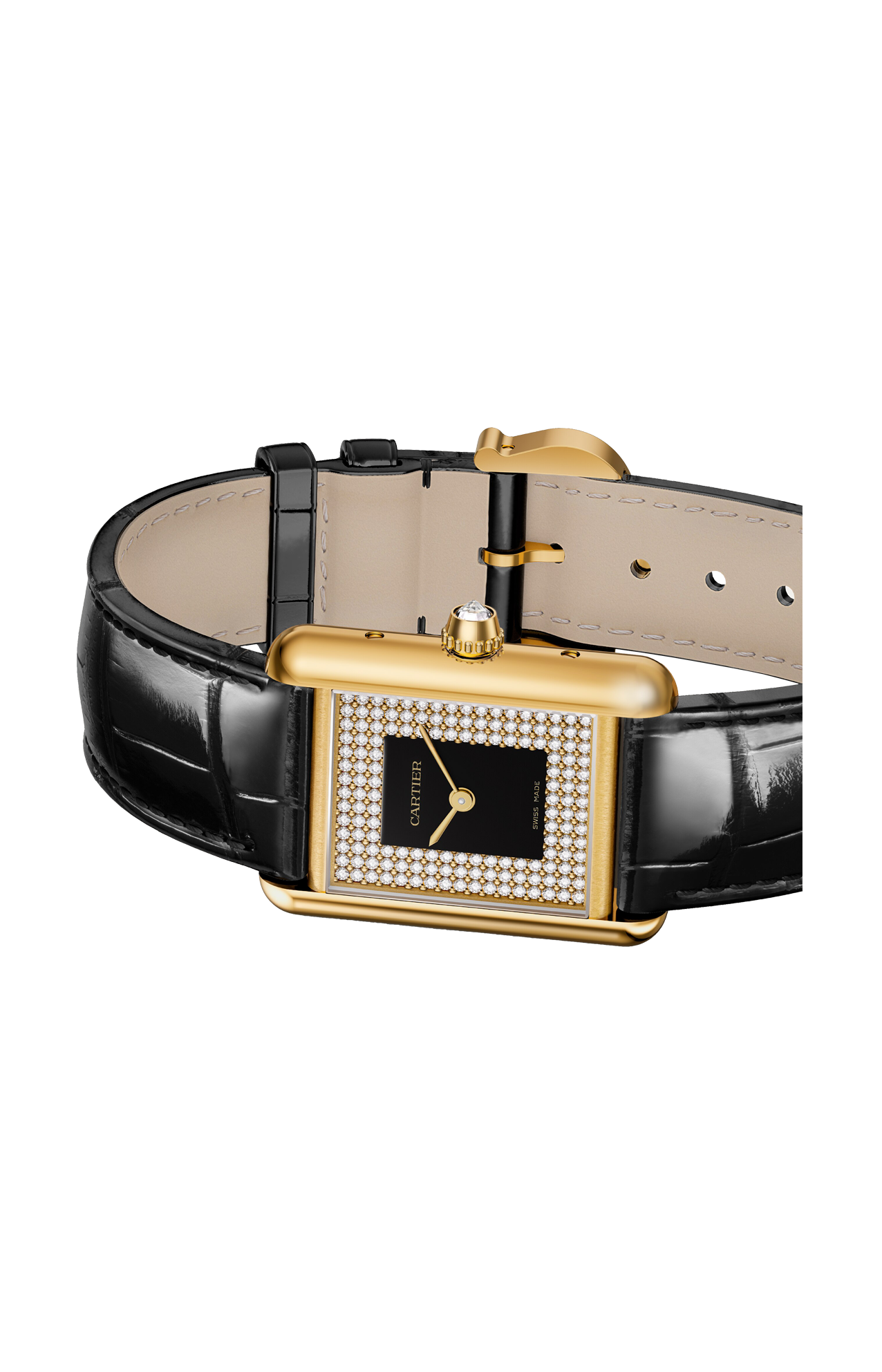 Orologio Tank Louis Cartier, modello piccolo, movimento al quarzo. Cassa in oro giallo 750/1000, corona perlata ornata di un diamante, quadrante lacca nera con 151 diamanti taglio brillante (0,71 carati), lancette a forma di gladio in acciaio finitura oro, vetro minerale, cinturino in alligatore nero semi-opaco, fibbia ardiglione in oro giallo 750/1000. Dimensioni della cassa 29,5 mm x 22 mm, spessore 6,35 mm. Impermeabile fino a 30 metri.