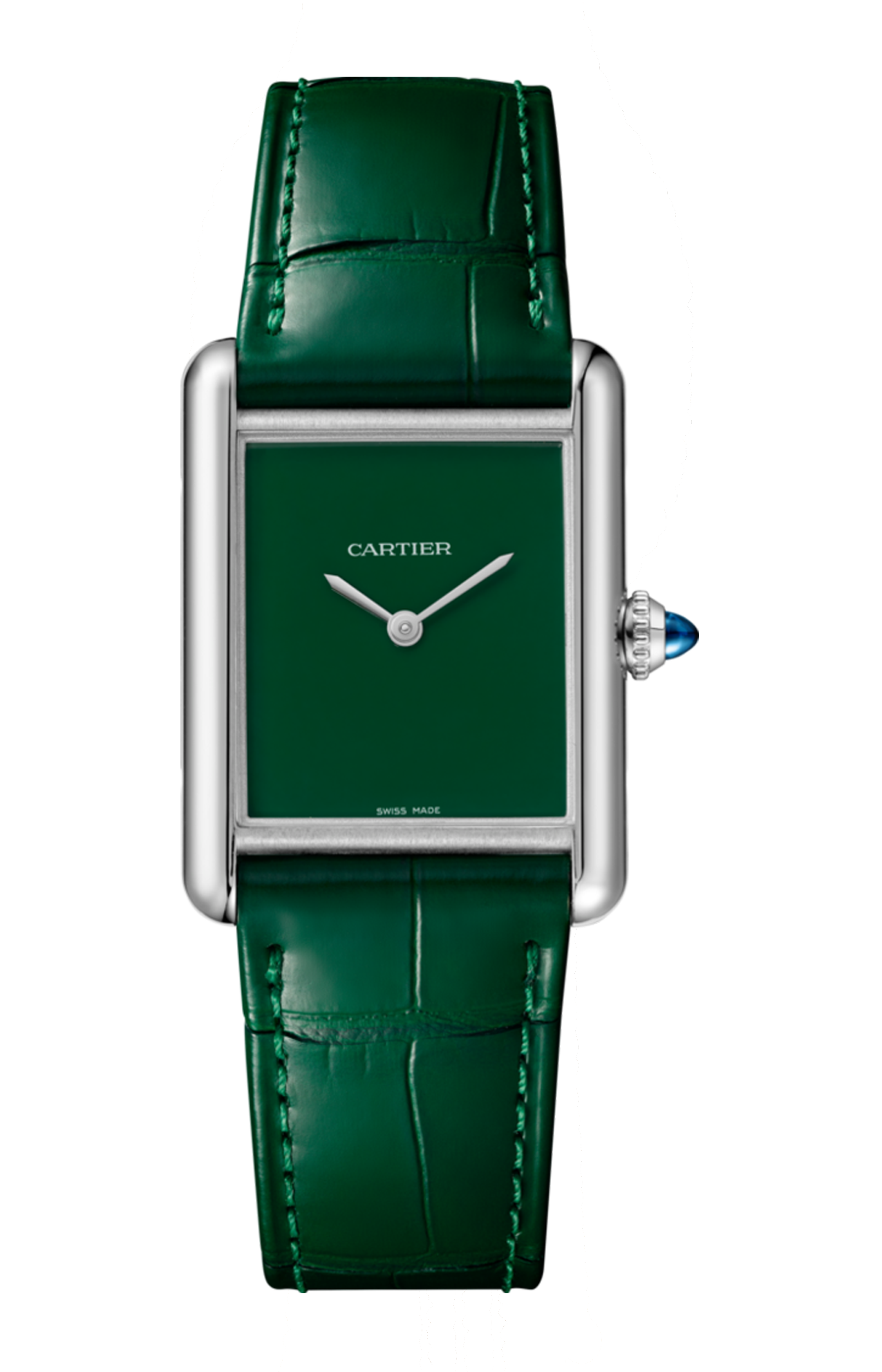 Orologio Tank Must, modello grande, movimento al quarzo. Cassa in acciaio, corona perlata ornata di uno spinello sintetico cabochon, quadrante laccato verde, lancette a forma di gladio in acciaio lucido, cinturino d’alligatore verde, fibbia ardiglione in acciaio. Dimensioni della cassa 33,7 x 25,5 mm, spessore 6,6 mm. Impermeabile fino a 30 metri.