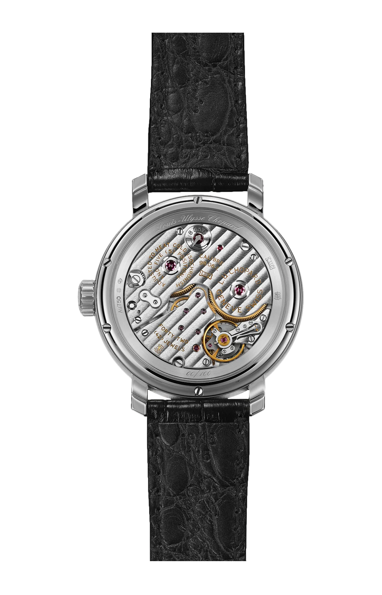 Il movimento a ore saltanti L.U.C 98.06-L, una prodezza tecnica presentata per la prima volta in occasione del 25° anniversario di Chopard Manufacture, alimenta il nuovo segnatempo L.U.C Quattro Spirit 25 in edizione limitata di 100 esemplari. I quattro bariletti dell’esclusiva tecnologia Chopard Quattro, che permettono una riserva di carica di otto giorni, fanno di questo modello tecnicamente ricercato uno dei rari orologi a ore saltanti dotato di una tale autonomia. La cassa di 40 millimetri di diametro in oro etico bianco 18 carati, dalle linee essenziali caratteristiche della collezione L.U.C, accoglie un quadrante nero in smalto grand feu realizzato con un processo artigianale dallo smaltatore di Chopard Manufacture. Dal movimento al quadrante, questo straordinario segnatempo è la vetrina delle migliori competenze dagli artigiani artisti che lavorano all’interno dei laboratori della maison, che garantiscono il massimo livello di finiture riconosciute dal prestigioso punzone di Ginevra.