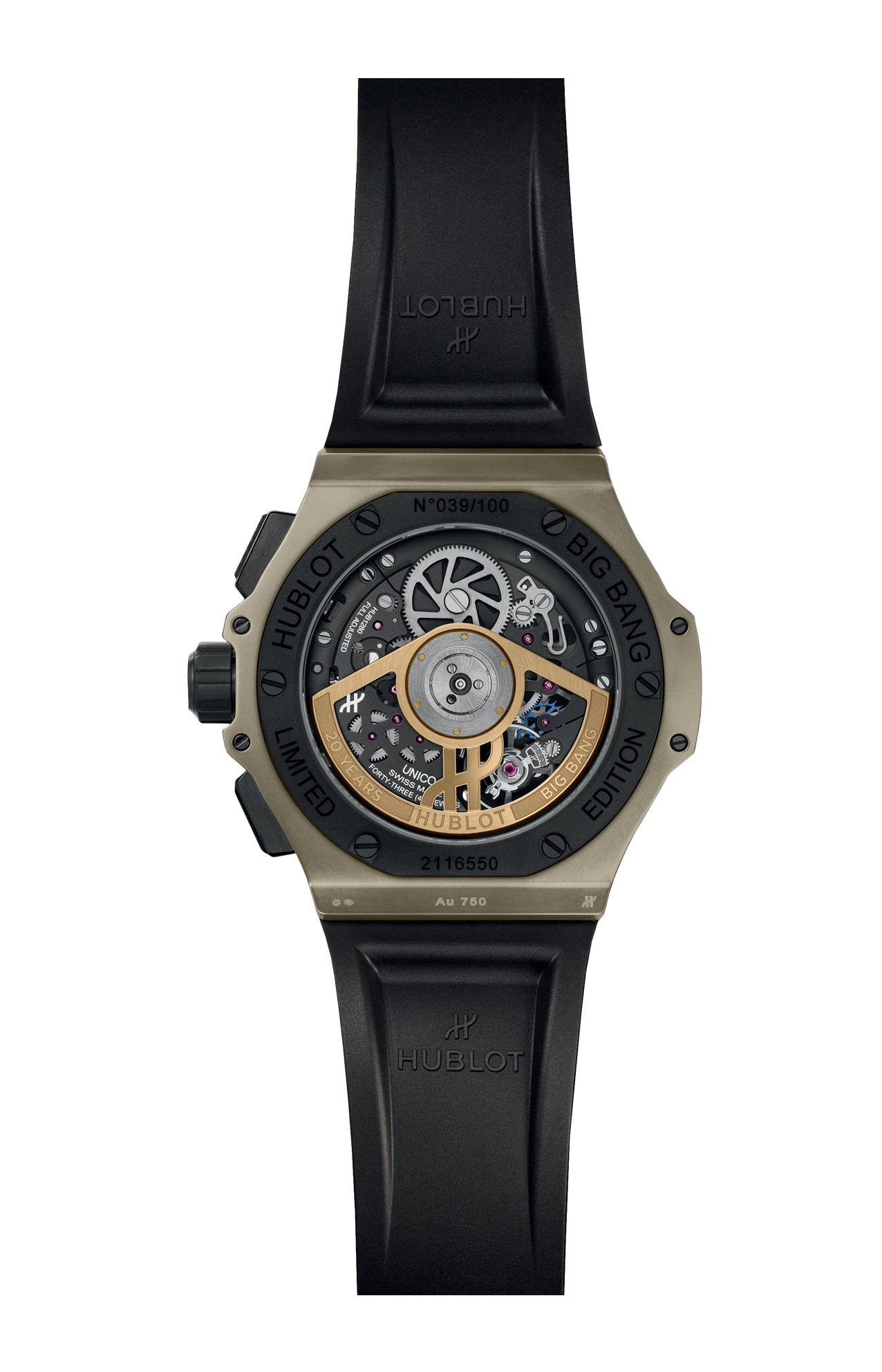 I 100 esemplari del Full Magic Gold confermano l’esclusività di questo modello. Realizzato in Magic Gold 18K, una lega rivoluzionaria e resistente ai graffi, questa edizione limitata incarna perfettamente lo spirito Big Bang, arricchita da dettagli unici della collezione anniversario. Ogni elemento riflette la maestria tecnica di Hublot, utilizzando l’innovazione dei materiali per creare un’estetica potente e raffinata.