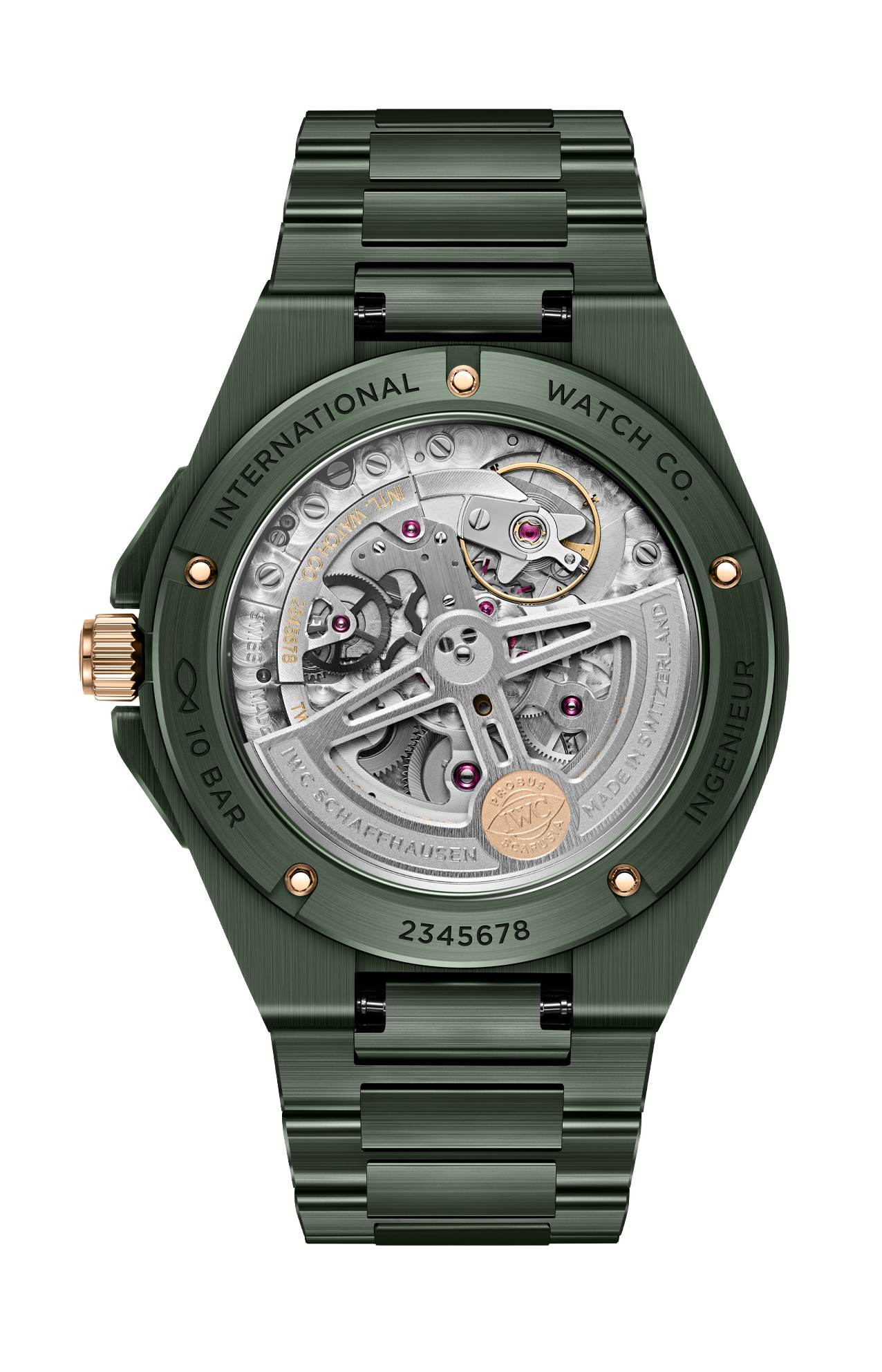 L’Ingenieur Automatic 42 combina il design con bracciale integrato derivato da Gérald Genta a una sorprendente interpretazione in ceramica verde oliva scuro.