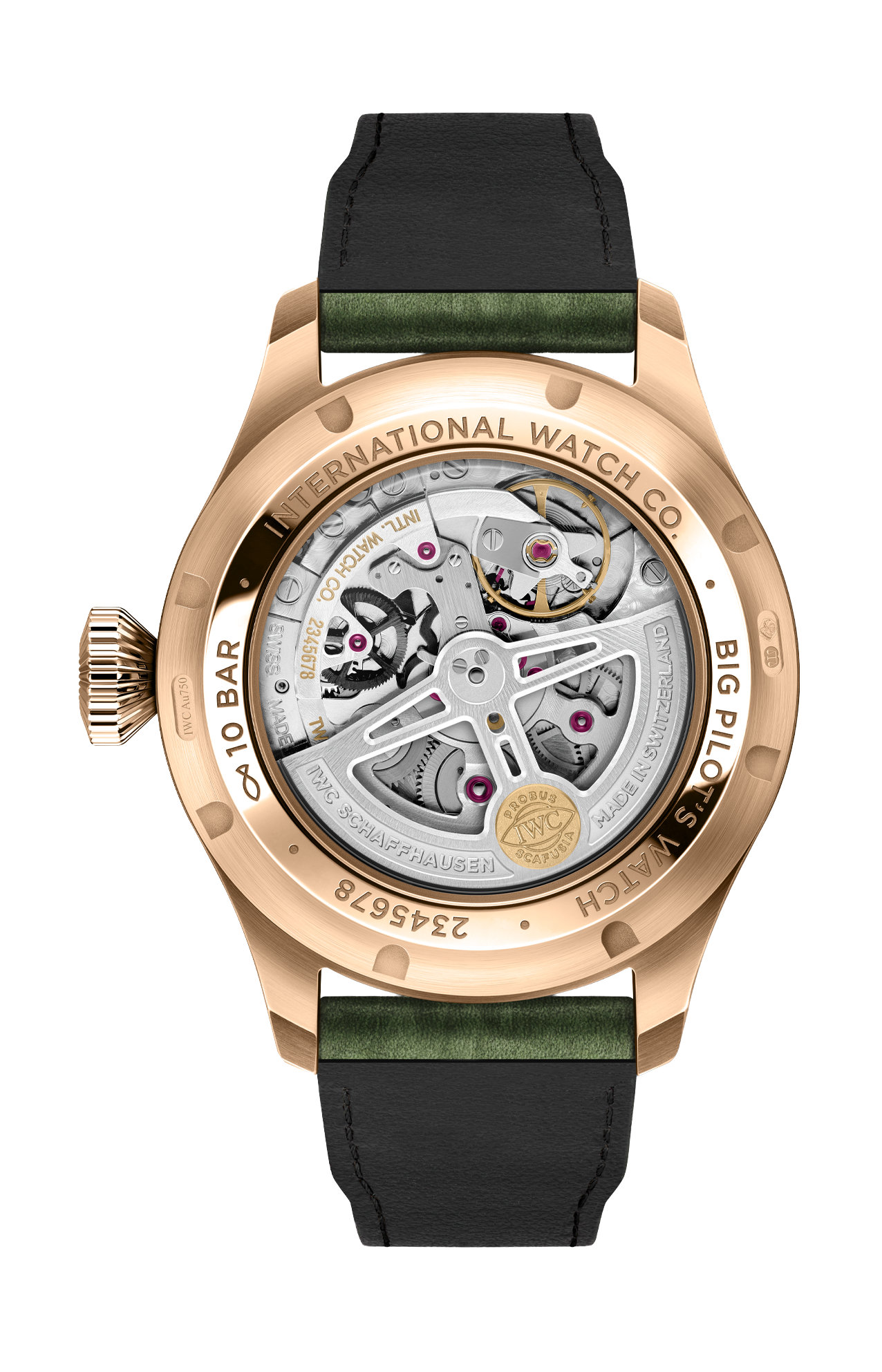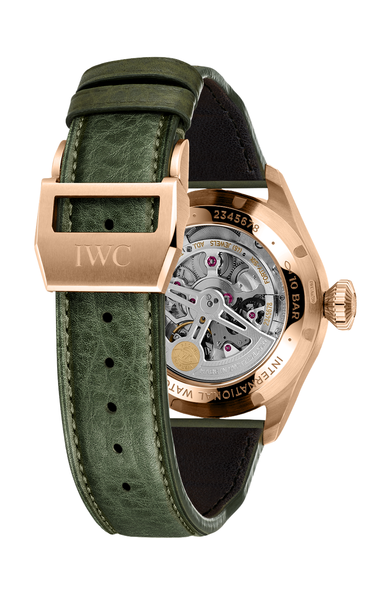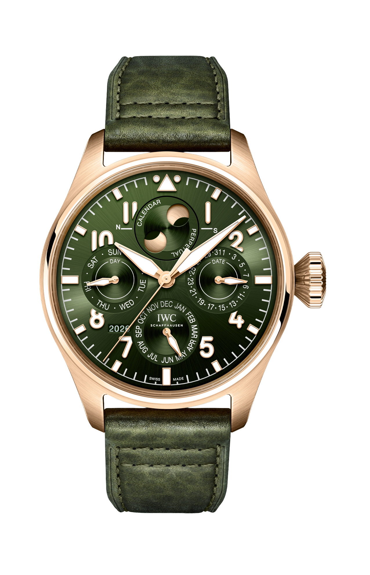 Il Big Pilot’s Watch Perpetual Calendar ProSet abbina una cassa e una corona in oro rosso 18 carati a un quadrante verde oliva con finitura soleil. Il Perpetual Calendar ProSet può essere regolato sia in avanti sia indietro tramite una singola posizione della corona, rendendo le correzioni del calendario semplici e intuitive come l’impostazione dell’ora.