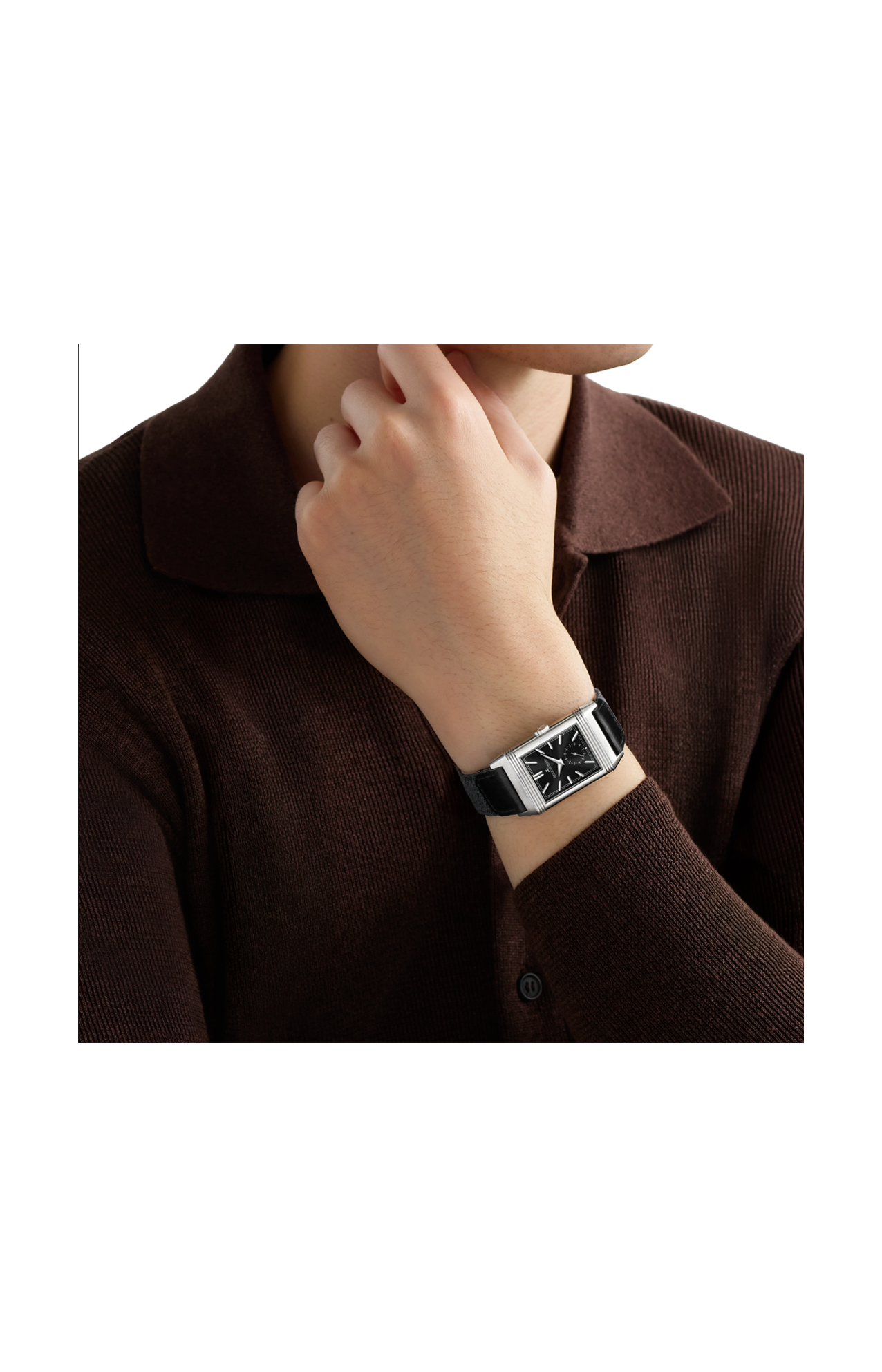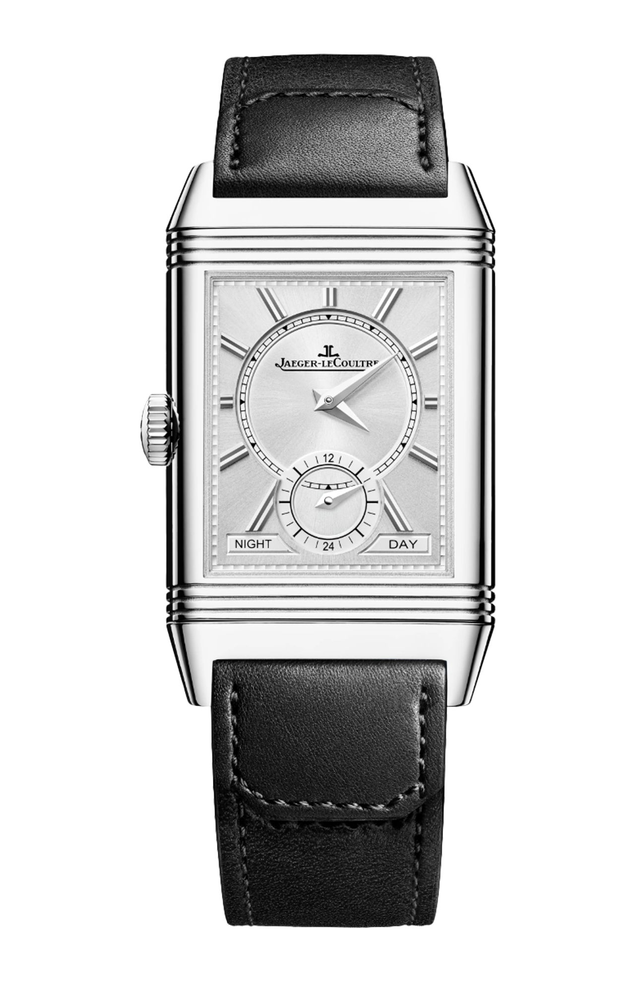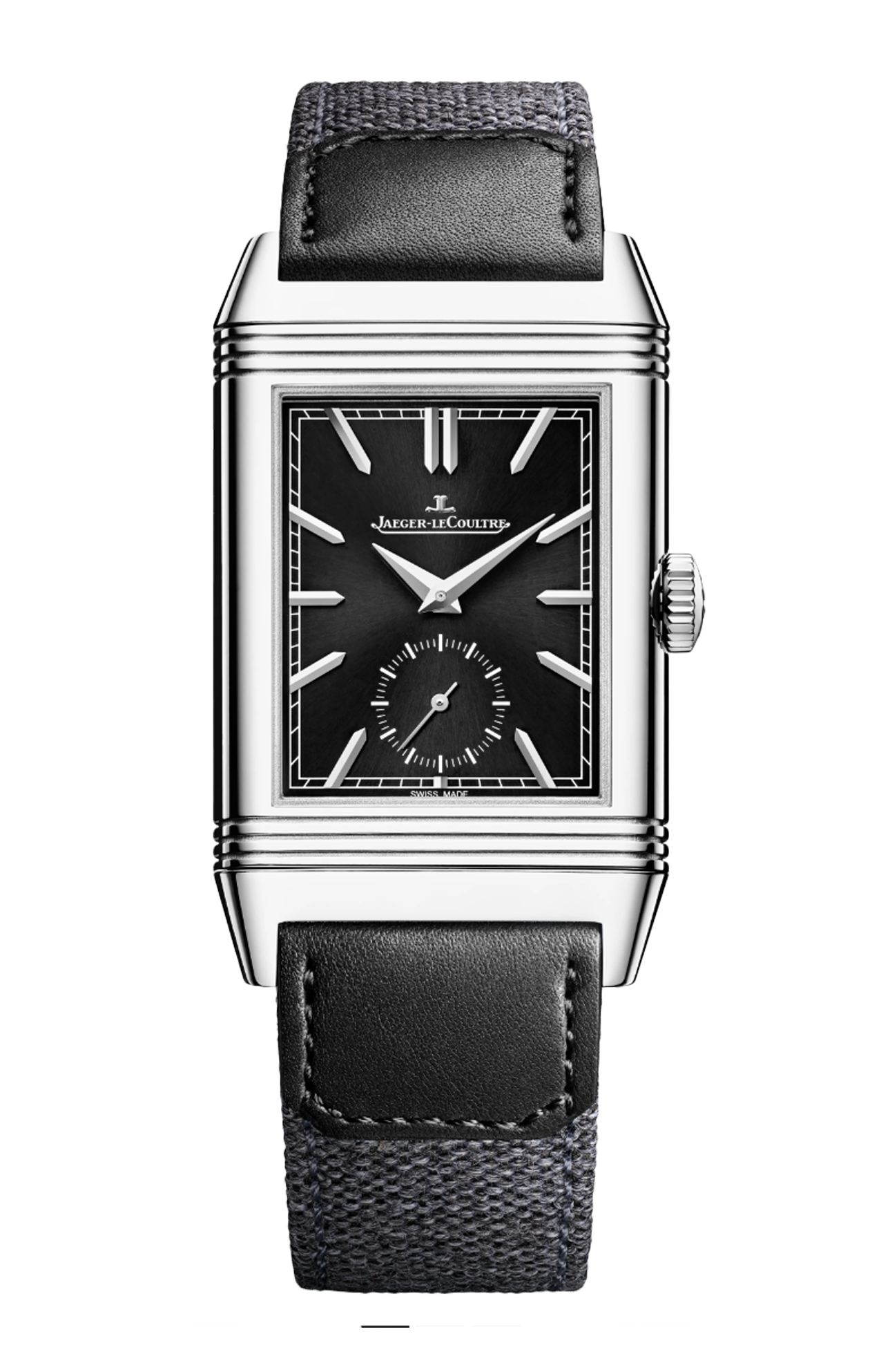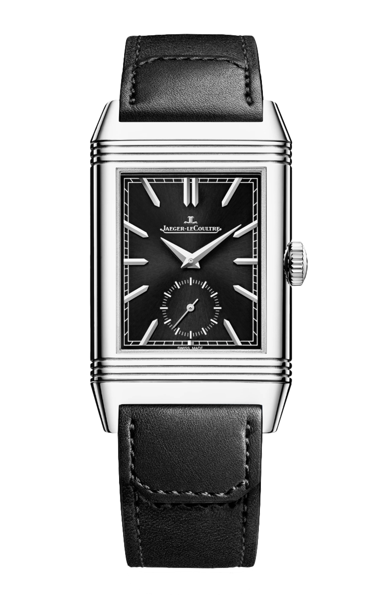 Con il suo quadrante nero, l’orologio Reverso Tribute Duoface Small Seconds fa rivivere i quadranti colorati creati dalla maison a partire dal 1931, che all’epoca rappresentavano una scelta estetica audace. In questa versione in acciaio, questo ritorno è il segno di una modernità affermata. Sul fronte, gli elementi emblematici del Reverso – scanalature, indici applicati, lancette dauphine, piccoli secondi – di colore argento risaltano particolarmente sul quadrante nero spazzolato a raggi di sole. Sul retro, la regolazione del secondo fuso orario avviene grazie a un piccolo pulsante posto sul lato della cassa una volta che questa è stata capovolta. L’orologio è dotato di due bracciali disegnati da Casa Fagliano: il primo in pelle nera, il secondo nello stesso colore, in pelle e tela.