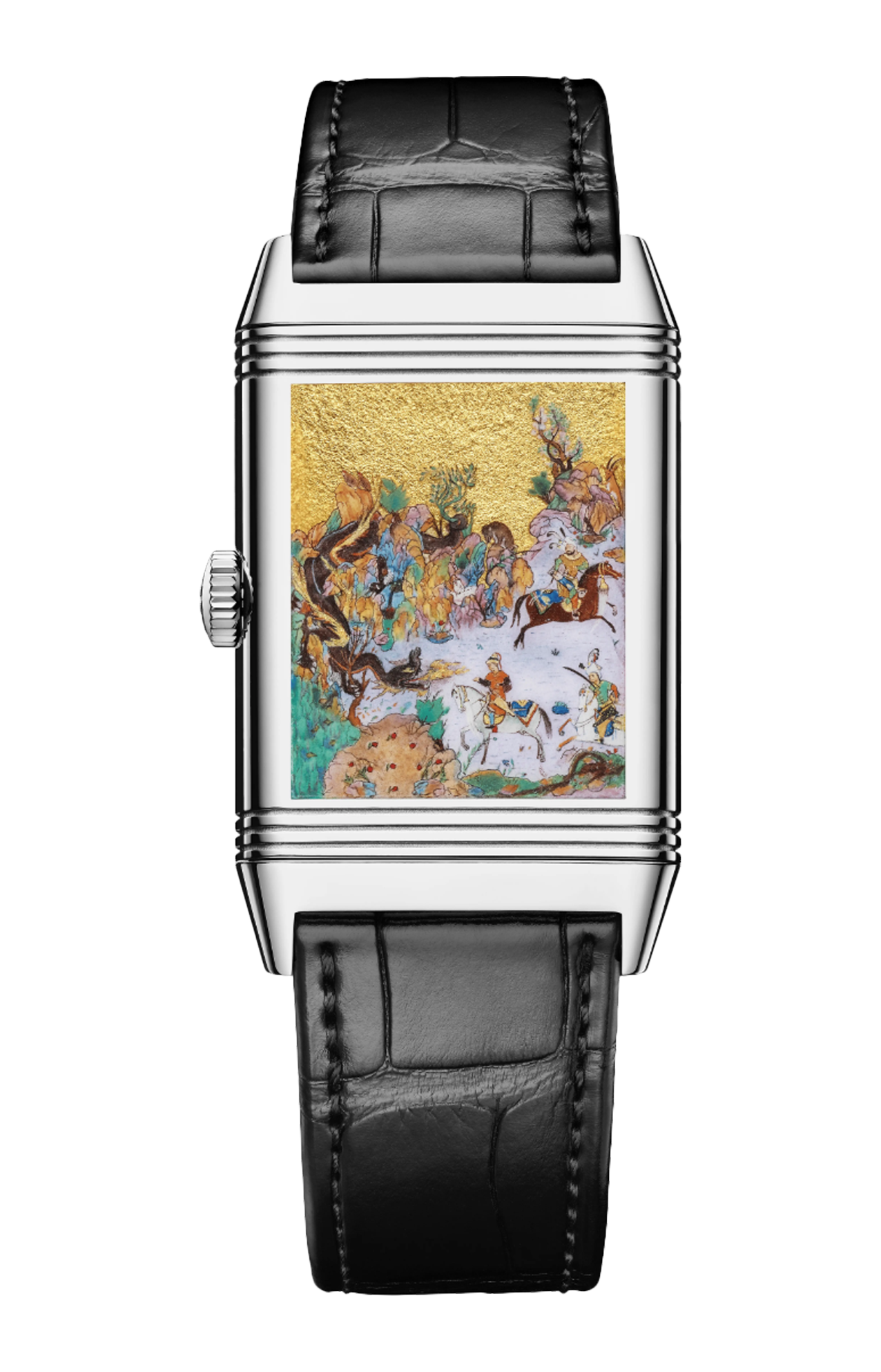 Ispirato ai racconti della letteratura persiana illustrata da cui prende il nome, l’orologio reverso tribute enamel “Shahnameh” si rivela originale e misterioso. Realizzati nel nostro atelier dei mestieri rari™, i due quadranti dell’orologio sono il risultato di un savoir-faire che combina diverse tecniche. Sul fronte, il quadrante a spina di pesce guilloché a mano è smaltato grand feu in un colore blu che richiama alcuni elementi della scena epica sul retro, tratta dal libro dei re (“Shahnameh” in persiano). Sotto un cielo smaltato “Paillonné” in oro (24 carati, 999/1000), tre giovani cavalieri vengono messi alla prova dal padre, trasformato in drago. Sul fronte, la smaltatura richiede 5 strati e 7 passaggi in forno. Sul retro, la riproduzione in miniatura su smalto richiede 100 ore di lavoro e l’uso di una dozzina di colori.