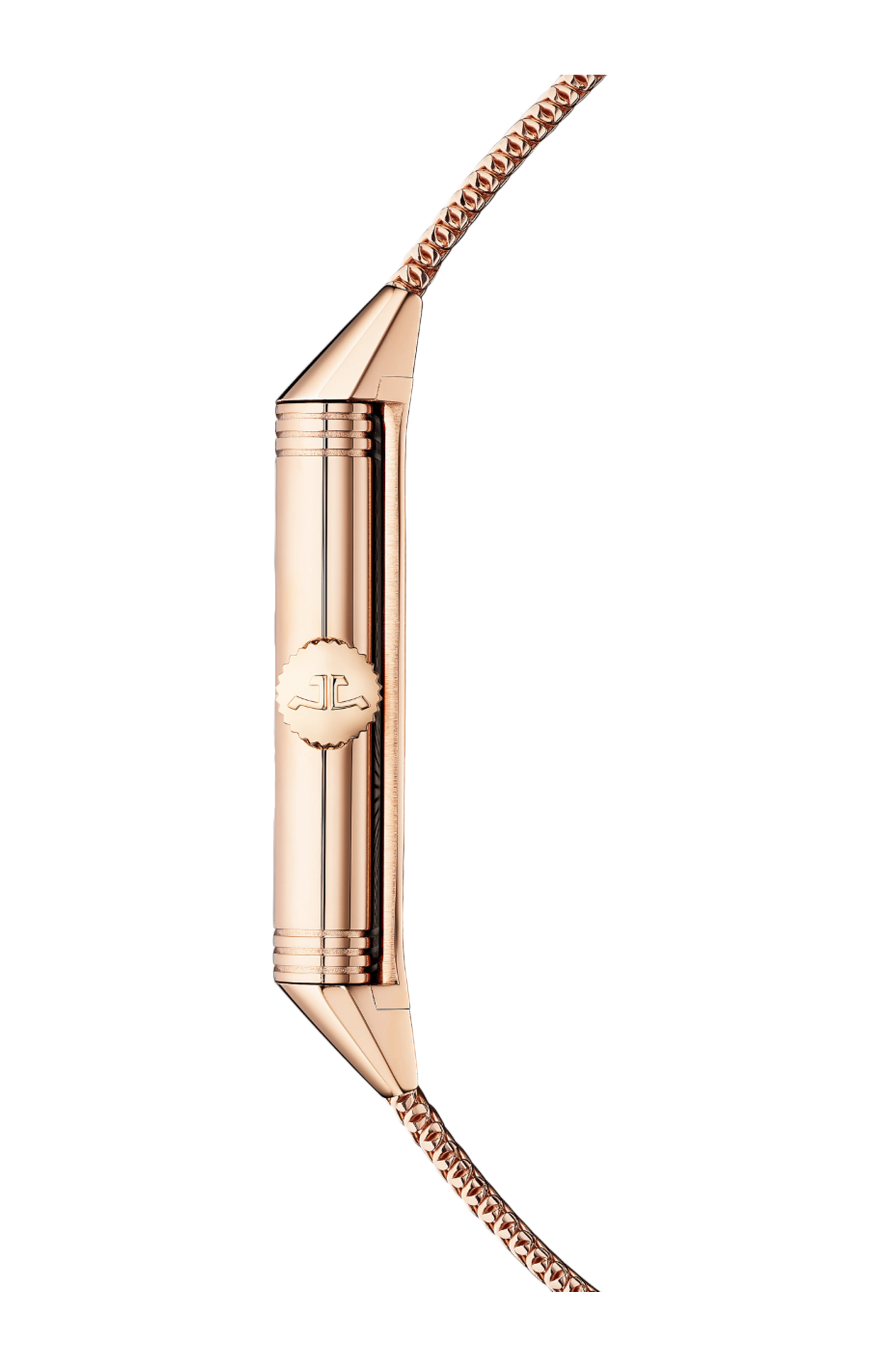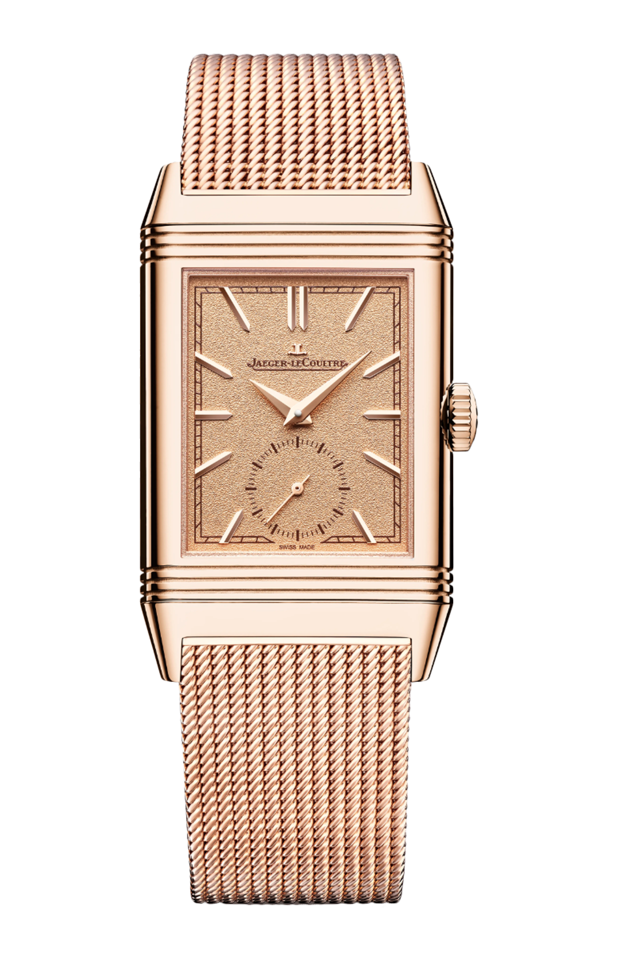 Con la sua cassa in oro rosa, l’orologio Reverso Tribute Monoface 'Or Deco' ha un fascino decisamente vintage. Ai lati del quadrante dorato con finitura a grana, il bracciale presenta una maglia milanese in oro che conferisce al modello uno stile raffinato e prezioso. Questa costruzione offre un comfort ottimale al polso. La finezza del bracciale si abbina alla sottigliezza della cassa composta da 50 componenti, per uno spessore di soli 7,56 mm. Il retro può essere personalizzato con un’incisione. Il calibro di manifattura 822 a carica manuale indica ore, minuti e piccoli secondi e ha una riserva di carica di 42 ore.