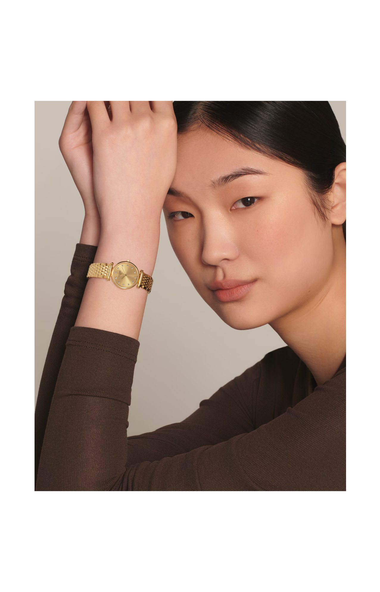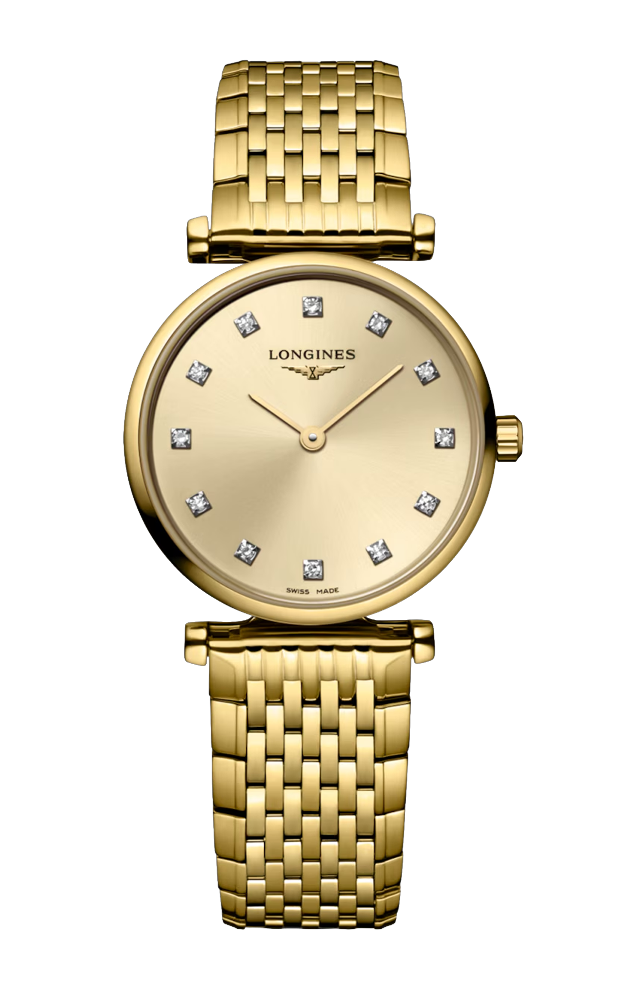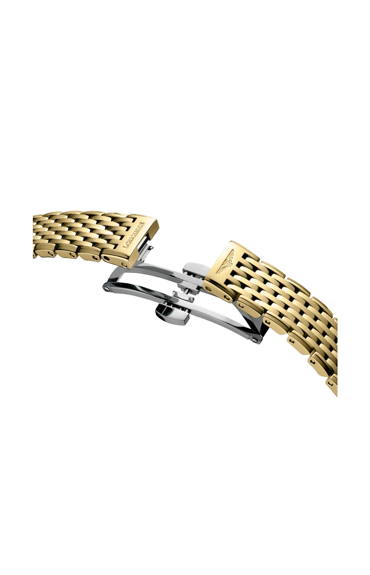 Orologio al quarzo, Ø 24.00 mm, rivestimento PVD giallo, L4.209.2.37.8 Impermeabile fino a 3 bar, vetro zaffiro antigraffio. Quadrante dorato. Bracciale in rivestimento PVD giallo, con chiusura déployante a tripla sicurezza e meccanismo di apertura a pressione.