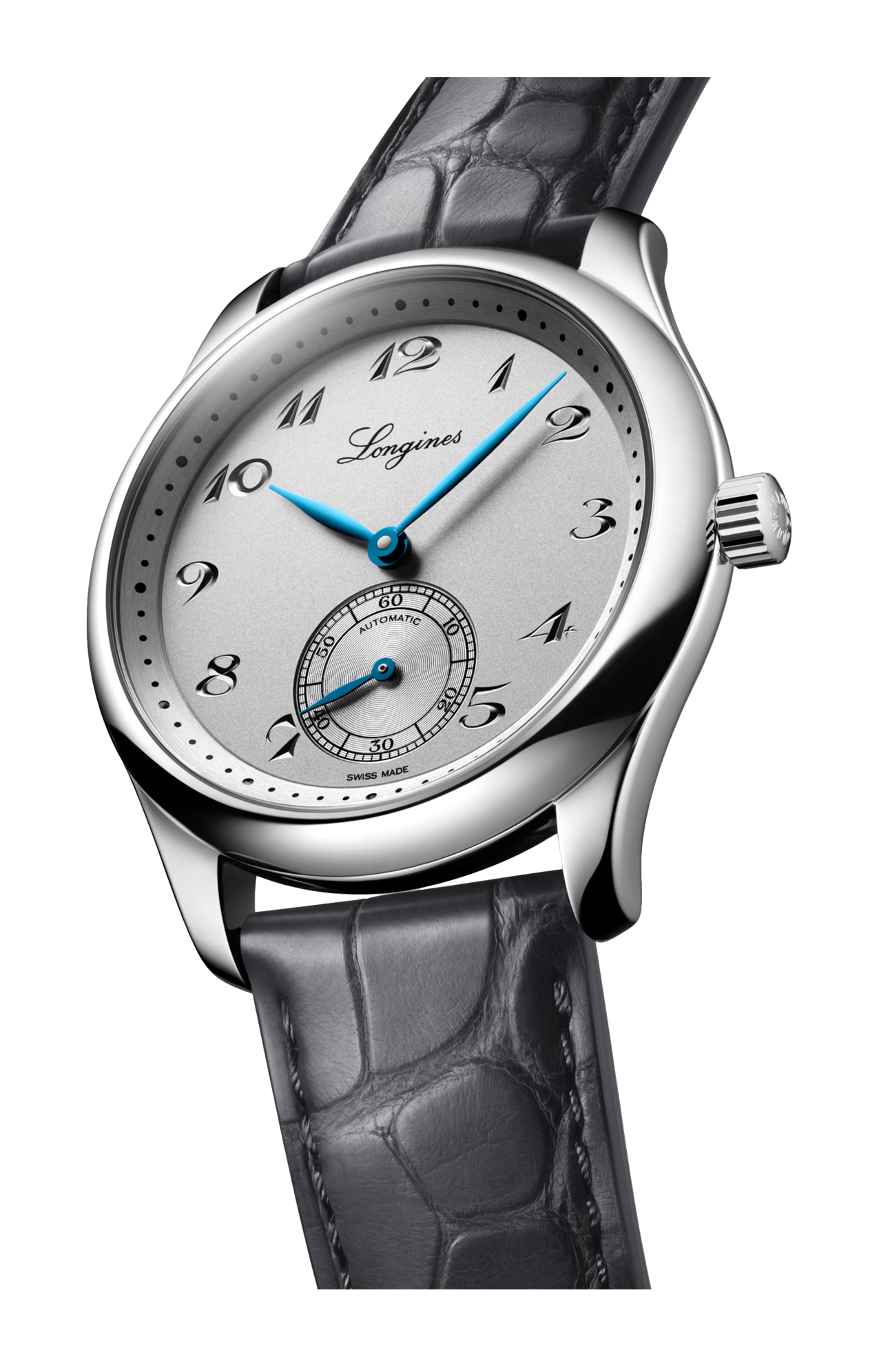 Movimento meccanico a carica automatica con frequenza di 25'200 alternanze orarie e riserva di carica di circa 72 ore, bilanciere-spirale in silicio monocristallino. Impermeabile fino a 3 bar, vetro zaffiro antigraffio con trattamento antiriflesso multistrato su entrambi i lati. Quadrante argento. Bracciale in cinturino in alligatore, con chiusura déployante a tripla sicurezza e meccanismo di apertura a pressione.