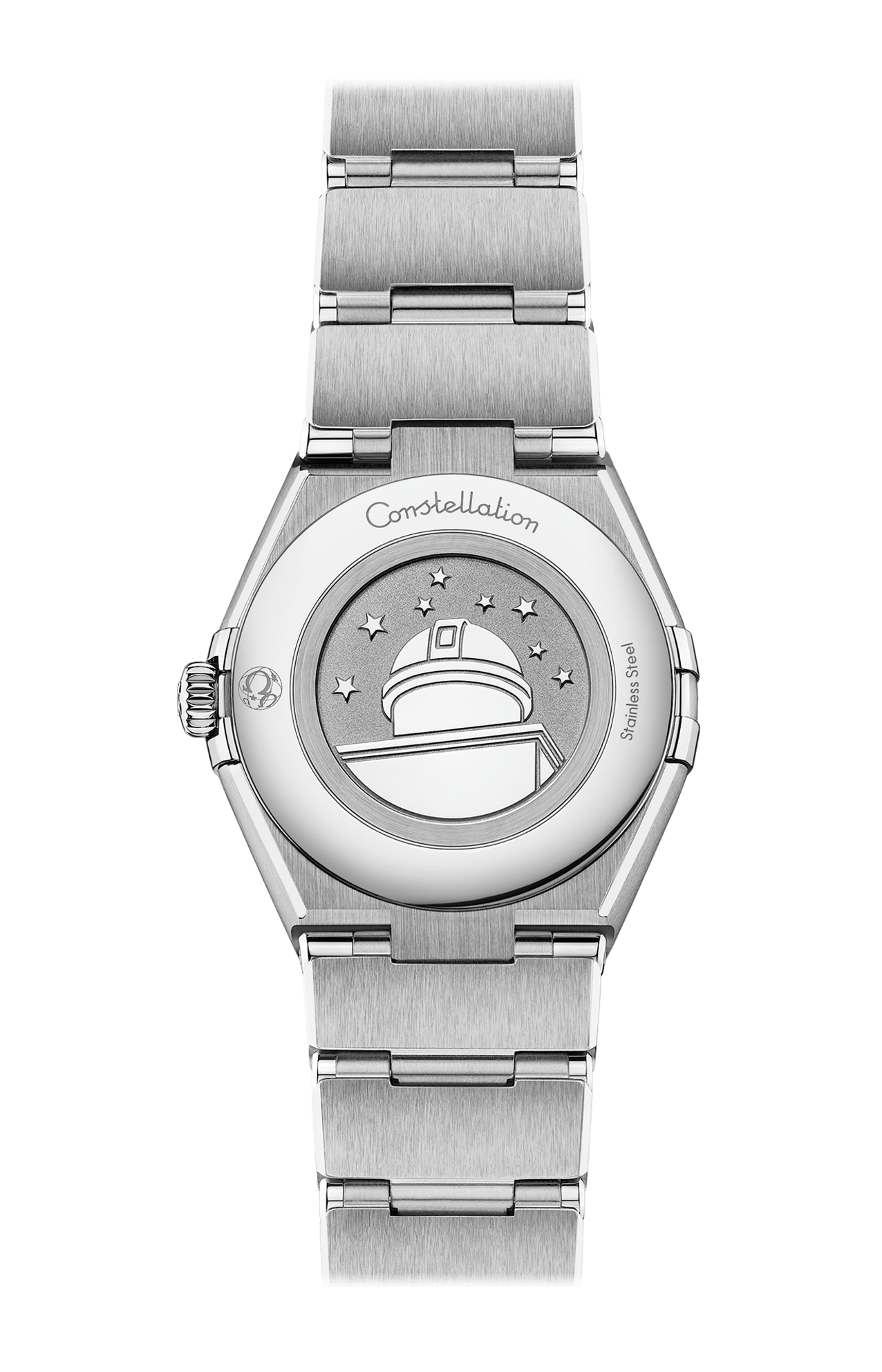 Il segnatempo batte al ritmo del calibro Omega 4061, mentre il fondello reca impresso il medaglione Constellation con l’effigie dell’osservatorio.