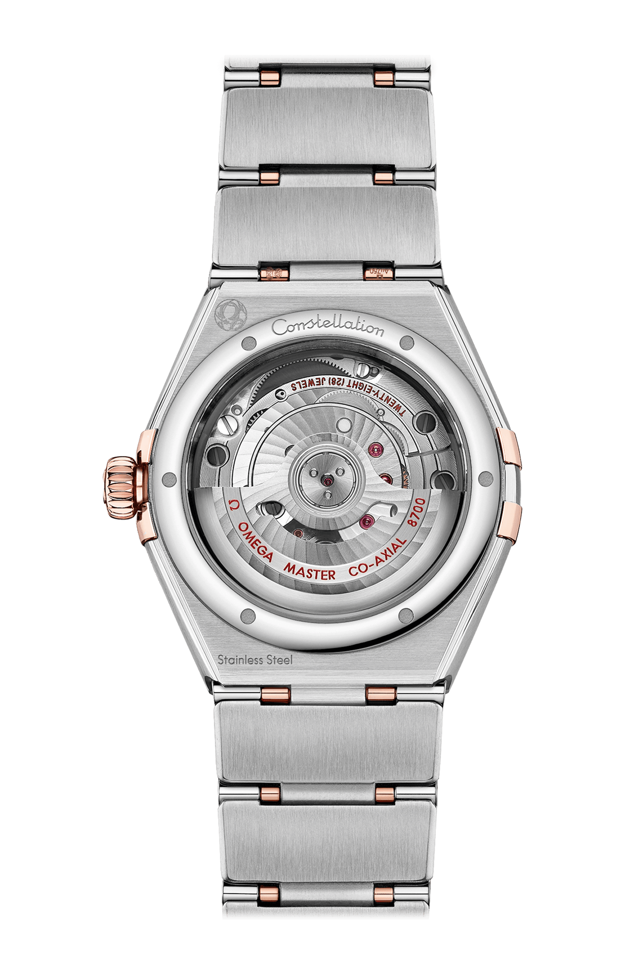 Questo modello da 29 mm in oro Sedna™ 18K e acciaio inossidabile presenta una lunetta tempestata di diamanti, un quadrante argentato effetto cristallo con indici delle ore in diamanti e un datario a finestrella a ore 6. Sono in oro Sedna™ 18K anche le lancette, il logo Omega, la stella Constellation e i supporti dei diamanti.
