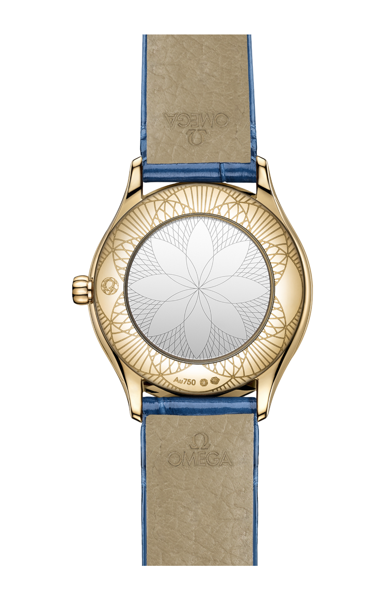 Corredato da un cinturino a doppio giro in pelle di alligatore laccata blu con fibbia Trésor, l’orologio è animato dal calibro Omega 4061, alloggiato nello speciale fondello a specchio con motivo metallizzato “Her Time”.