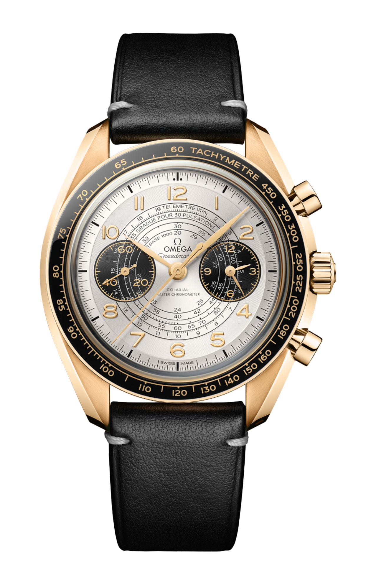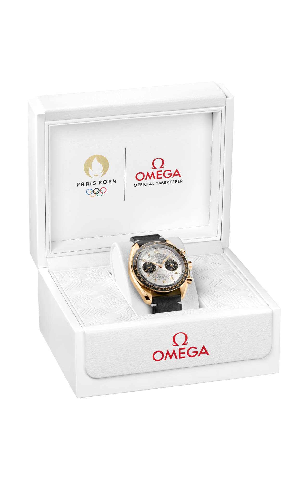 Questo modello da 43 mm è un omaggio alle Olimpiadi di Parigi 2024 e sfoggia i tre colori principali dell’evento: oro, nero e bianco. L’orologio è realizzato in oro Moonshine™ 18K e presenta un quadrante bianco argentato opalino con contatori bruniti. Tra le caratteristiche aggiuntive si annoverano l’anello della lunetta in ceramica nera con scala tachimetrica in Ceragold™ Omega, i numeri arabi in oro Moonshine™ 18K e le lancette a foglia e dei contatori con trattamento in PVD oro Moonshine™.