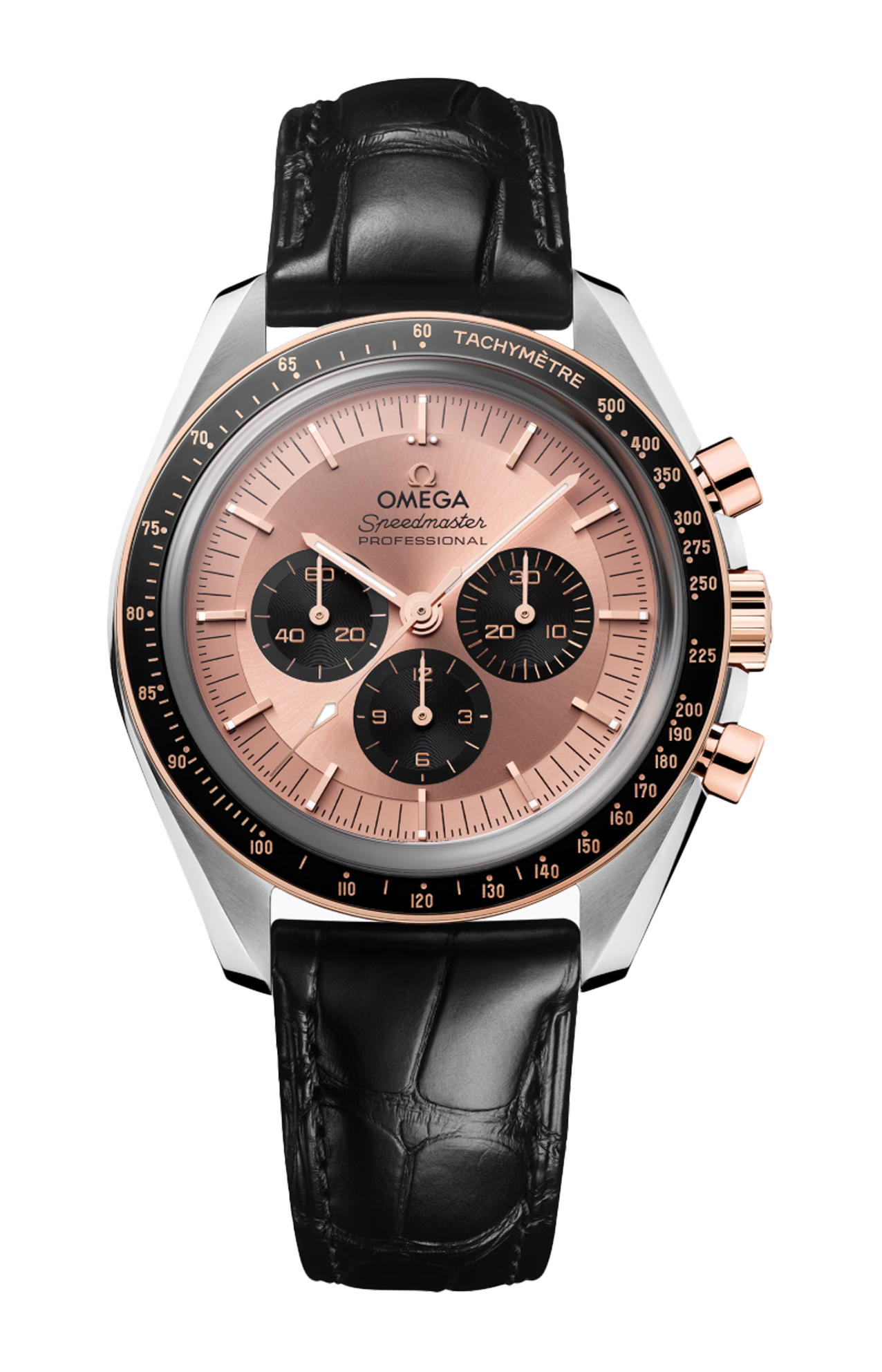Questo modello bicolore da 42 mm in acciaio inossidabile e oro Sedna™ 18K presenta quadrante e fondello in vetro zaffiro. Ispirato alla quarta generazione di Speedmaster indossata sulla Luna, sfoggia una cassa asimmetrica con l'anello della lunetta in ceramica nera e il celebre “Dot over 90” in Ceragold™ Omega sulla scala tachimetrica.
