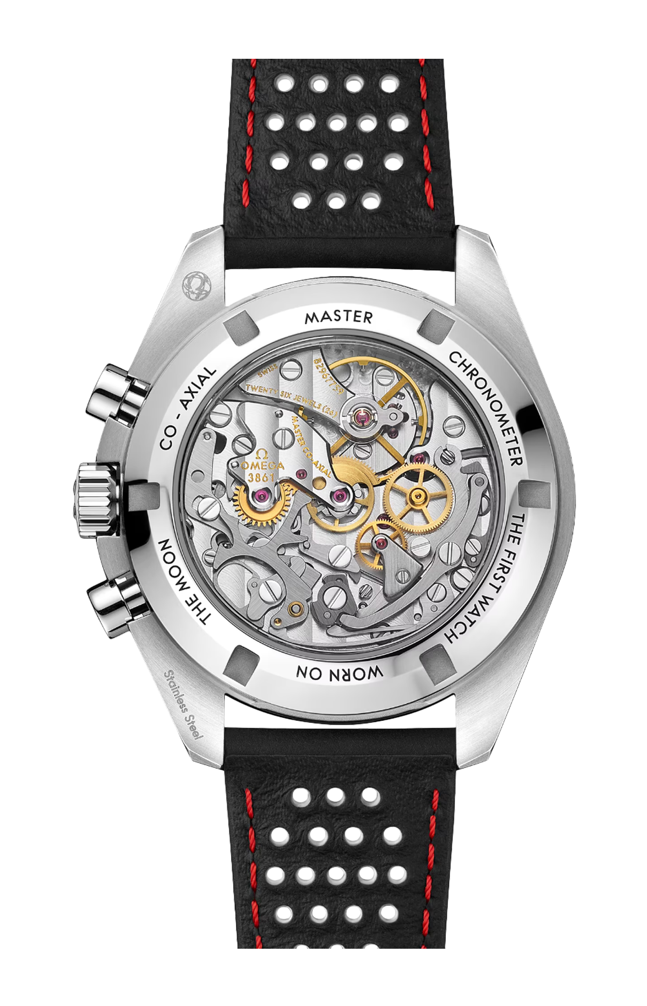 L'orologio è animato dal calibro Omega Co-Axial Master Chronometer 3861, che alimenta il contatore dei piccoli secondi, i contatori dei 30 minuti e delle 12 ore e la lancetta cronografica centrale.