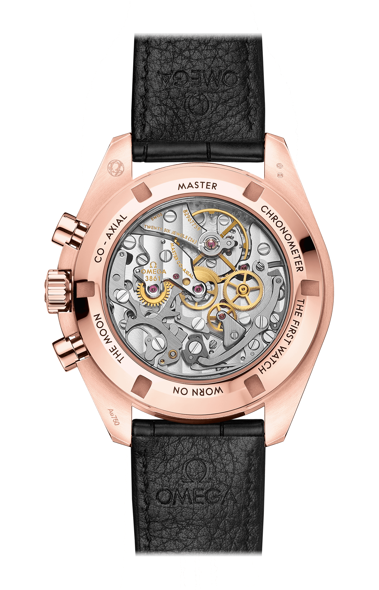 Il segnatempo è animato dal calibro Omega Co-Axial Master Chronometer 3861, che alimenta il contatore dei piccoli secondi, i contatori dei 30 minuti e delle 12 ore e la lancetta cronografica centrale.