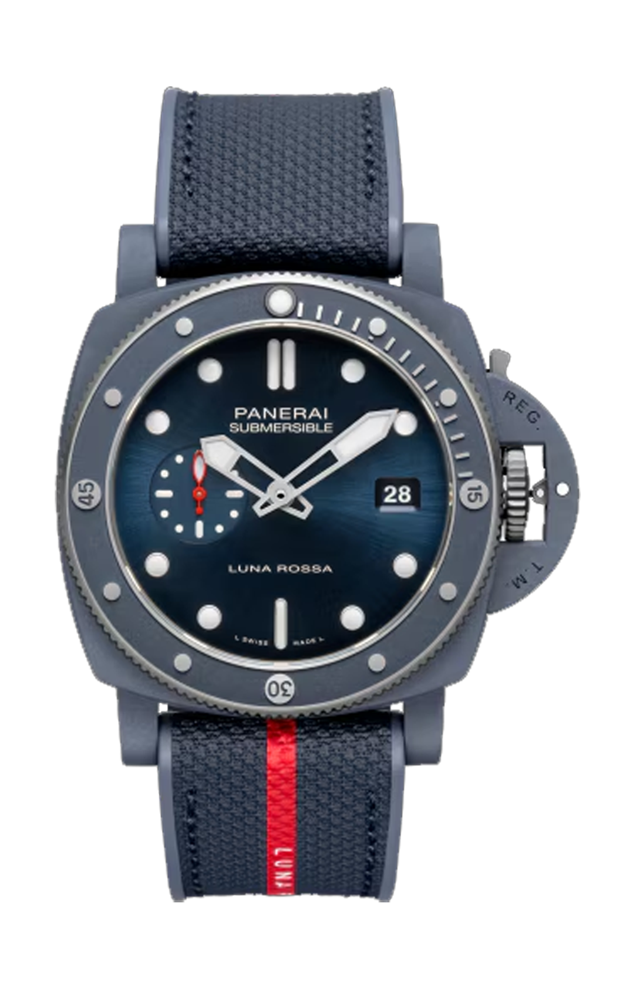 Il Submersible Quarantaquattro Luna Rossa Ti-Ceramitech™ PAM01466 sfoggia un’estetica di ispirazione nautica grazie al quadrante blu con finitura satinée soleil e alla cassa in Ti-Ceramitech™ da 44 mm, un innovativo materiale adattato all’orologeria e originariamente utilizzato in ambienti competitivi ad alte prestazioni. Dopo sette anni di ricerca e sviluppo, Panerai ha innovato il processo di ceramizzazione del titanio attraverso l’ossidazione elettrolitica al plasma, una tecnica che combina la leggerezza del titanio e la durezza della ceramica, ottenendo una particolare tonalità blu che richiama il mare.