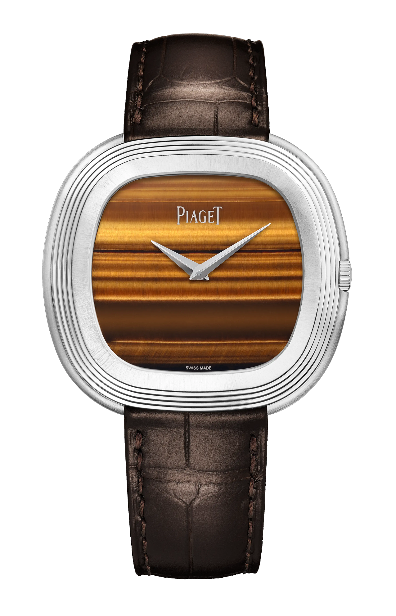 Orologio Andy Warhol, 45 x 43 mm. Cassa in oro bianco 18 carati con finitura rodio. Quadrante occhio di tigre. Cinturino in alligatore marrone scuro. Movimento meccanico automatico di manifattura 501P1.