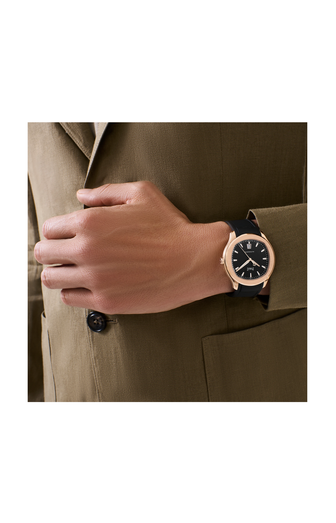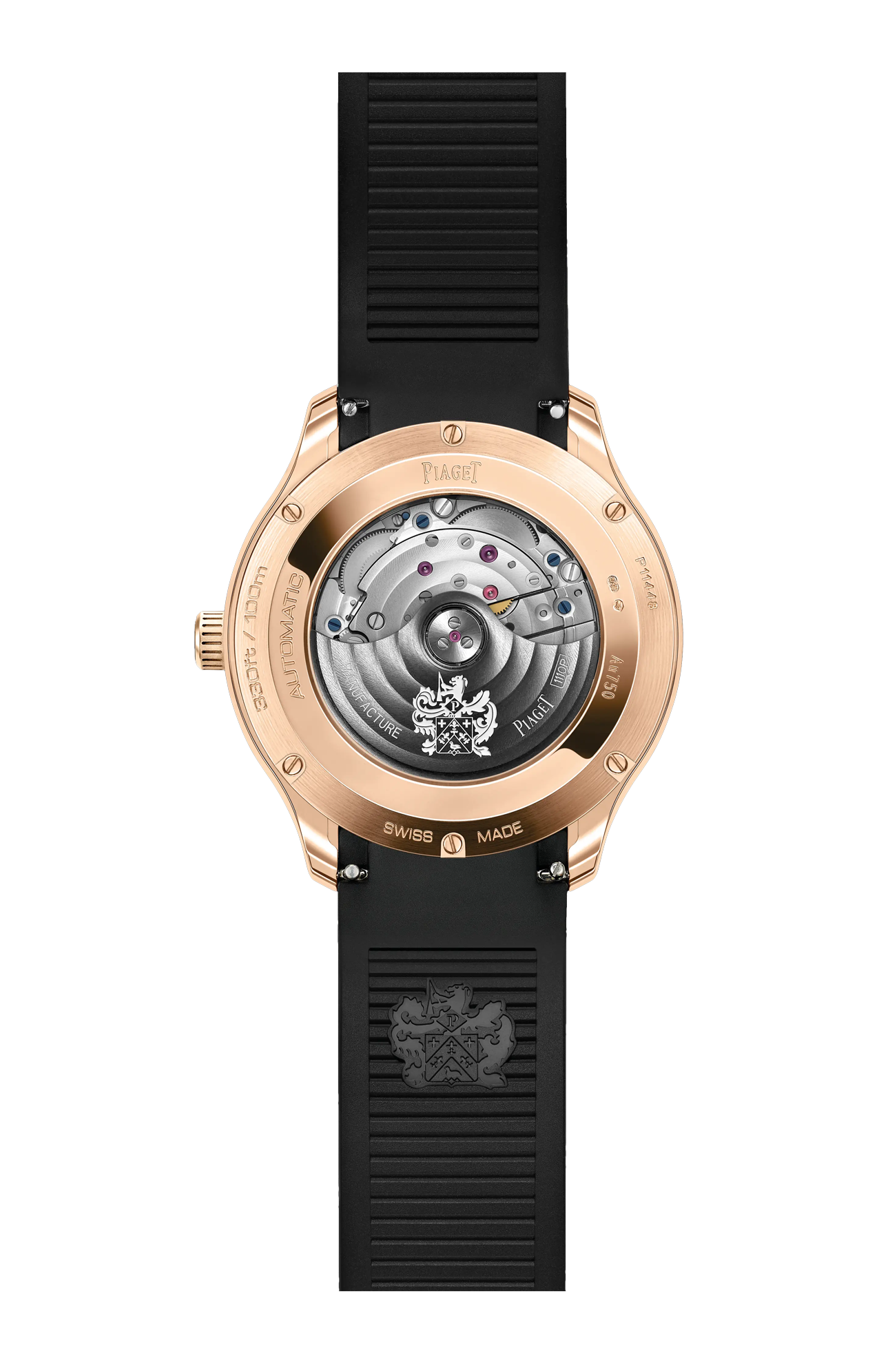 Orologio Piaget Polo Date, 42 mm. Cassa in oro rosa 18 carati. Quadrante con indici e lancette rivestiti in Superluminova®. Quadrante nero e cinturino in caucciù nero. Fondello in vetro zaffiro. Movimento meccanico automatico di manifattura 1110P.