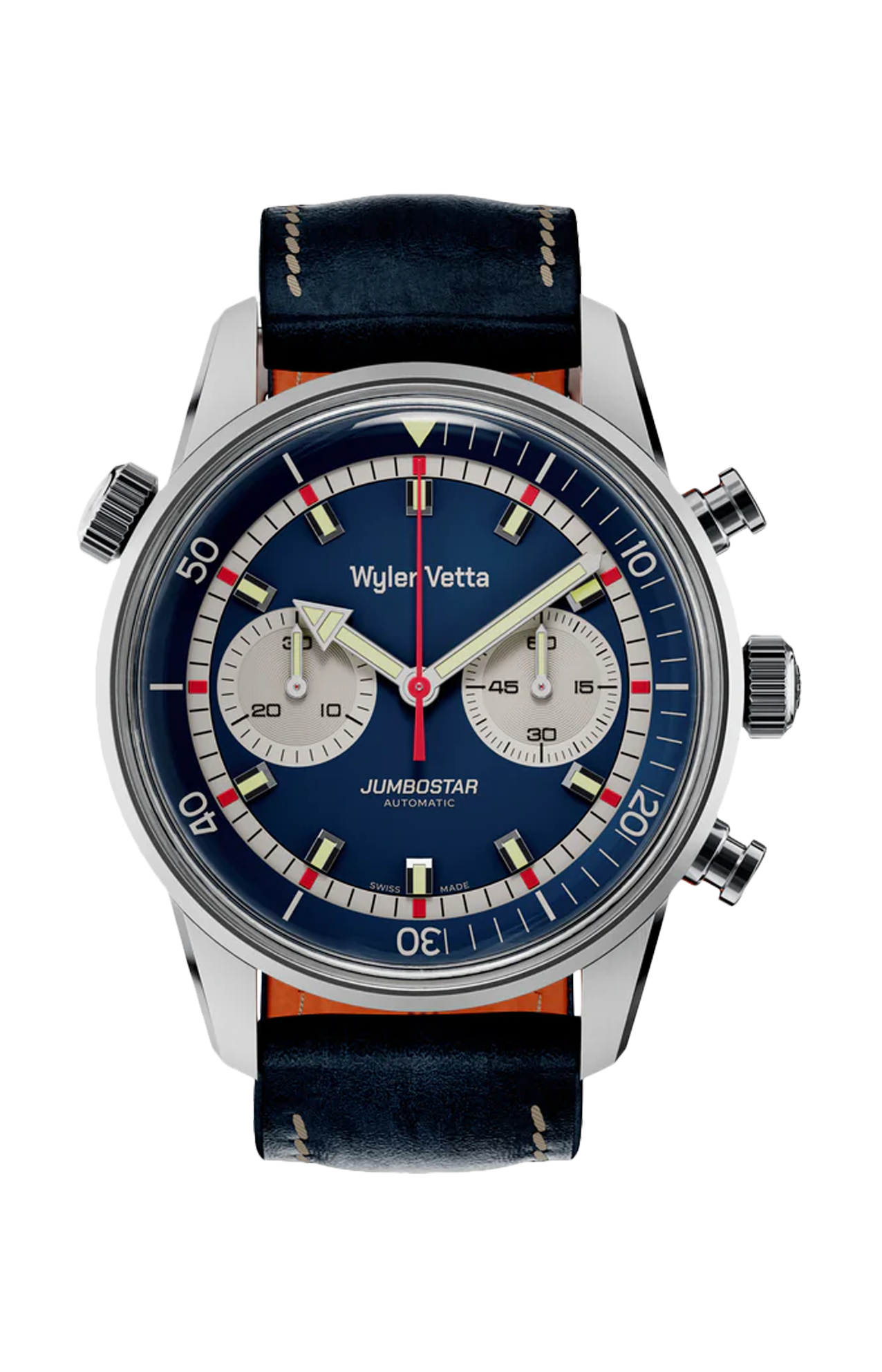 Ispirato alla versione italiana dell’iconico cronografo JUMBOSTAR del 1968, con il caratteristico ribassamento del quadrante color crema con tacche poste in corrispondenza delle ore 12 in color rosso acceso. La seconda corona, posta a ore 10, aziona la ghiera interna girevole conta minuti.