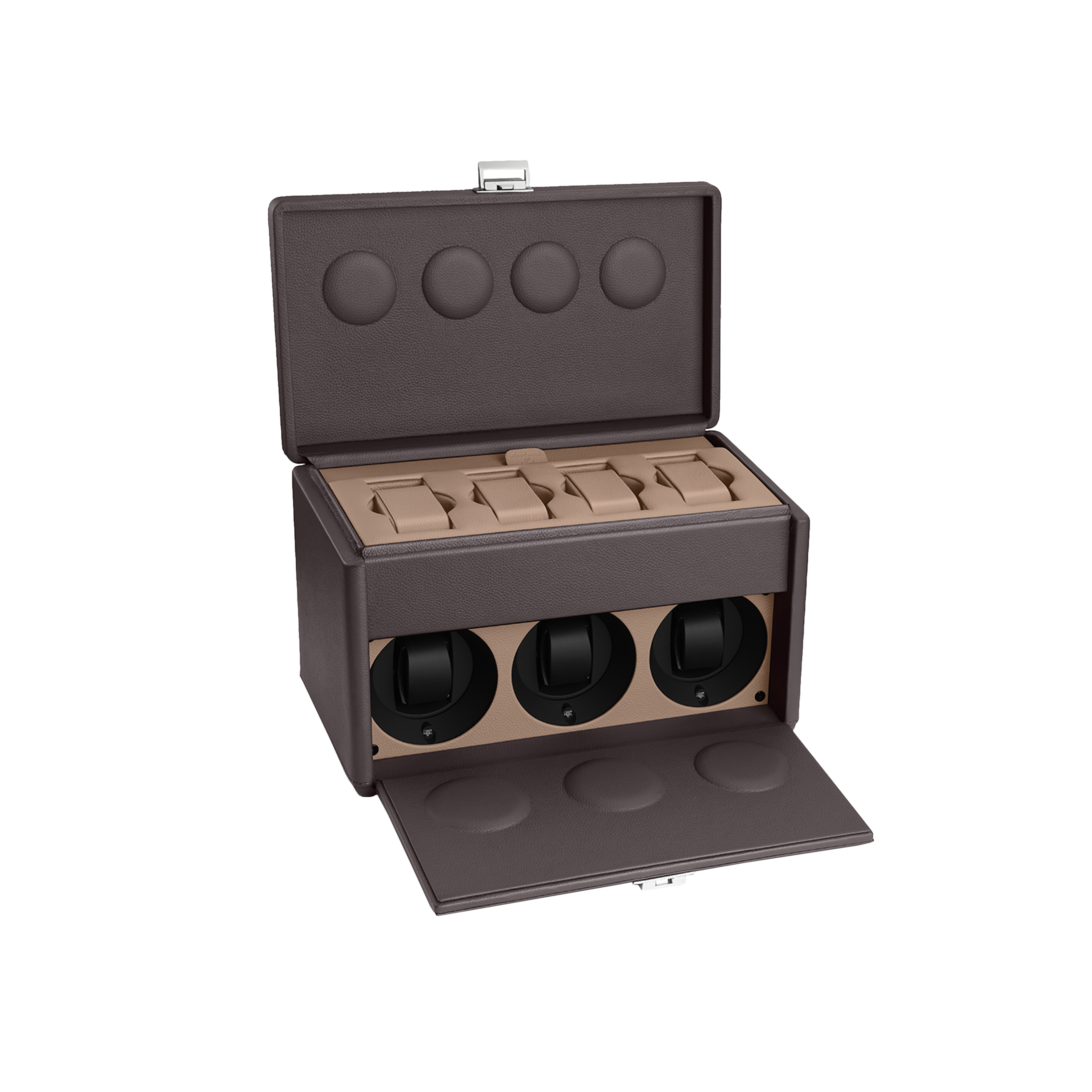 Custodia interamente in pelle con 3 avvolgitori programmabili più spazio per 4 orologi con cinturini in pelle o bracciale adatto per orologi di dimensioni normali e oversize, con scomparto aggiuntivo per cinturini. Programmabile tramite tecnologia Bluetooth e app da scaricare sullo smartphone, funziona a batterie con una durata media di 3 anni.