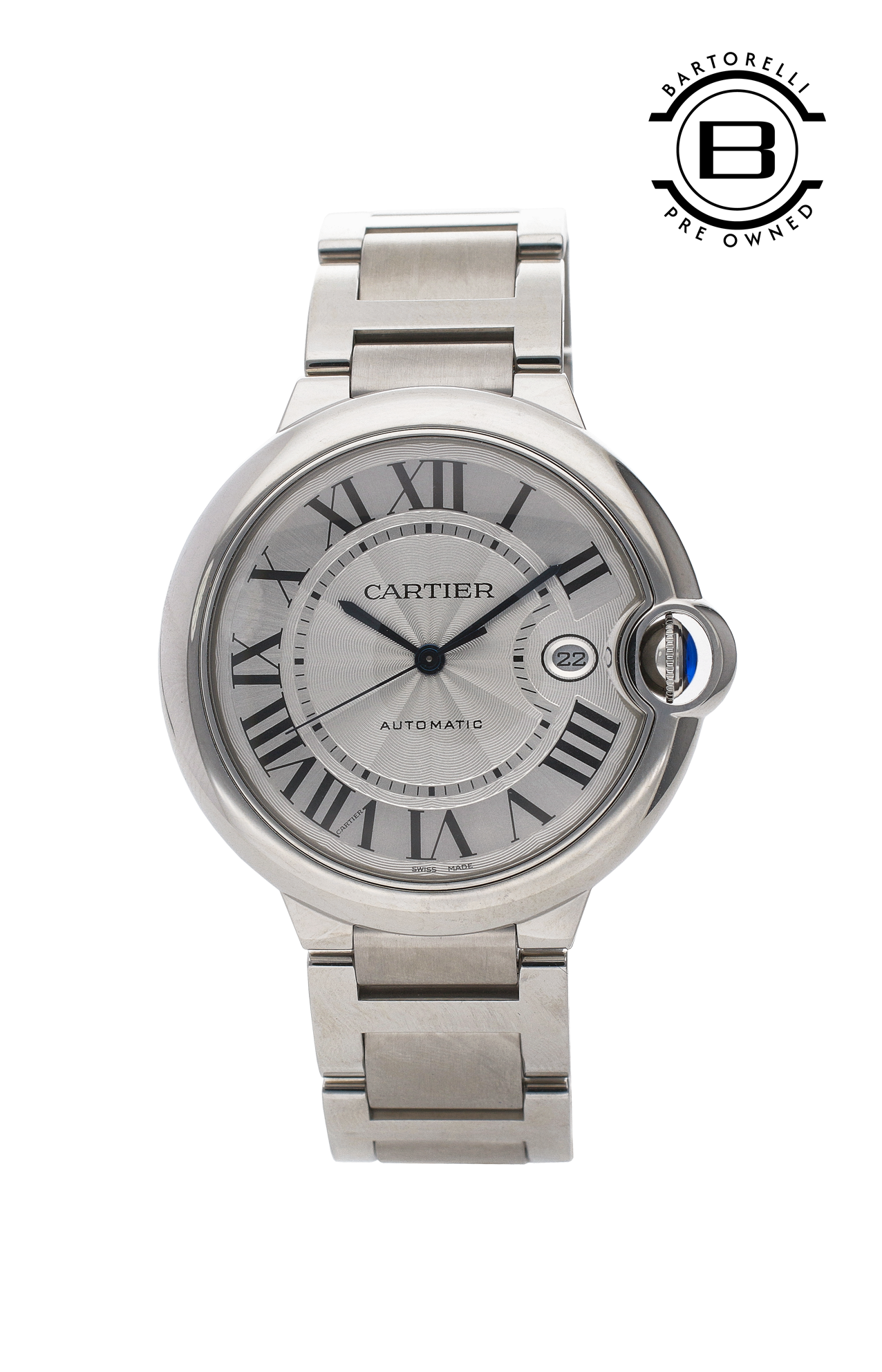 Orologio Ballon Bleu de Cartier, 42 mm. Movimento meccanico a carica automatica, calibro 1847 MC. Cassa in acciaio, corona scanalata ornata di uno spinello sintetico cabochon. Quadrante argentato guilloché. Lancette a forma di gladio d’acciaio azzurrato. Vetro zaffiro. Datario a finestrella a ore 3. Bracciale intercambiabile in acciaio. Spessore 13 mm. Impermeabile fino a 30 metri.