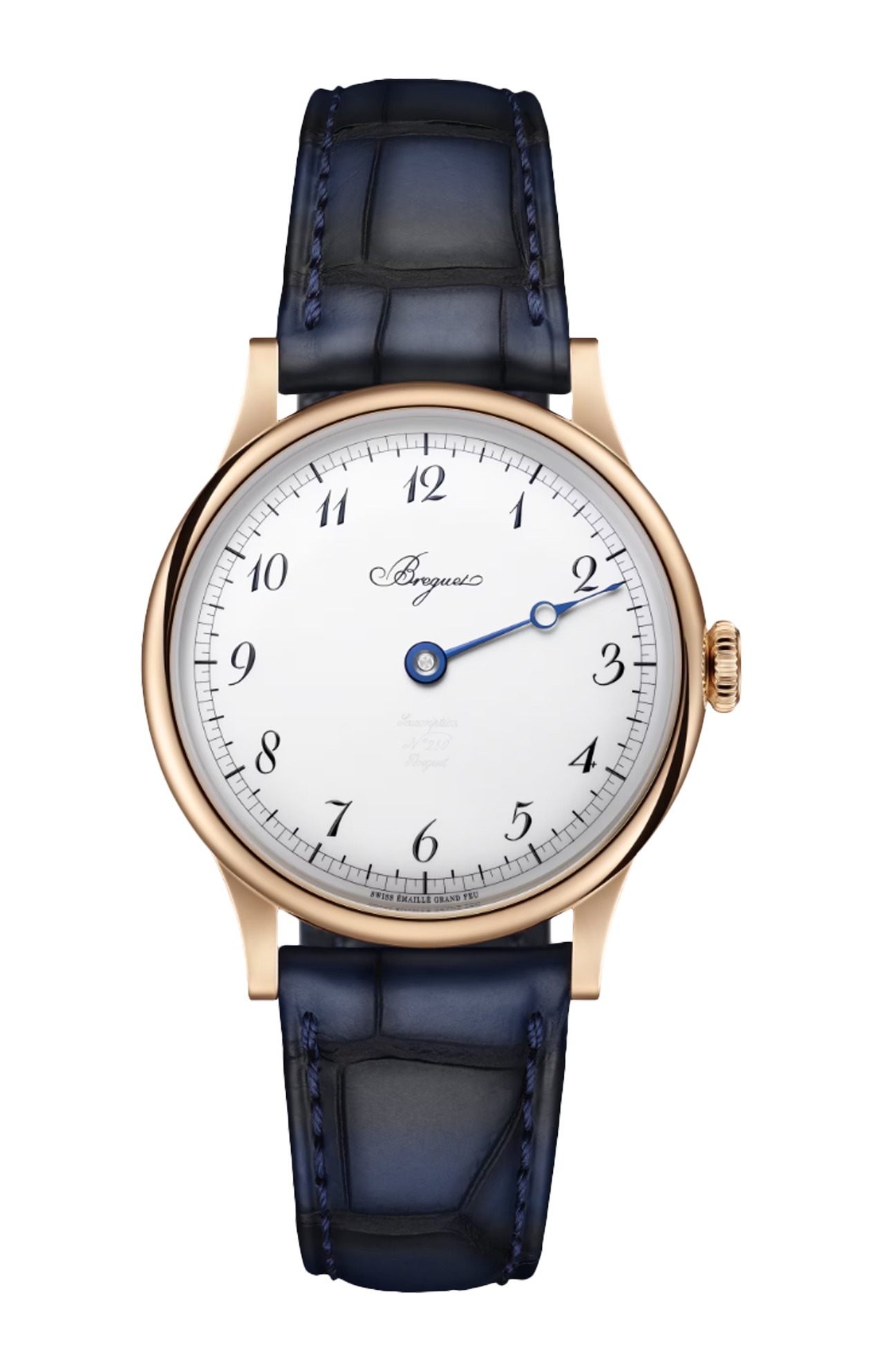 Cassa in oro Breguet 18 carati di 40 mm di diametro, spessore 10,8 mm, parte centrale satinata, vetro zaffiro con doppio trattamento antiriflesso. Fondello "Quai de l’Horloge" guilloché a mano, vetro inciso "Breguet 250 anni", singolo trattamento antiriflesso interno, impermeabilità 3 bar (30 m). Quadrante in smalto bianco grand feu su base d’oro Breguet 18 carati. Lancetta Breguet sagomata e incurvata con pomolo incavato, acciaio azzurrato alla fiamma. Firma Breguet in smalto nero petit feu. Numeri arabi Breguet, smalto nero petit feu. Minuti in smalto nero petit feu "Souscription", numero di serie e firma segreta incisi con un pantografo a punta di diamante. Lancetta singola per la lettura dell’ora (precisione di lettura: +/- 2 minuti) curvata e lucidata in acciaio azzurrato a fiamma.