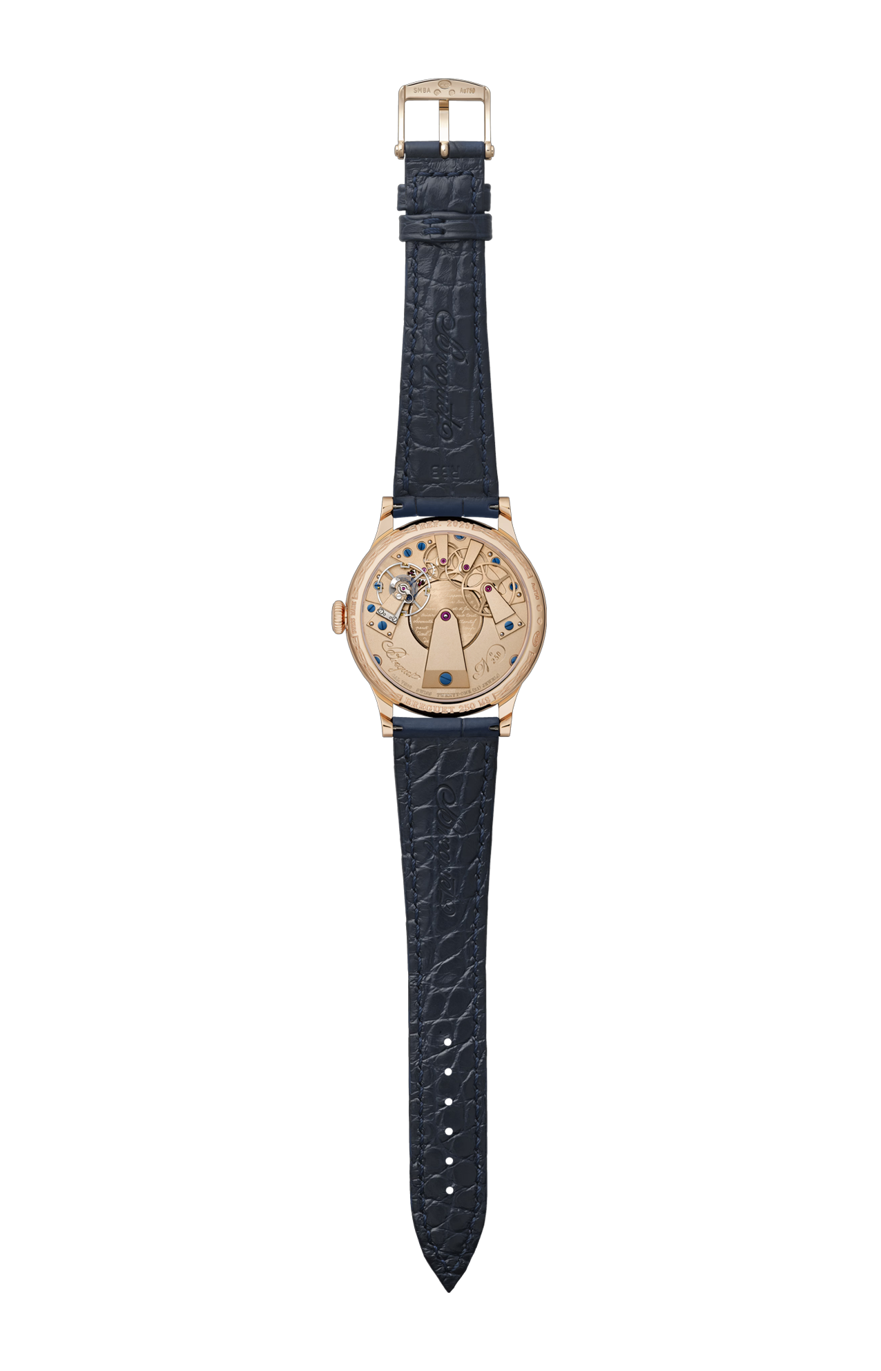Cinturino alligatore a squame grandi blu navy, rivestimento interno in alligatore a squame piccole blu navy. Fibba ad ardiglione in oro Breguet 18 carati con parte finale decorata dalla B di Breguet.