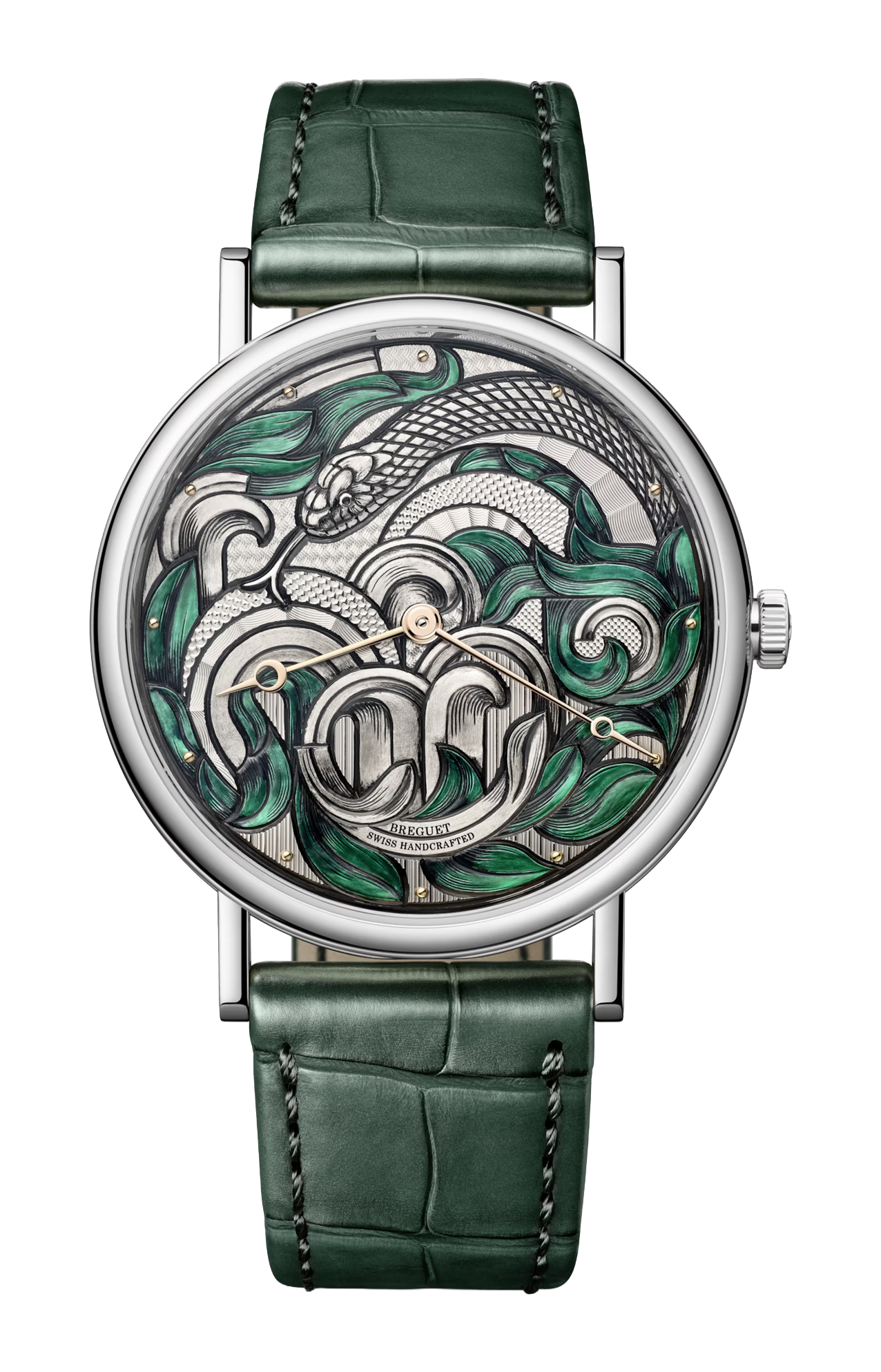 All’interno pulsa un movimento meccanico automatico di manifattura di alta precisione, progettato per garantire prestazioni affidabili e costanti, riflettendo la maestria tecnica che contraddistingue Breguet. Il vetro zaffiro bombato antigraffio protegge il quadrante e ne amplifica la visibilità da ogni angolazione, mentre il fondello in vetro zaffiro permette di ammirare le finiture sofisticate del movimento, tra cui le decorazioni tradizionali visibili nei ponti e nella massa oscillante.