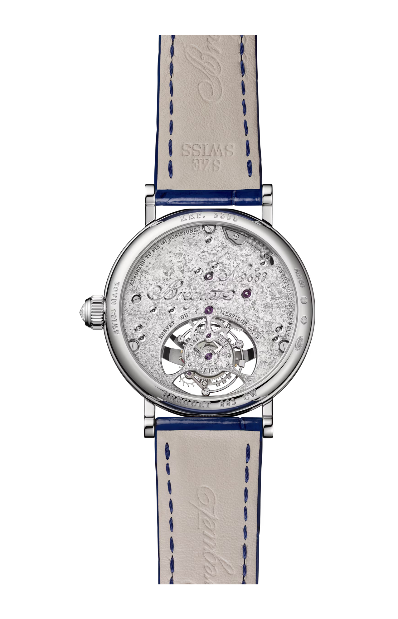 Madreperla e diamanti circondano il tourbillon posto all’interno di un’ampia apertura curva e ovale. La versione in oro rosa mostra l’ora su un giro delle ore in madreperla naturale bianca con al centro dei diamanti incastonati a neve. Sul modello in oro bianco, il quadrante in madreperla perlata e verniciata blu notte è costellato di stelle che richiamano un cielo notturno. Il ponte del tourbillon rievoca una stella cadente composta da diamanti con incastonatura a neve.