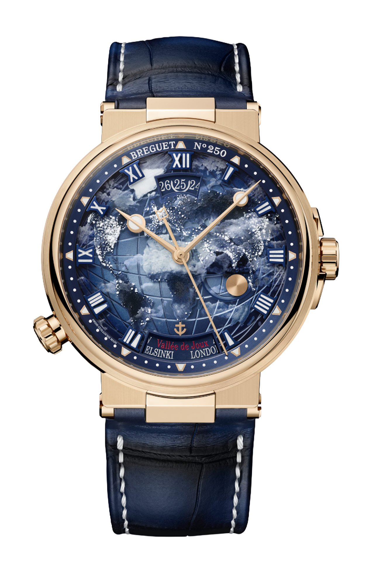 Il Breguet Marine Hora Mundi 5555BH/YS/9WV è un segnatempo di alta orologeria dedicato ai viaggiatori esigenti e agli amanti delle complicazioni sofisticate, che unisce precisione tecnica, eleganza sportiva e un’estetica contemporanea. La cassa rotonda in oro Breguet 18 K da 43,9 mm, caratterizzata da finiture satinate e lucidate, offre una presenza di grande impatto al polso pur mantenendo comfort e leggibilità, mentre la lunetta spazzolata e le anse scolpite aggiungono carattere dinamico. Il quadrante presenta una mappa del mondo incisa con dettagli raffinati e sono integrate le indicazioni del doppio fuso orario, giorno/notte e città di riferimento: strumenti perfetti per chi viaggia frequentemente e desidera una rapida lettura delle informazioni globali. La complicazione Hora Mundi consente di impostare istantaneamente l’ora locale nella città desiderata senza interferire con l’ora di riferimento, grazie a un meccanismo innovativo che rende intuitiva la gestione di più fusi orari. Lancette, indici e dettagli in oro bianco garantiscono ottima leggibilità e contrasto con lo sfondo, mentre il vetro zaffiro antigraffio con trattamento antiriflesso assicura visibilità ottimale da ogni angolo. All’interno pulsa un movimento automatico di manifattura con finiture di livello eccelso, visibile attraverso il fondello in vetro zaffiro, che combina affidabilità, precisione e una riserva di carica generosa. Il cinturino in pelle di alligatore integrato con fibbia déployante in oro bianco completa il design con comfort ergonomico e stile contemporaneo. Il Marine Hora Mundi 5555BH/YS/9WV è pensato per chi desidera un orologio tecnico e cosmopolita, capace di accompagnare con eleganza i propri viaggi in tutto il mondo, con una fusione perfetta tra complicazioni orologiere e sofisticata estetica marina.