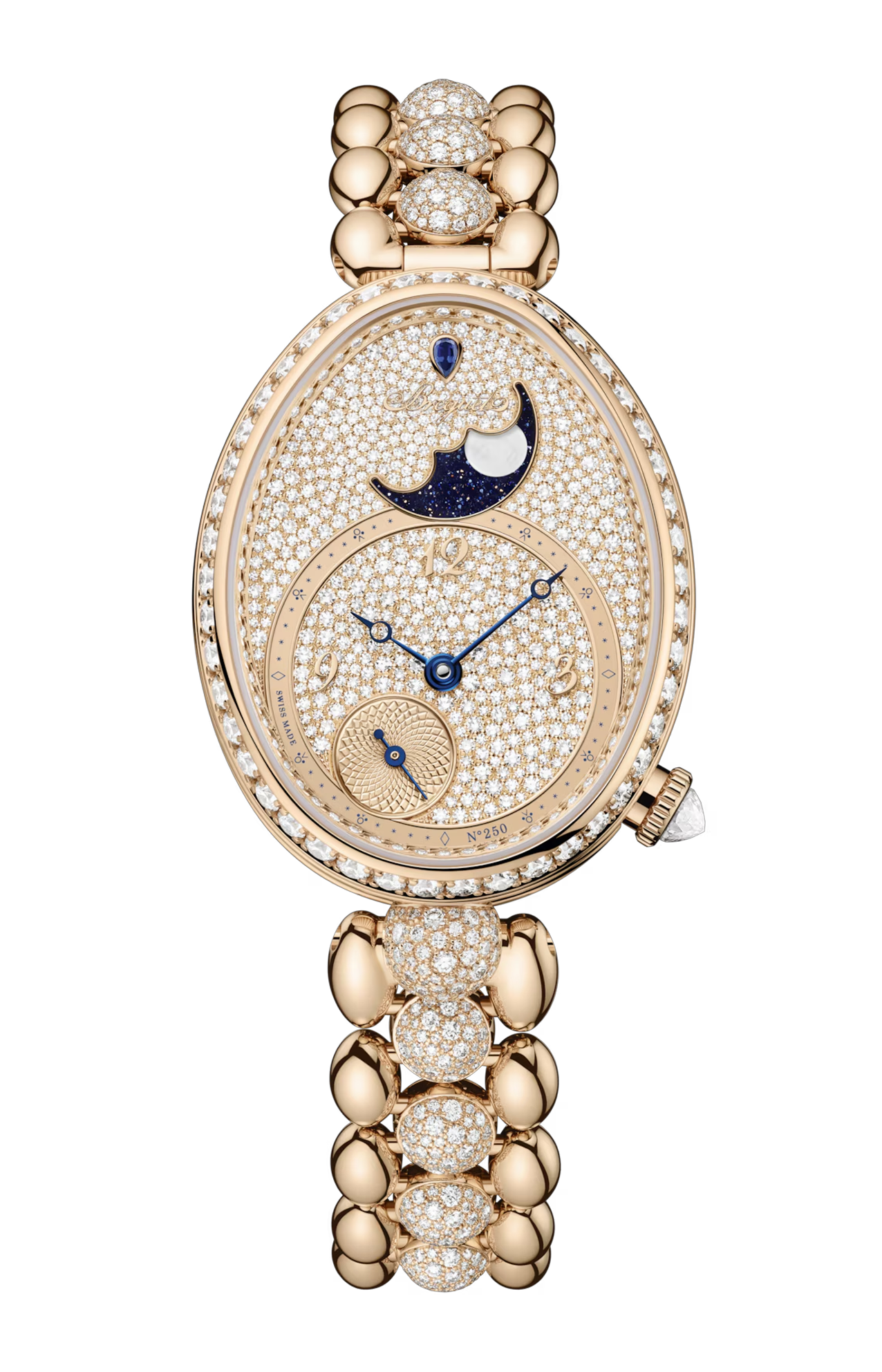Il Breguet Reine de Naples Phase de Lune 9935BH/8DJ/41D0 è un segnatempo femminile di alta orologeria che fonde eleganza classica, complicazione poetica e raffinatezza estetica, pensato per chi desidera un orologio che sia al tempo stesso gioiello e strumento di precisione. La cassa ovale in oro Breguet 18 K, dalle linee armoniose e sofisticate, è impreziosita da una lunetta incastonata con diamanti taglio brillante di alta qualità, che catturano la luce con splendore e leggerezza, conferendo all’orologio un fascino luminoso e raffinato. Il quadrante, con finitura delicata e iridescente, è animato da una funzione fase lunare elegantemente posizionata che aggiunge un tocco poetico alla visualizzazione del tempo, mentre indici sottili e lancette Breguet azzurrate assicurano leggibilità e stile armonico. Il vetro zaffiro bombato antigraffio protegge e valorizza ogni dettaglio visivo, offrendo profondità e chiarezza. All’interno pulsa un movimento meccanico automatico di alta precisione, progettato per garantire affidabilità e prestazioni costanti, espressione dell’eccellenza tecnica della Maison. Il cinturino in pelle di alta qualità con fibbia ad ardiglione in oro bianco completa il design con comfort e classe. Questo segnatempo è ideale per chi cerca un orologio elegante e sofisticato, capace di raccontare tradizione e innovazione con una complicazione poetica che celebra il tempo in tutte le sue sfumature — un gioiello d’alta orologeria da indossare con stile e distinzione in ogni occasione.
