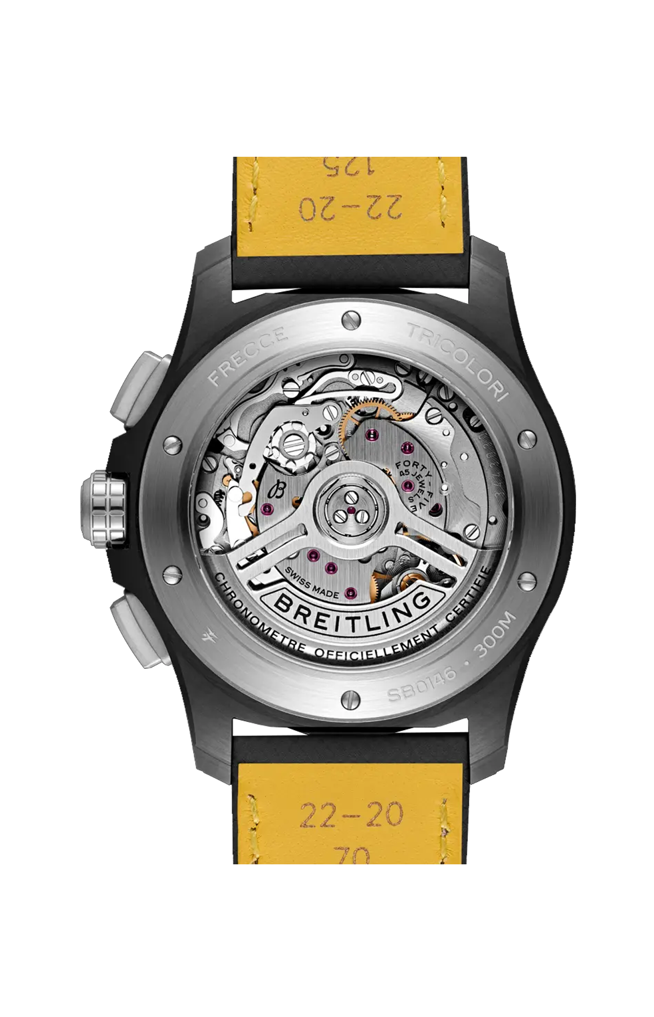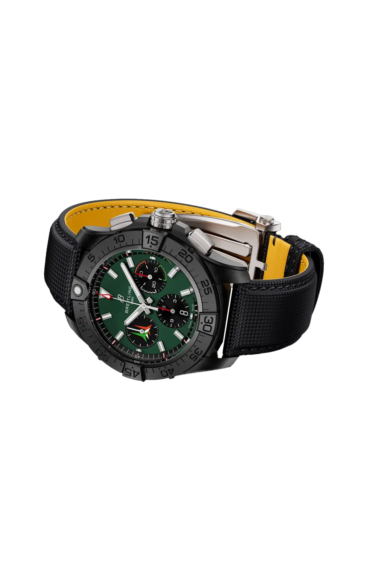 Ideato per i piloti di jet, l’Avenger è progettato per affrontare le cabine di pilotaggio più ardue, senza mai tirarsi indietro. Questa edizione è dedicata alle Frecce Tricolori, la famosa pattuglia di volo acrobatica italiana che affascina il pubblico di tutto il mondo con le sue esibizioni mozzafiato di abilità e precisione. Ma non serve essere un asso dell’aviazione militare per apprezzarne l’audace design, l’eccezionale resilienza e la funzionalità sempre un passo avanti. Questa versione presenta un quadrante verde opaco ornato dall’emblema delle Frecce Tricolori e un’incisione dedicata che circonda il fondello a vista del calibro di manifattura Breitling 01. Si contraddistingue inoltre per una cassa in ceramica nera e una minuteria in titanio, corredate da un cinturino in pelle militare. Il tonneau a botte non sarà forse per tutti, ma chiunque apprezzerà ogni minimo dettaglio della sua impermeabilità fino a 300 m, la maneggevole funzionalità e la costruzione resistente alla corrosione.