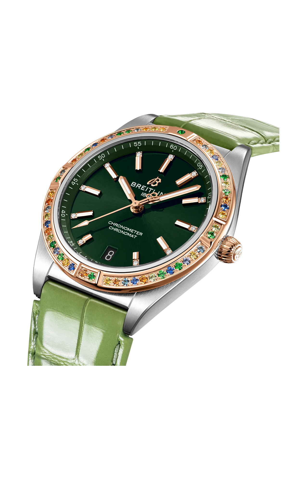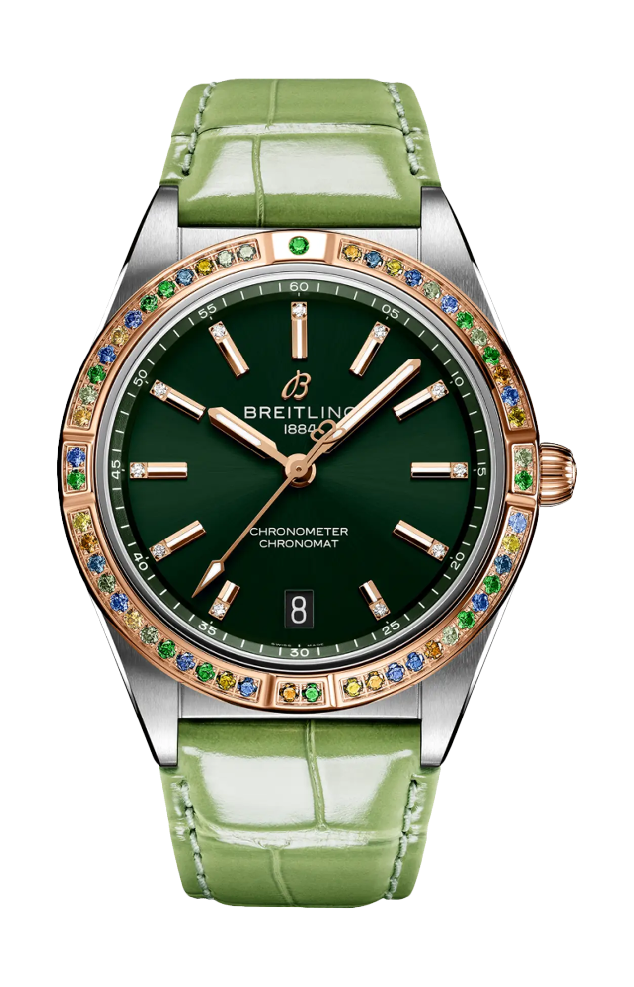 Accattivante e dal look prezioso, la capsule collection Chronomat South Sea chiama alla mente paradisi tropicali fatti di spiagge dorate, profondità marine, fiori variopinti e piante lussureggianti. Con quadranti metallici e madreperla, indici delle ore con diamanti incastonati e lunette con gemme incastonate dai colori vivaci, gli orologi si possono abbinare a un cinturino coordinato in pelle di alligatore o all’inconfondibile bracciale Rouleaux in metallo di Breitling. Vivi un’estate senza fine con Chronomat South Sea.