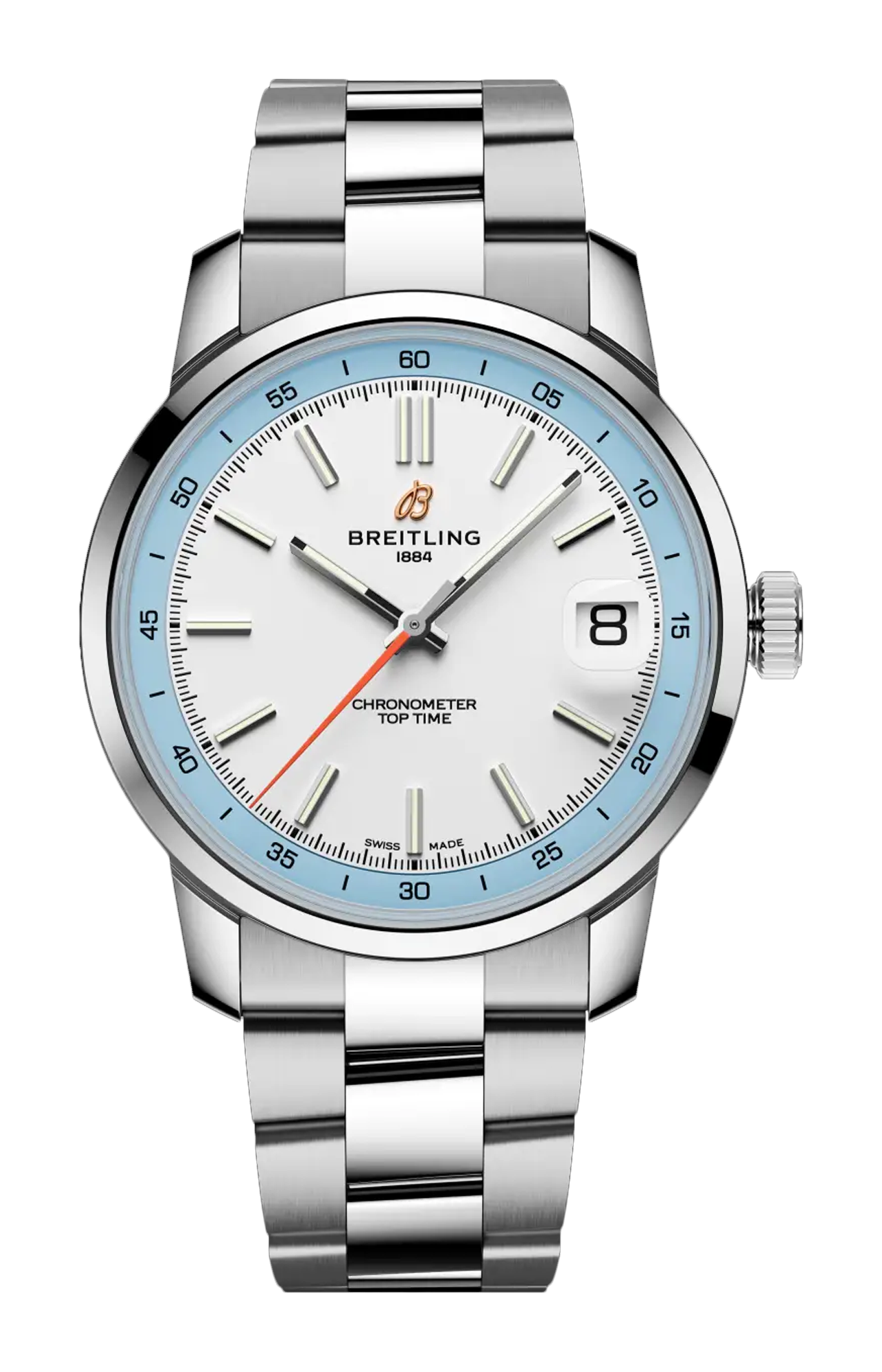 Il Top Time B31, novità del 2025, segna il debutto del movimento di manifattura Breitling B31. La cassa da 38 mm, fedele al DNA della linea, gli conferisce uno stile impeccabile, adatto a qualsiasi polso. Il Top Time B31 combina l'estetica retrò con il fascino contemporaneo. Il quadrante trae ispirazione dai cruscotti delle auto d’epoca, mentre la cassa da 38 mm coniuga proporzioni vintage e design contemporaneo, in una dimensione universale perfetta per qualsiasi polso. Il modello è disponibile in tre diverse colorazioni—verde, blu o bicolore bianco e azzurro—con bracciale in acciaio a tre file o cinturino in pelle di vitello traforata ispirato ai guanti da corsa. Dai viaggi on the road alla vita quotidiana, il Top Time B31 rende omaggio all’individualità e all’avventura, sempre e dovunque.