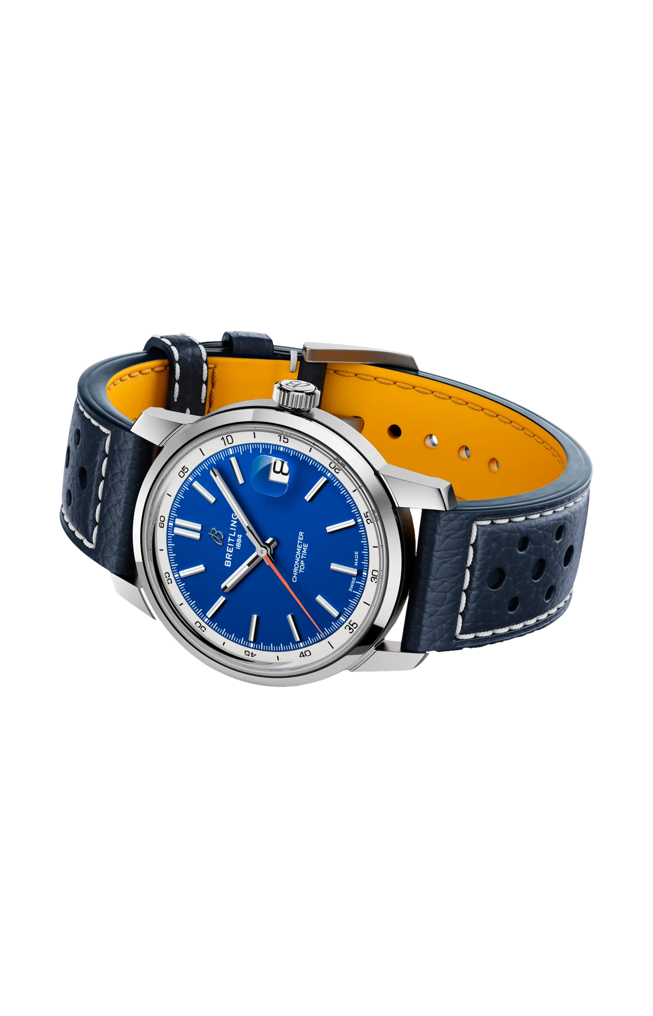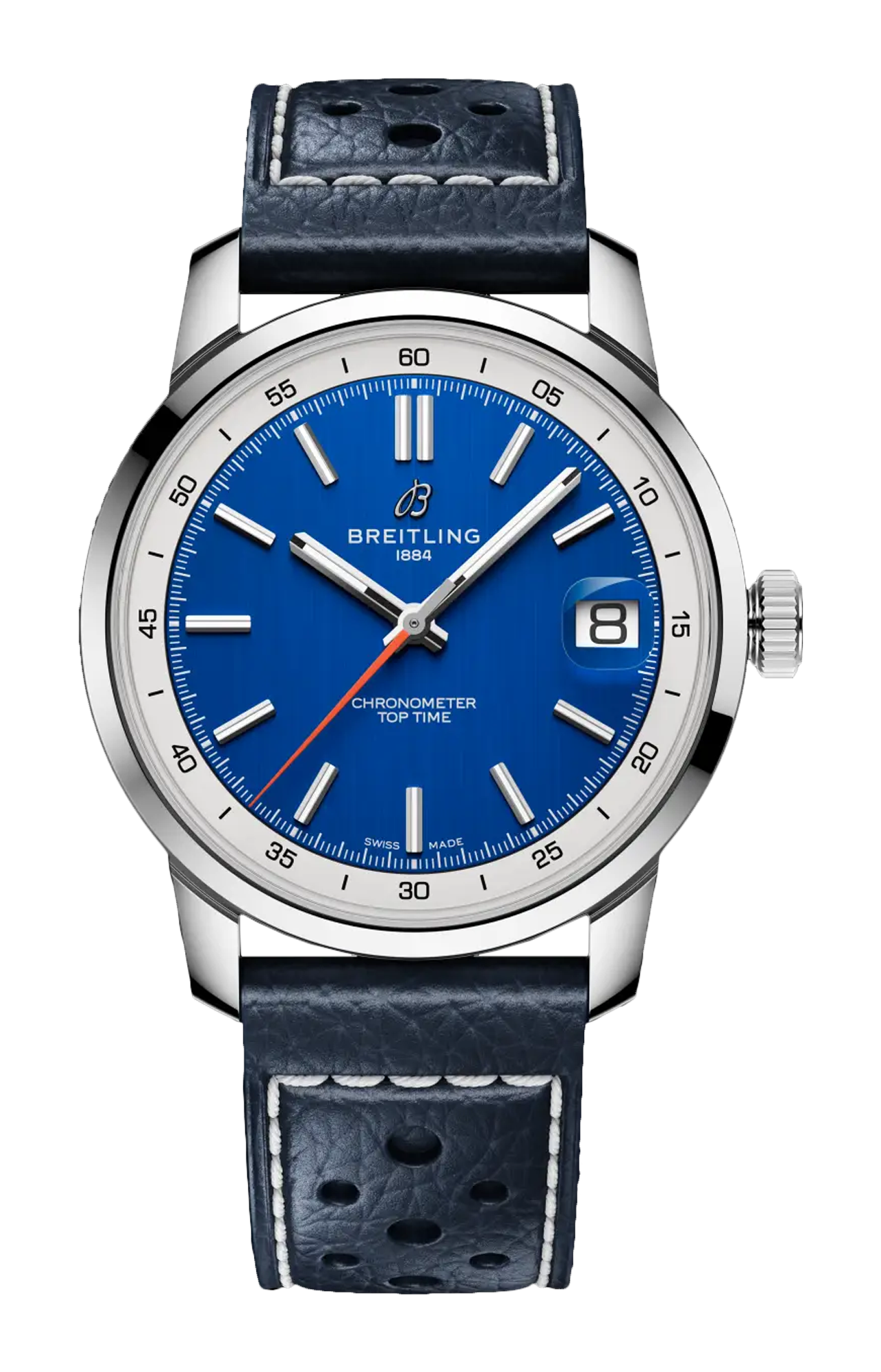 Il Top Time B31, novità del 2025, segna il debutto del movimento di manifattura Breitling B31. La cassa da 38 mm, fedele al DNA della linea, gli conferisce uno stile impeccabile, adatto a qualsiasi polso. Il Top Time B31 combina l'estetica retrò con il fascino contemporaneo. Il quadrante trae ispirazione dai cruscotti delle auto d’epoca, mentre la cassa da 38 mm coniuga proporzioni vintage e design contemporaneo, in una dimensione universale perfetta per qualsiasi polso. Il modello è disponibile in tre diverse colorazioni—verde, blu o bicolore bianco e azzurro—con bracciale in acciaio a tre file o cinturino in pelle di vitello traforata ispirato ai guanti da corsa. Dai viaggi on the road alla vita quotidiana, il Top Time B31 rende omaggio all’individualità e all’avventura, sempre e dovunque.