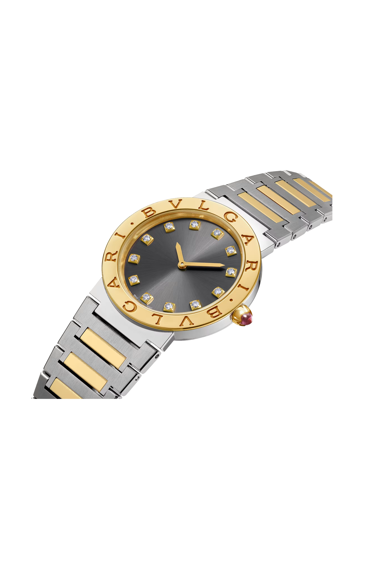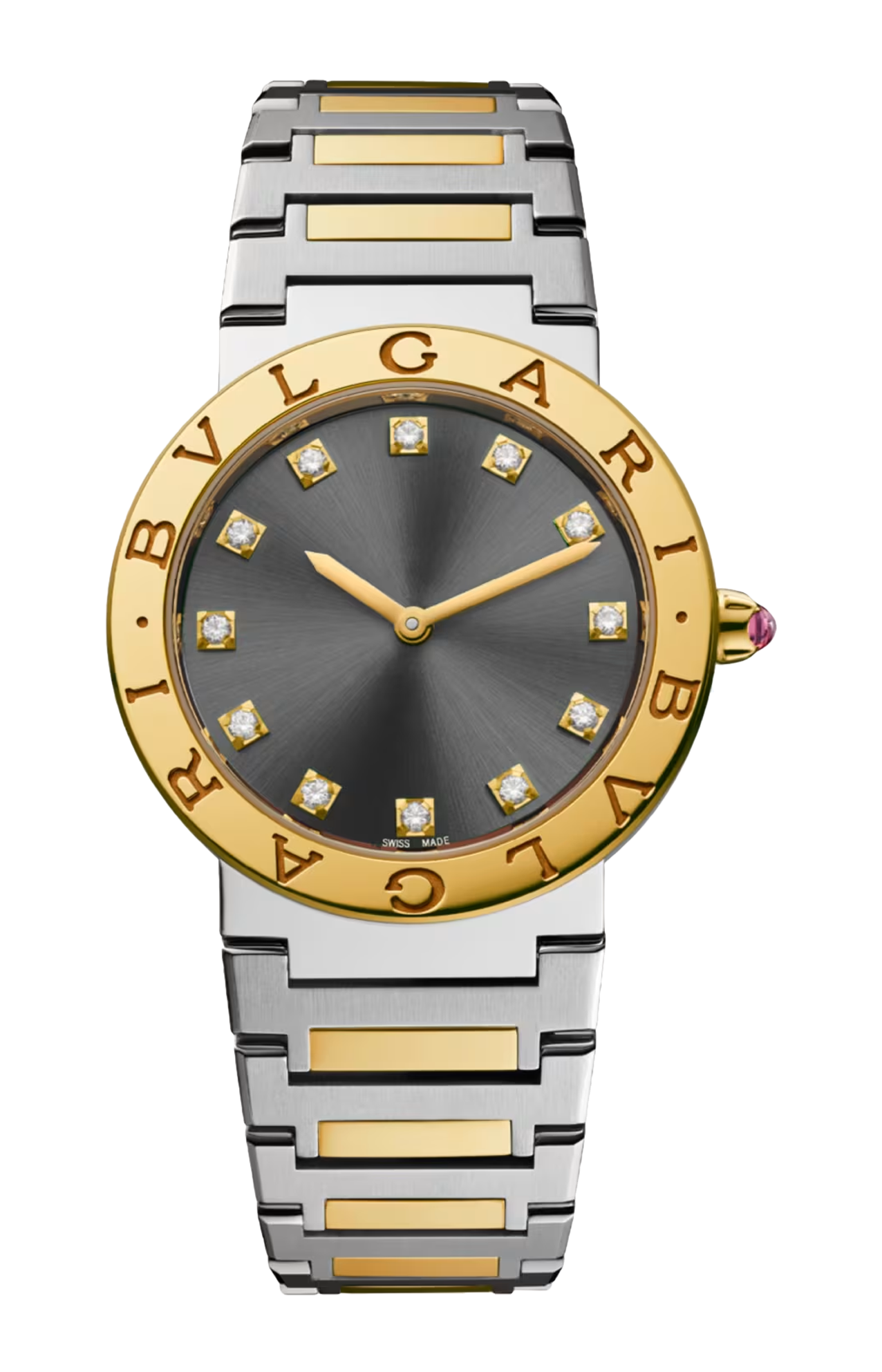Orologio BVLGARI BVLGARI con movimento al quarzo, funzioni ore e minuti, calibro B043 con logo BVLGARI, cassa di 33 mm in acciaio inossidabile, lunetta in oro giallo 18 kt con doppio logo, quadrante soleil antracite, indici con 12 diamanti, corona in oro giallo 18 kt con rubellite rosa taglio cabochon e bracciale con fibbia déployante in oro giallo 18 kt e acciaio inossidabile lucido e satinato-spazzolato. Impermeabile fino a 30 metri.
