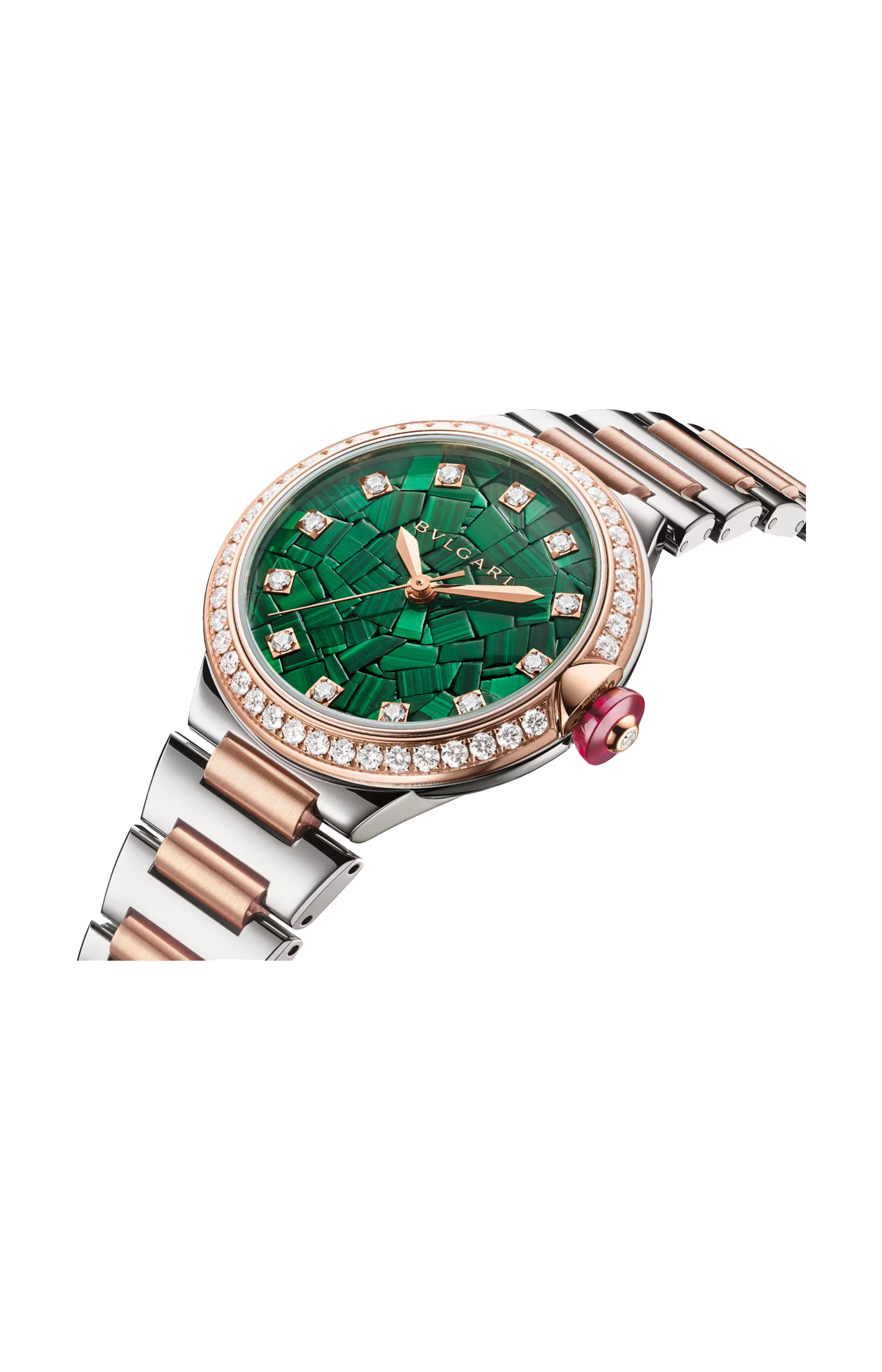 Simbolo di una femminilità moderna e radiosa, l’orologio LVCEA dona un tocco di glamour allo stile di ogni giorno. Infuso di eccezionale maestria artigianale, quest'orologio con cassa in acciaio lucido e lunetta in oro rosa 18 kt con diamanti è un emblema dell’eccellenza di BVLGARI nell’arte della gioielleria e dell'orologeria. Adornato da indici con diamanti, il quadrante tridimensionale si compone di elementi in malachite verde, singolarmente assemblati a mano in un prezioso intarsio. A completare il modello, un bracciale in oro rosa 18 kt e acciaio lucido e satinato-spazzolato.