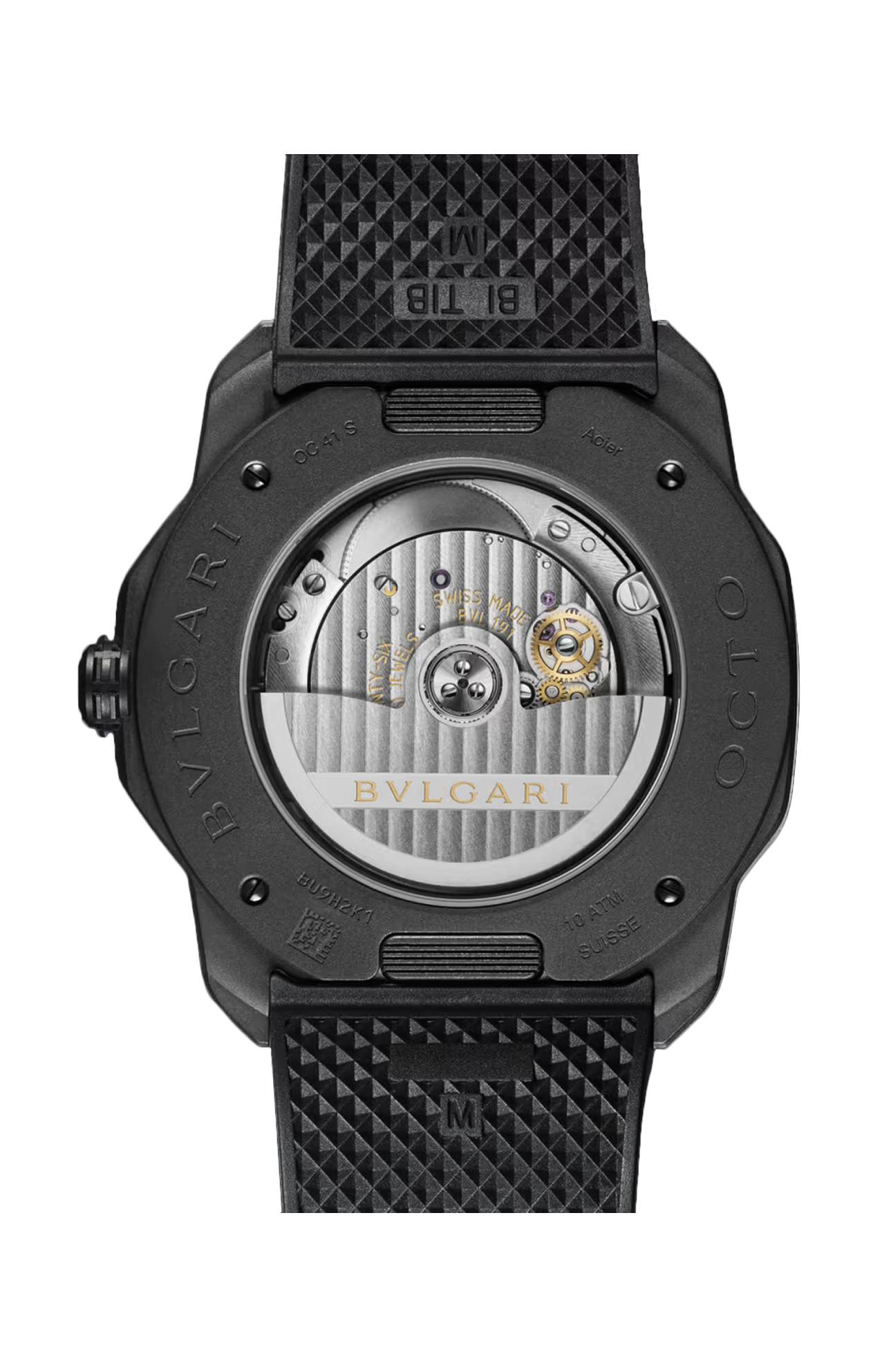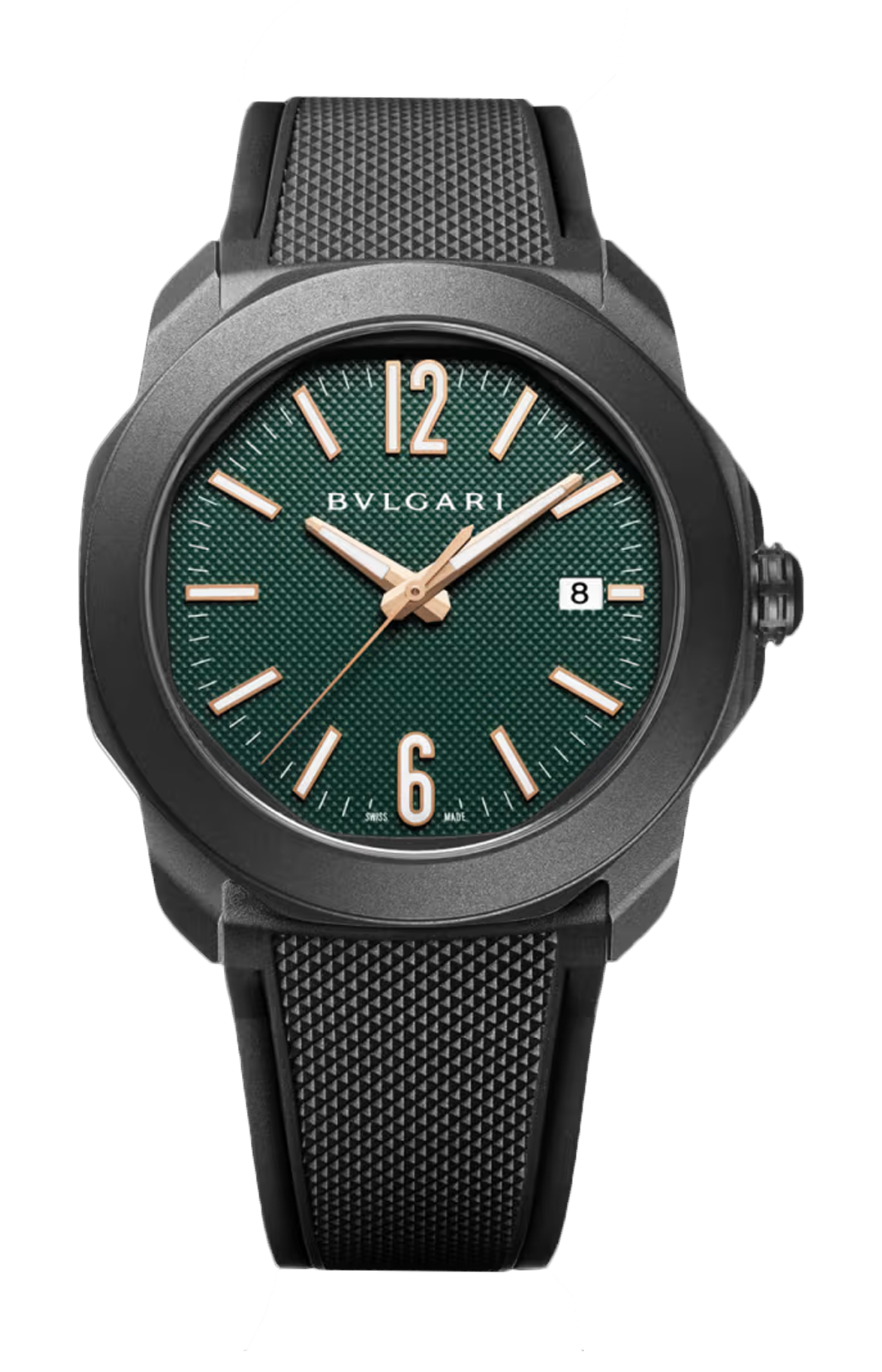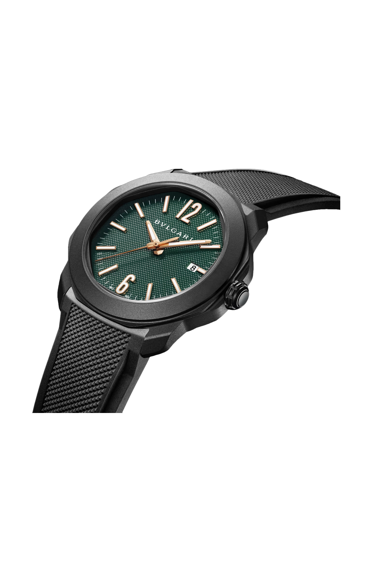Con la sua accattivante cassa ottagonale rotonda ma non rotonda, l'orologio Octo Roma Special Edition in acciaio inossidabile con trattamento DLC nero è un emblema di stile contemporaneo che unisce l'ispirazione romana al design italiano e all'esperienza orologiera svizzera. Integrando un motivo di alta orologeria nel cuore della sua estetica distintiva, l'orologio presenta una finitura Clous de Paris sul quadrante verde, completata da lancette e indici Super-Luminova® per una leggibilità ottimale e un effetto visivamente accattivante. L'orologio è completato da un bracciale in gomma nera e da un ulteriore cinturino intercambiabile in gomma verde. Orologio Octo Roma con movimento meccanico di manifattura, carica automatica, ore, minuti, secondi centrali e funzioni data, calibro BVL191. Cassa in acciaio inossidabile da 41 mm con trattamento diamond like carbon, quadrante verde Clous de Paris, indici e lancette dorati riempiti di Super-Luminova®, apertura della data a ore 3, acciaio inossidabile con corona a vite DLC con sistema di protezione, bracciale intercambiabile in gomma nera e bracciale aggiuntivo in gomma verde con fibbia ad ardiglione rivestita in DLC nero. Resistente all'acqua fino a 100 metri.