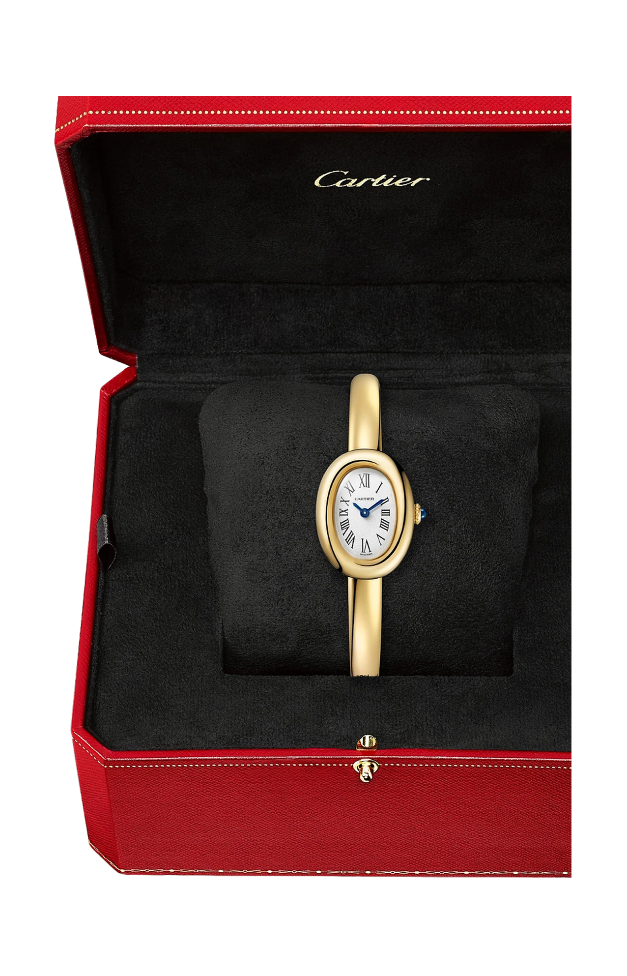 Orologio Baignoire de Cartier, modello mini, misura 17, movimento al quarzo. Cassa in oro giallo 750/1000. Corona perlata in oro giallo 750/1000 ornata di uno zaffiro cabochon. Quadrante argentato, lancette a forma di gladio d’acciaio azzurrato, vetro zaffiro. Bracciale rigido in oro giallo 750/1000. Dimensioni della cassa 24,6 x 18,7 mm, spessore 7,2 mm. Impermeabile fino a 30 metri.