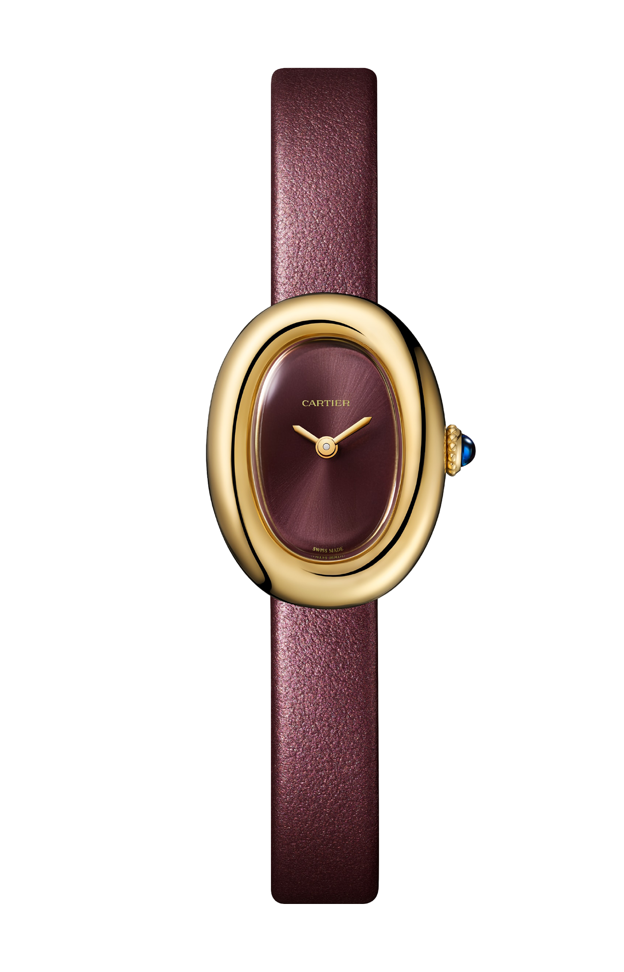 Orologio Baignoire de Cartier, modello mini, movimento al quarzo. Cassa in oro giallo 750/1000. Corona perlata in oro giallo 750/1000 ornata di uno zaffiro cabochon. Quadrante laccato coloro prugna, lancette a forma di gladio in acciaio finitura dorata, vetro zaffiro. Cinturino in pelle di vitello satinata color prugna, fibbia ad ardiglione in oro giallo 750/1000. Dimensioni della cassa 24,6 x 18,7 mm, spessore 7,2 mm. Impermeabile fino a 30 metri.