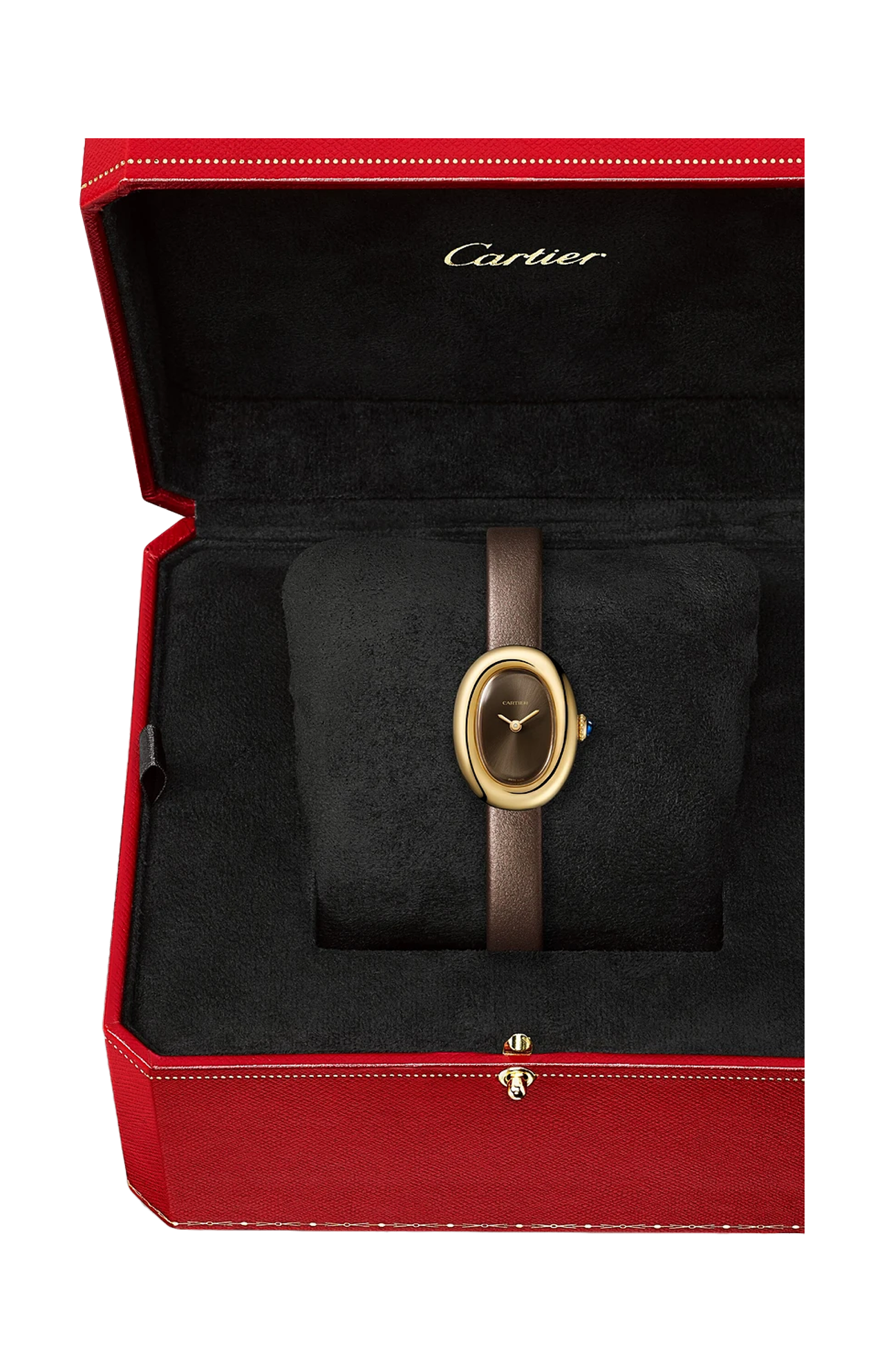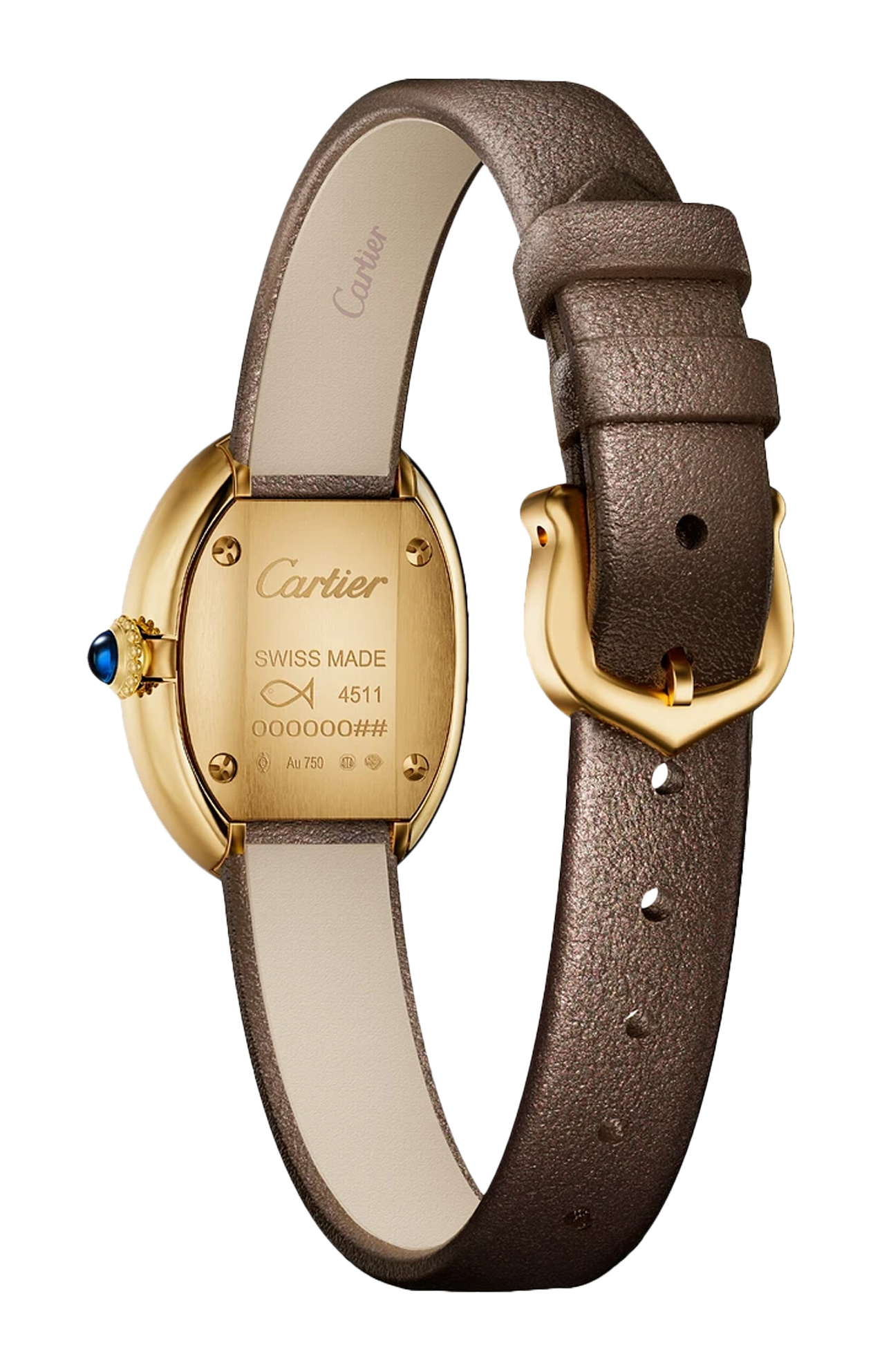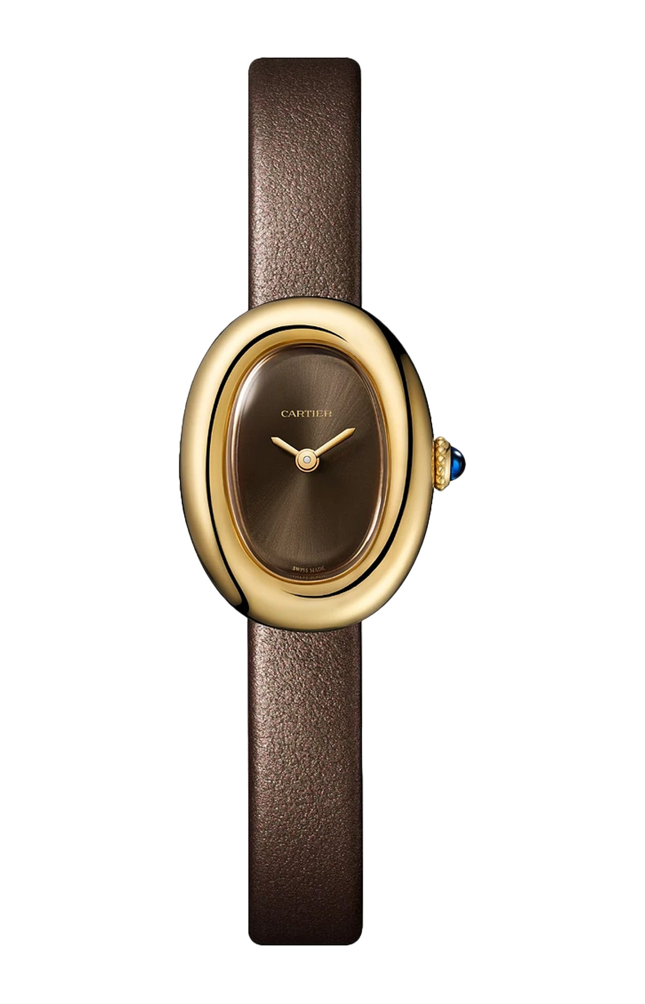 Orologio Baignoire de Cartier, modello mini, movimento al quarzo. Cassa in oro giallo 750/1000. Corona perlata in oro giallo 750/1000 ornata di uno zaffiro cabochon. Quadrante laccato color bronzo, lancette a forma di gladio in acciaio finitura dorata, vetro zaffiro. Cinturino in pelle di vitello satinata bronzo, fibbia ad ardiglione in oro giallo 750/1000. Dimensioni della cassa 24,6 x 18,7 mm, spessore 7,2 mm. Impermeabile fino a 30 metri.