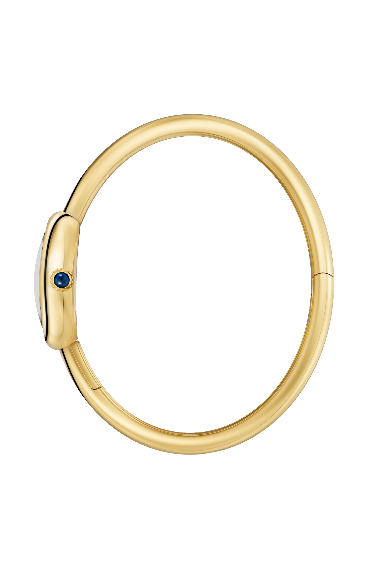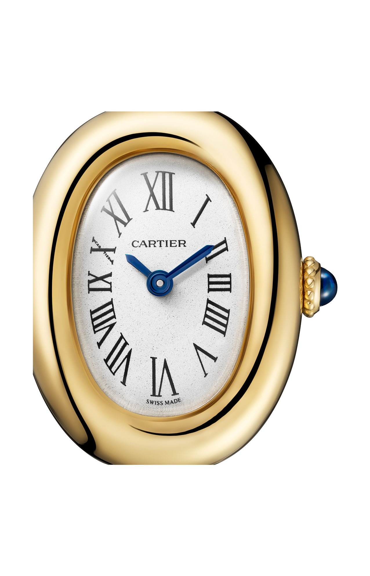Orologio Baignoire, modello mini, misura 15, movimento al quarzo. Cassa in oro giallo 18 carati (750/1000). Corona perlata in oro giallo 18 carati (750/1000) con cabochon in zaffiro. Bracciale rigido in oro giallo 18 carati (750/1000). Quadrante argentato, lancette a forma di gladio in acciaio azzurrato, vetro zaffiro. Lunghezza: 24,6 mm. Larghezza: 18,7 mm. Spessore: 7,2 mm. Impermeabile fino a 3 bar (circa 30 metri/100 piedi).