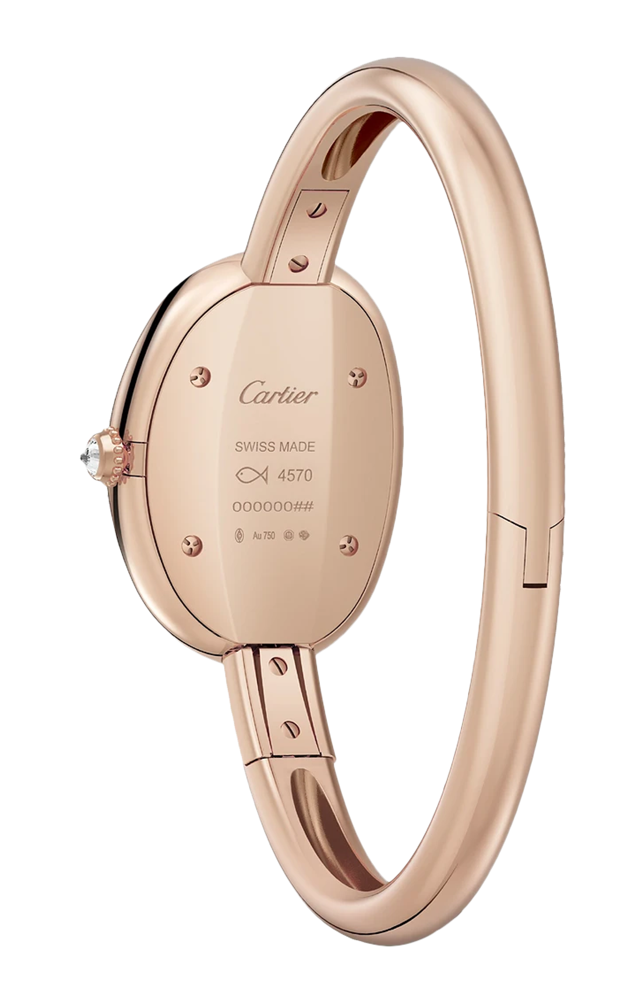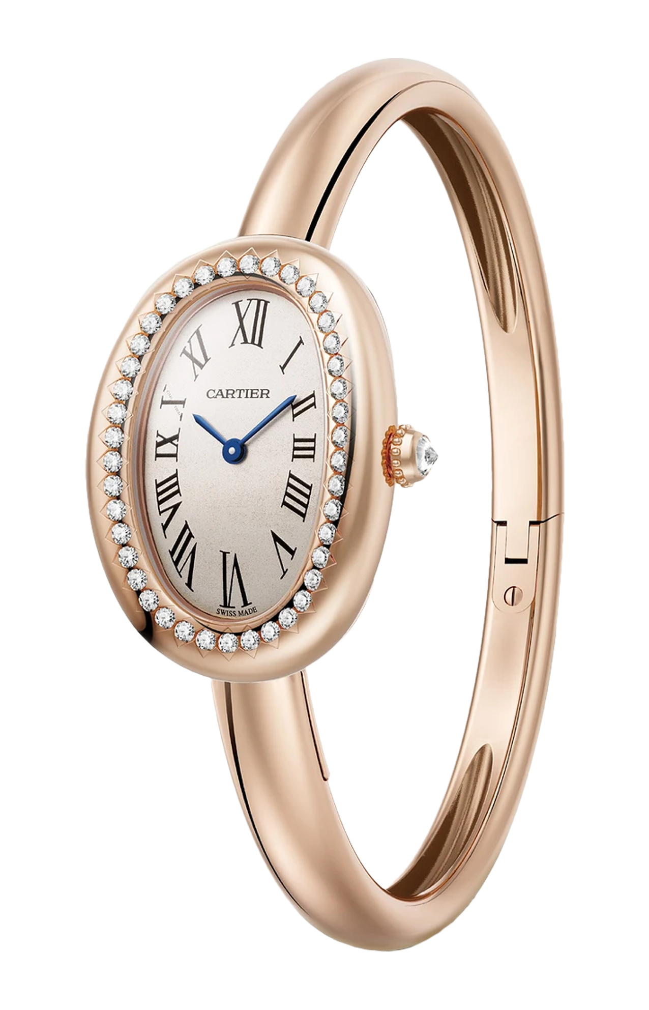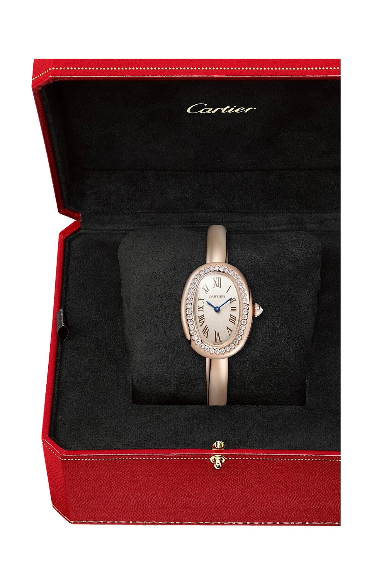 Orologio Baignoire de Cartier, modello piccolo, misura 15, movimento al quarzo. Cassa in oro rosa 750/1000 ornata di 42 diamanti taglio brillante (0,48 carati). Corona perlata in oro rosa 750/1000 ornata di un diamante (0,08 carati). Quadrante argentato, lancette a forma di gladio d’acciaio azzurrato, vetro zaffiro. Dimensioni della cassa 31,4 x 23,1 mm, spessore 6,9 mm. Impermeabile fino a 30 metri.