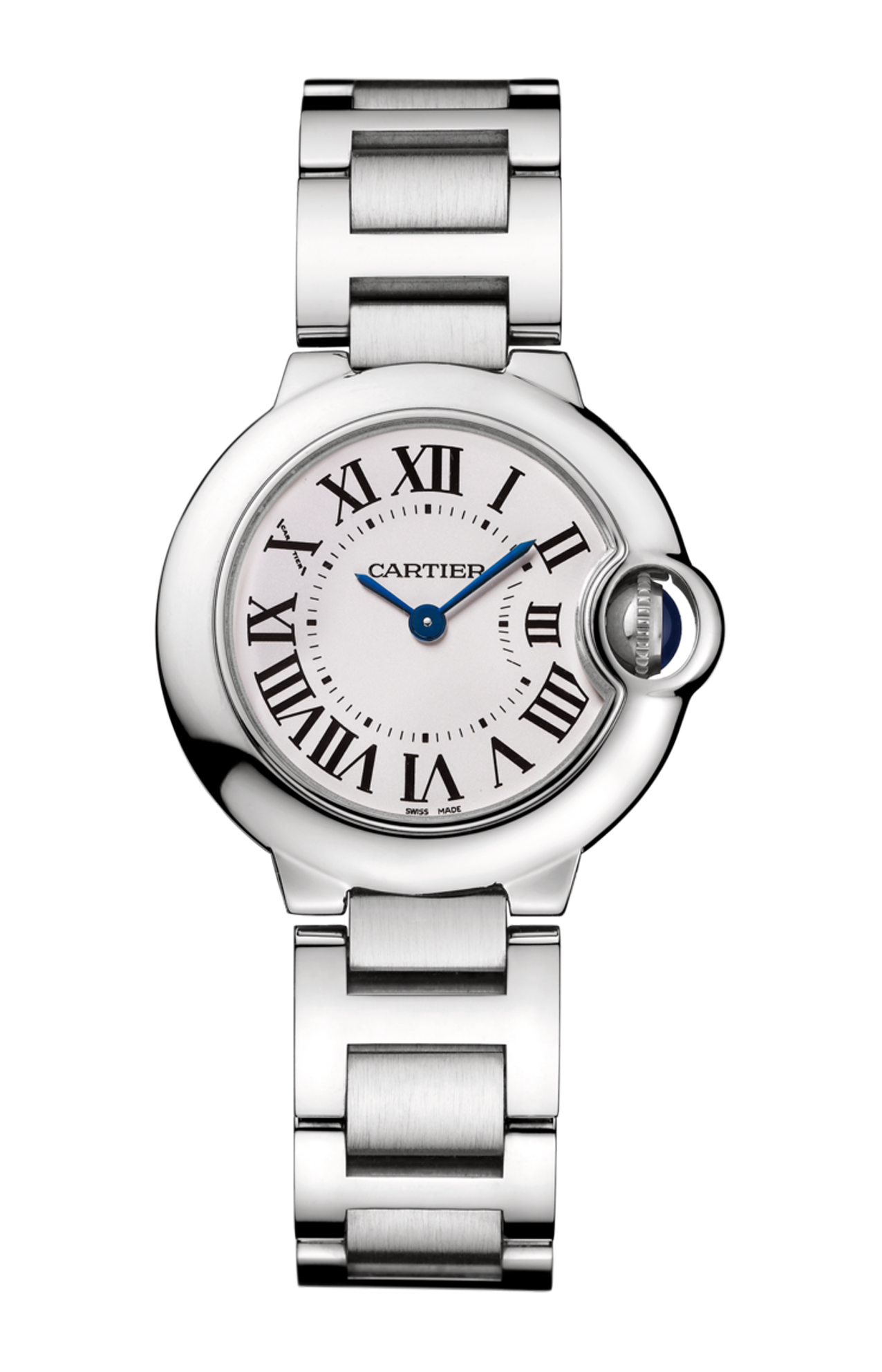 Orologio Ballon Bleu de Cartier, 28 mm, movimento al quarzo. Cassa in acciaio, corona scanalata ornata di uno spinello sintetico cabochon, quadrante opalino argentato, numeri romani, lancette a forma di gladio d’acciaio azzurrato, vetro zaffiro. Bracciale intercambiabile in acciaio. Dimensioni cassa: diametro 28,6 mm, spessore 9,35 mm. Impermeabile fino a 30 metri.