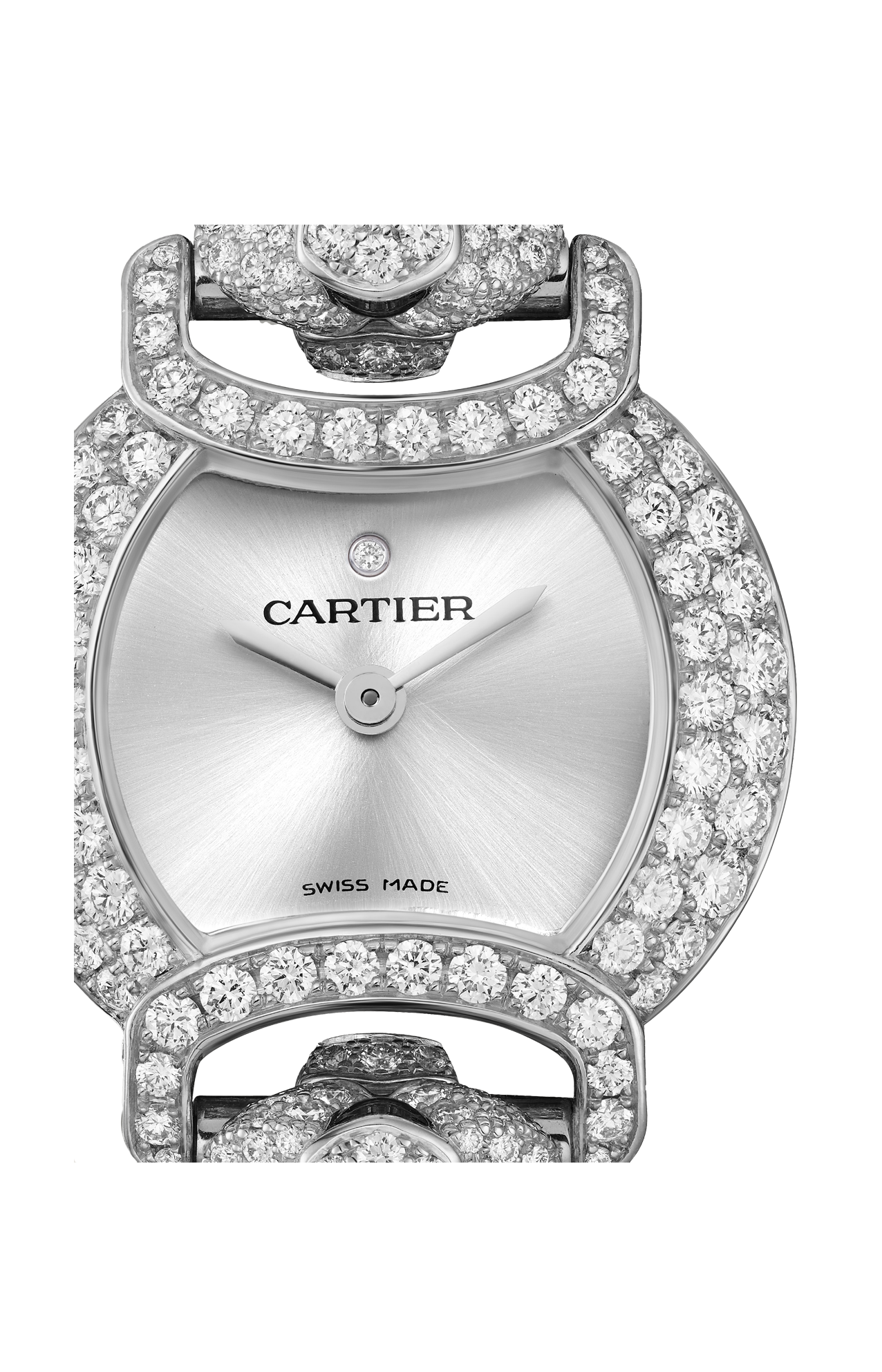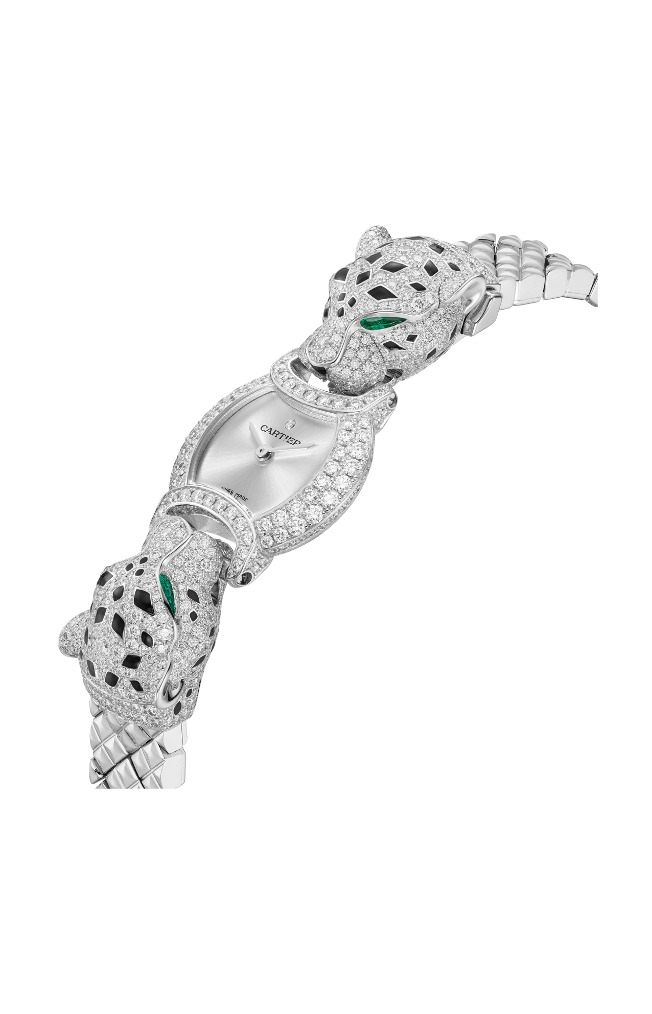 Orologio La Panthère, 22,2 mm, movimento al quarzo. Cassa in oro bianco rodiato 750/1000 ornata di 128 diamanti taglio brillante (1,08 carati), teste di pantera in oro bianco rodiato 750/1000 ornata di 572 diamanti taglio brillante (2,76 carati), occhi di smeraldo forma poire (0,30 carati), macchie e naso in lacca nera, quadrante argentato, lancette a forma di gladio in acciaio rodiato, bracciale in oro bianco rodiato 750/1000. Spessore della cassa 7,55 mm. Impermeabile fino a 30 metri.
